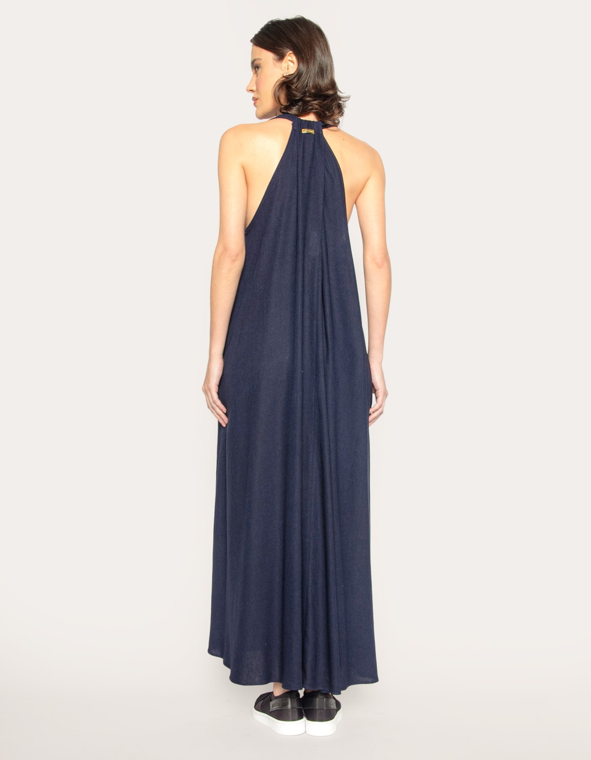 Vestido longo com modelagem ampla, decote V profundo, cava generosa e dois bolsos laterais funcionais.