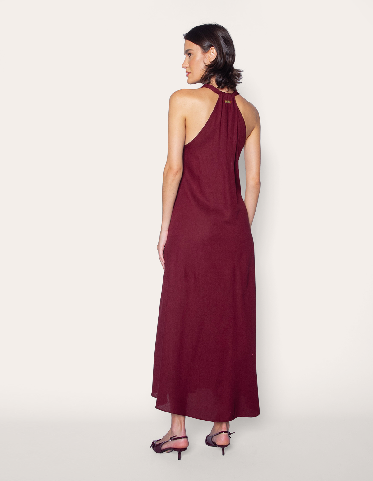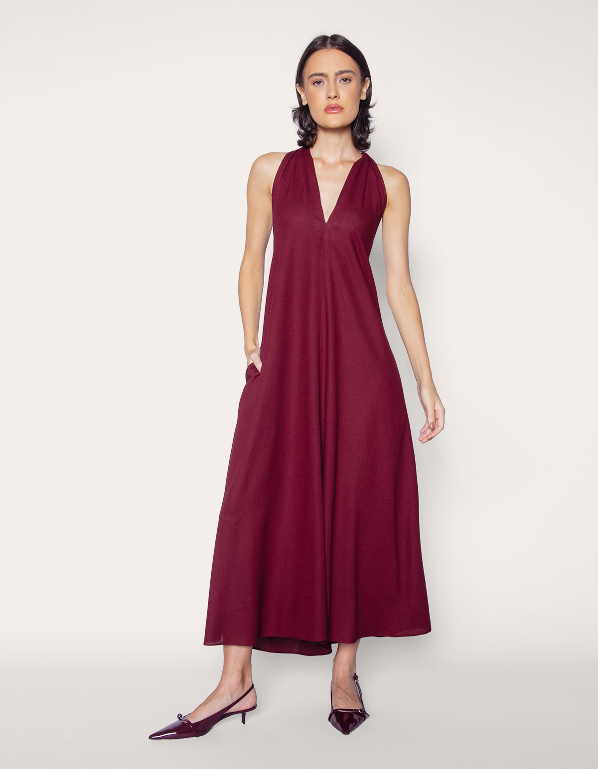 Vestido longo com modelagem ampla, decote V profundo, cava generosa e dois bolsos laterais funcionais.