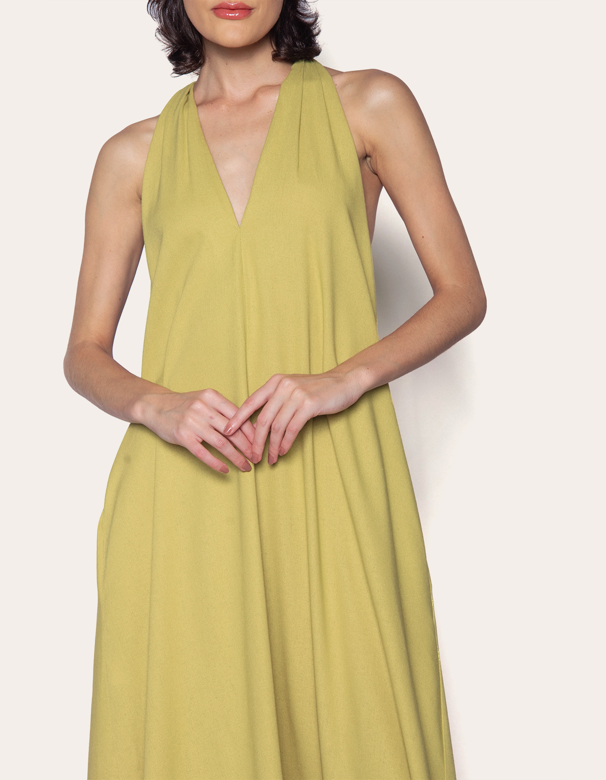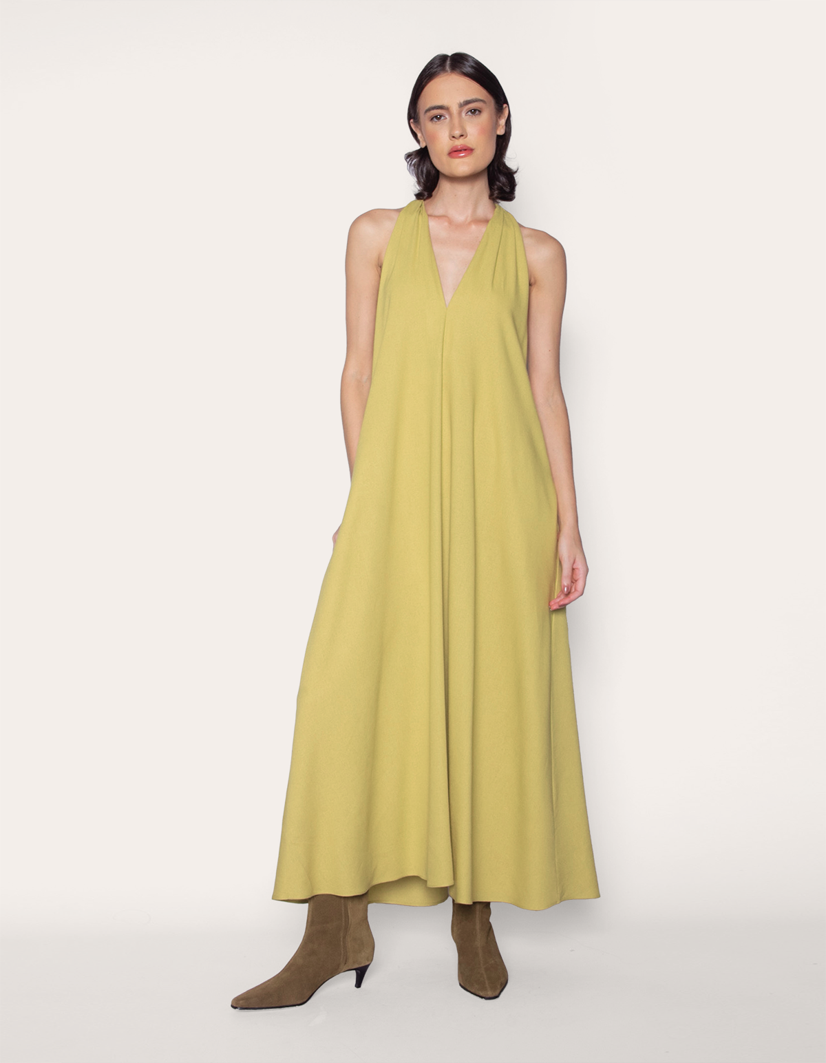 Vestido longo com modelagem ampla, decote V profundo, cava generosa e dois bolsos laterais funcionais.
