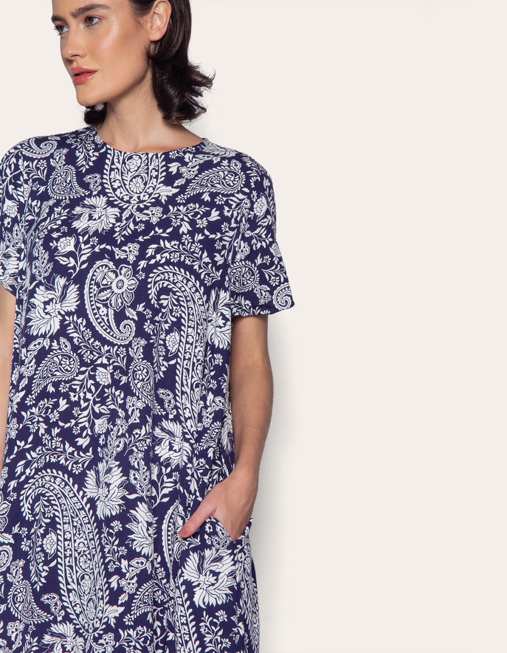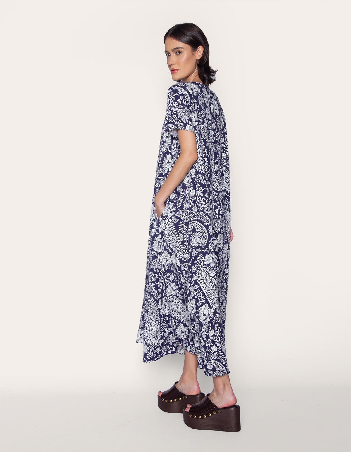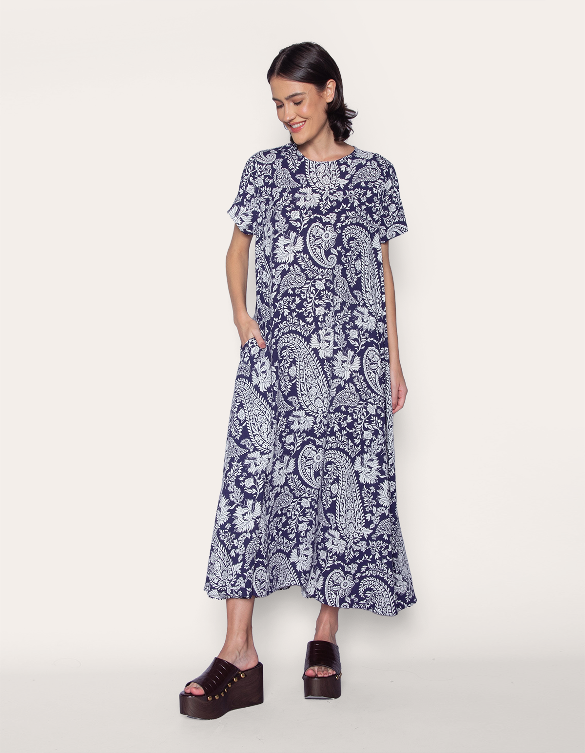 Vestido longo, manga curta, possui modelagem ampla que traz muito volume e movimento e leveza a peça.