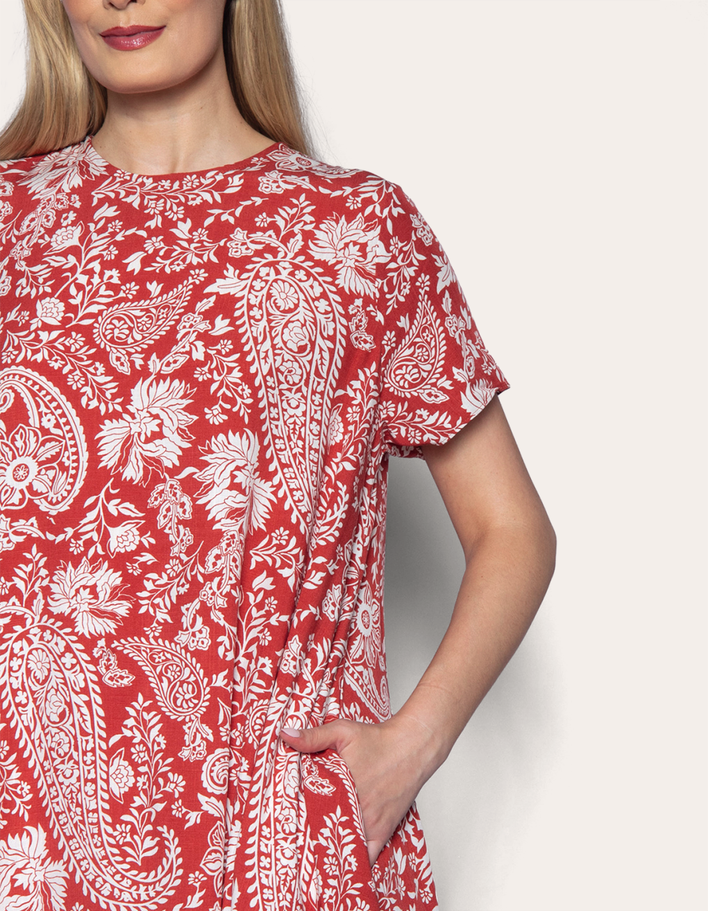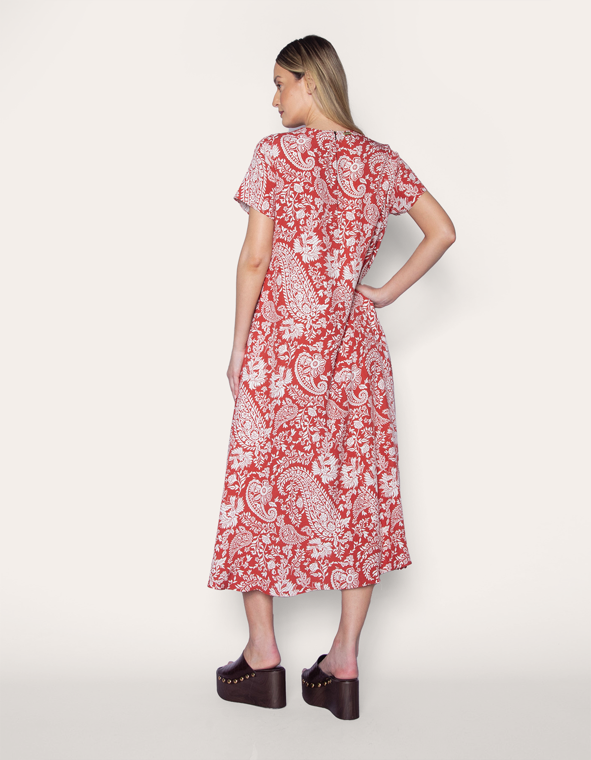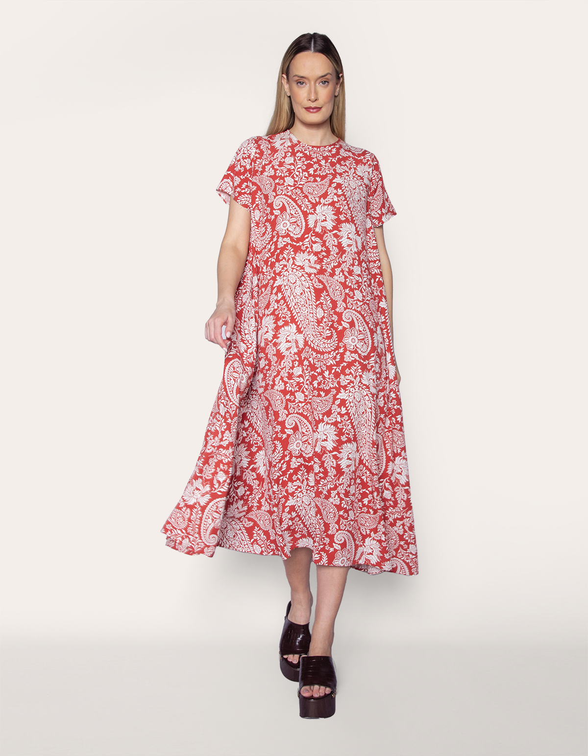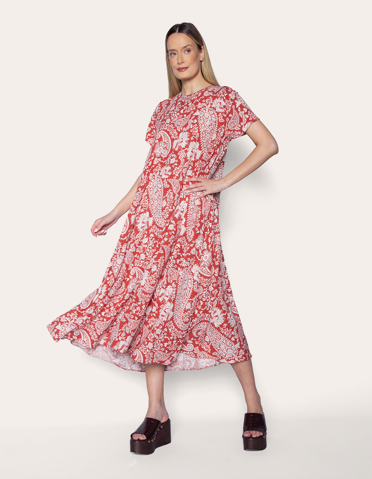 Vestido longo, manga curta, possui modelagem ampla que traz muito volume e movimento e leveza a peça.