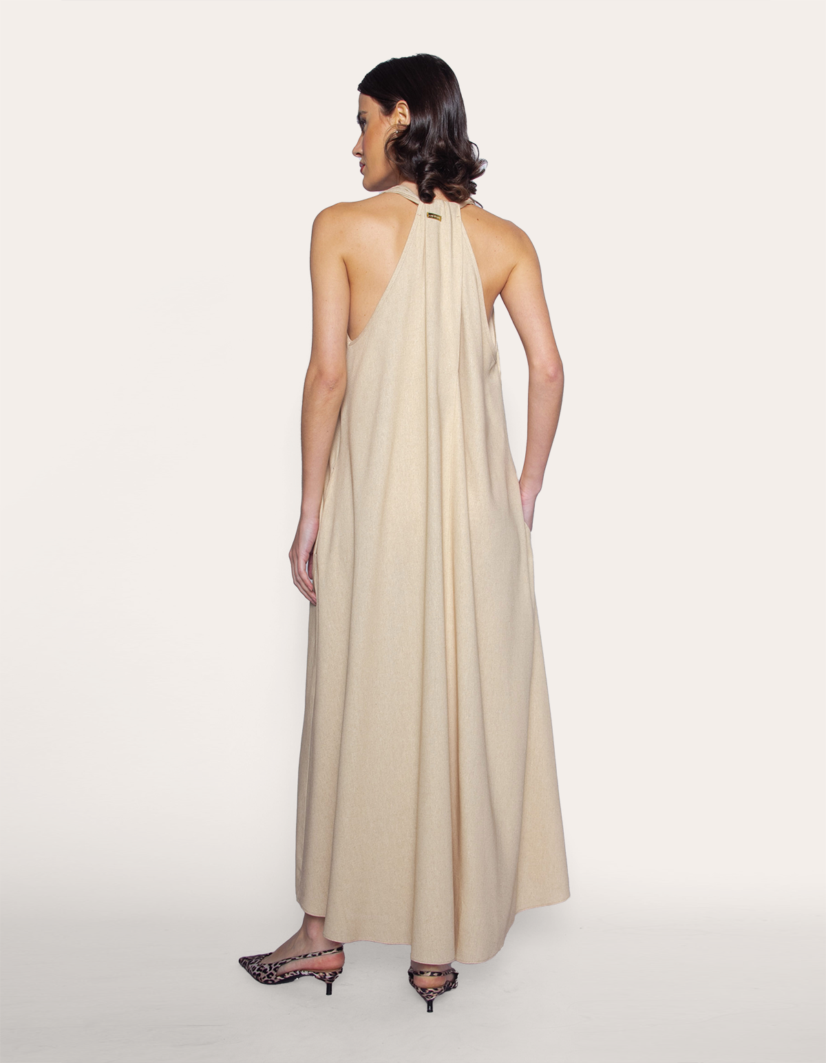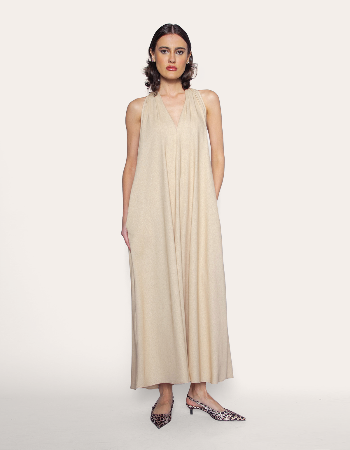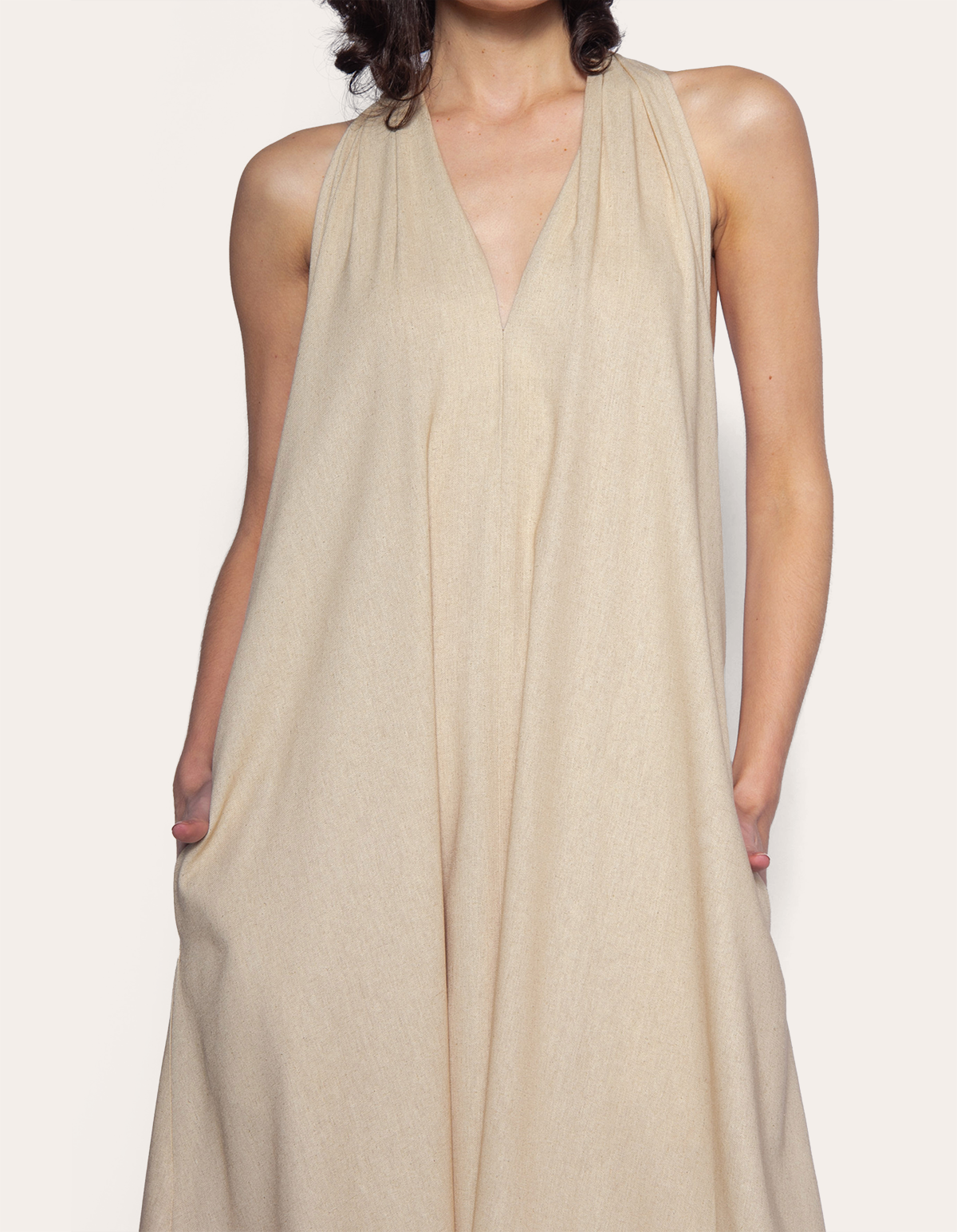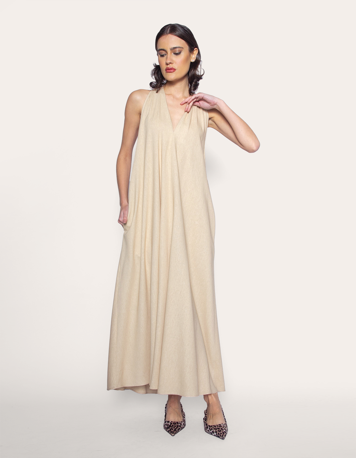Vestido longo com modelagem ampla, decote V profundo, cava generosa e dois bolsos laterais funcionais.