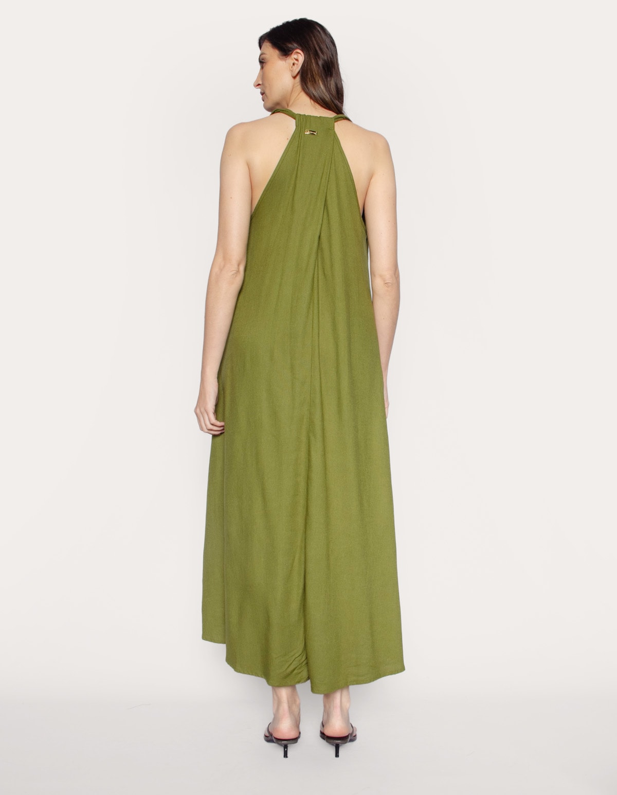 Vestido longo com modelagem ampla, decote V profundo, cava generosa e dois bolsos laterais funcionais.