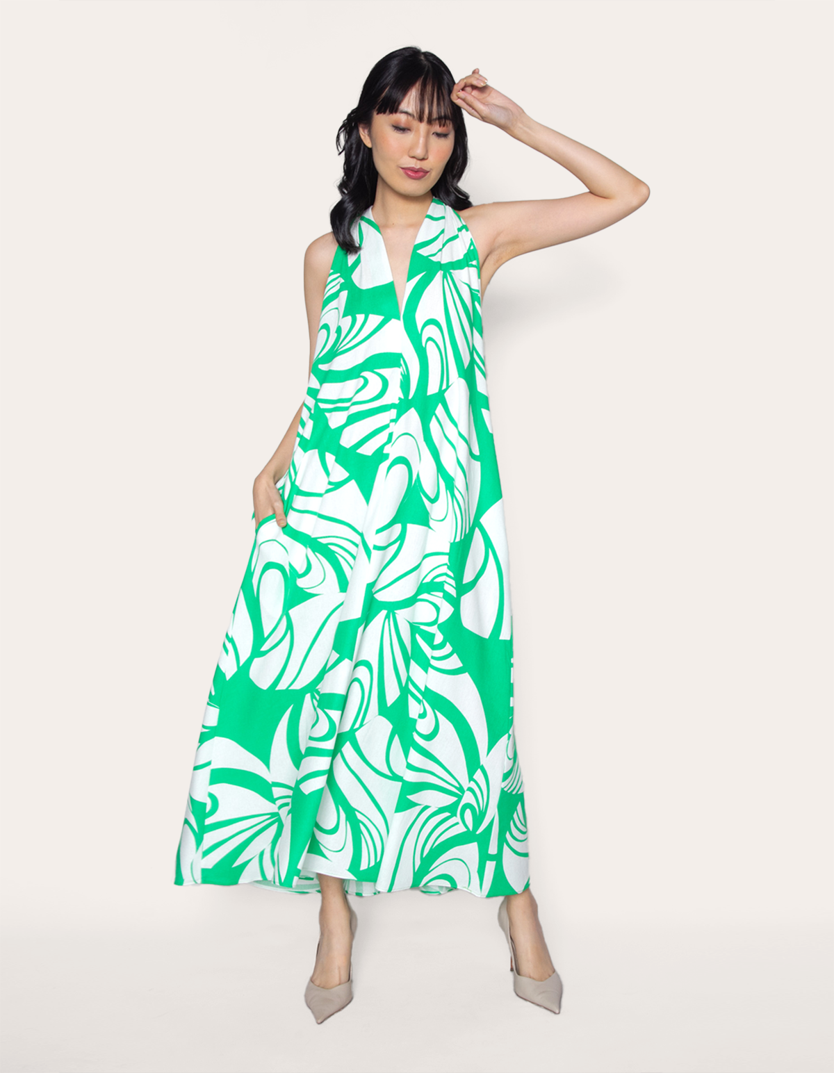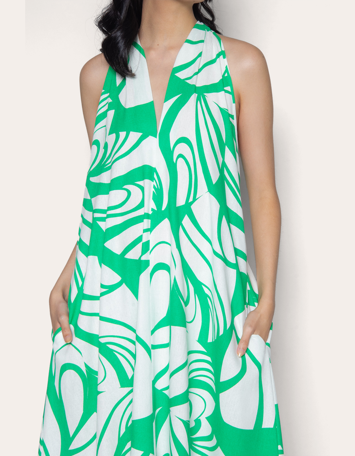 Vestido longo modelagem ampla, cavado, decote v e com 2 bolsos nas laterais. descubra a sofisticação atemporal do nosso vestido de viscolinho, perfeito para quem busca um visual elegante e prático para o dia a dia ou ocasiões especiais.