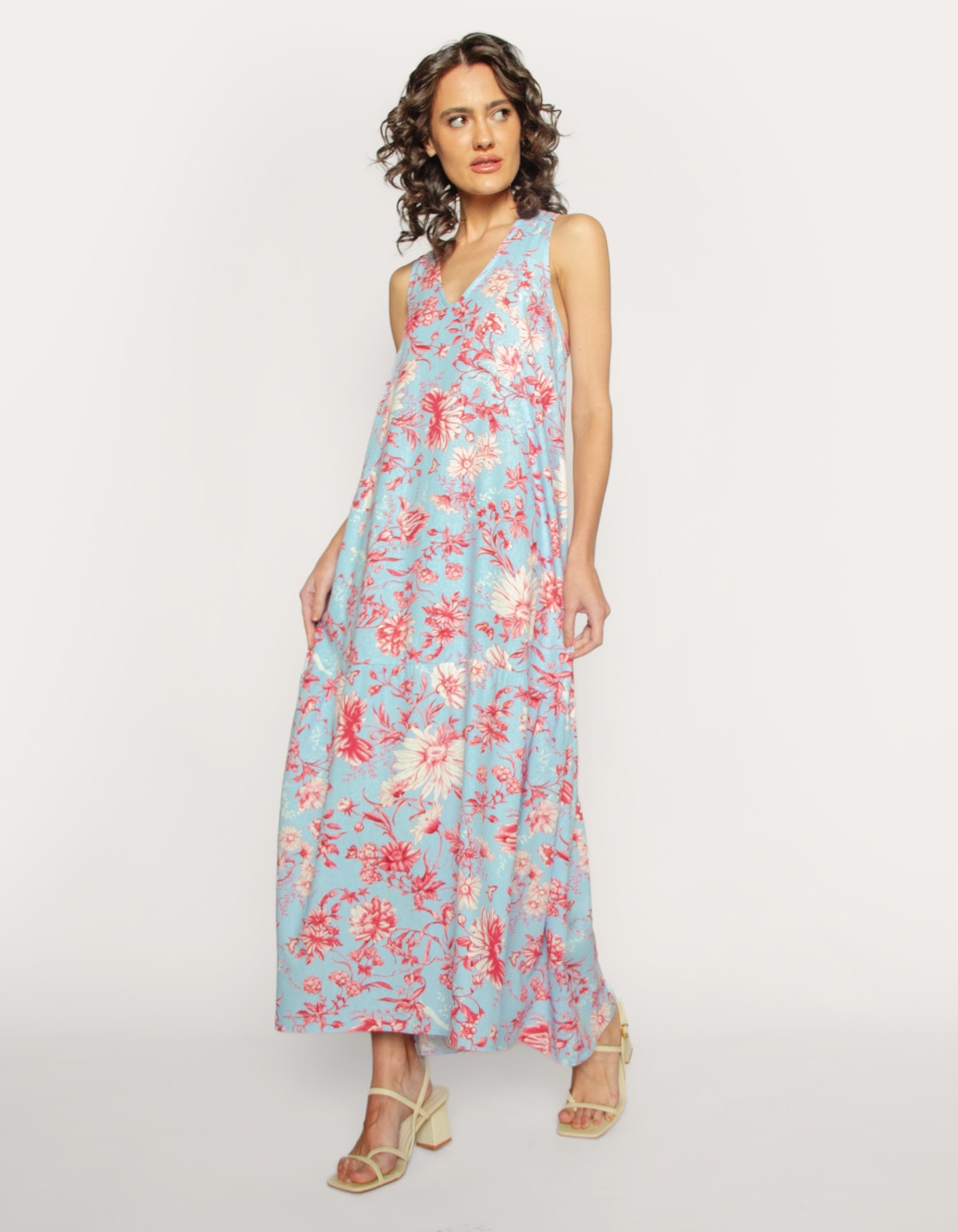 Vestido longo, decote v, cavado, modelagem ampla. Uma peça que combina conforto e sofisticação, ideal para um visual leve e elegante.