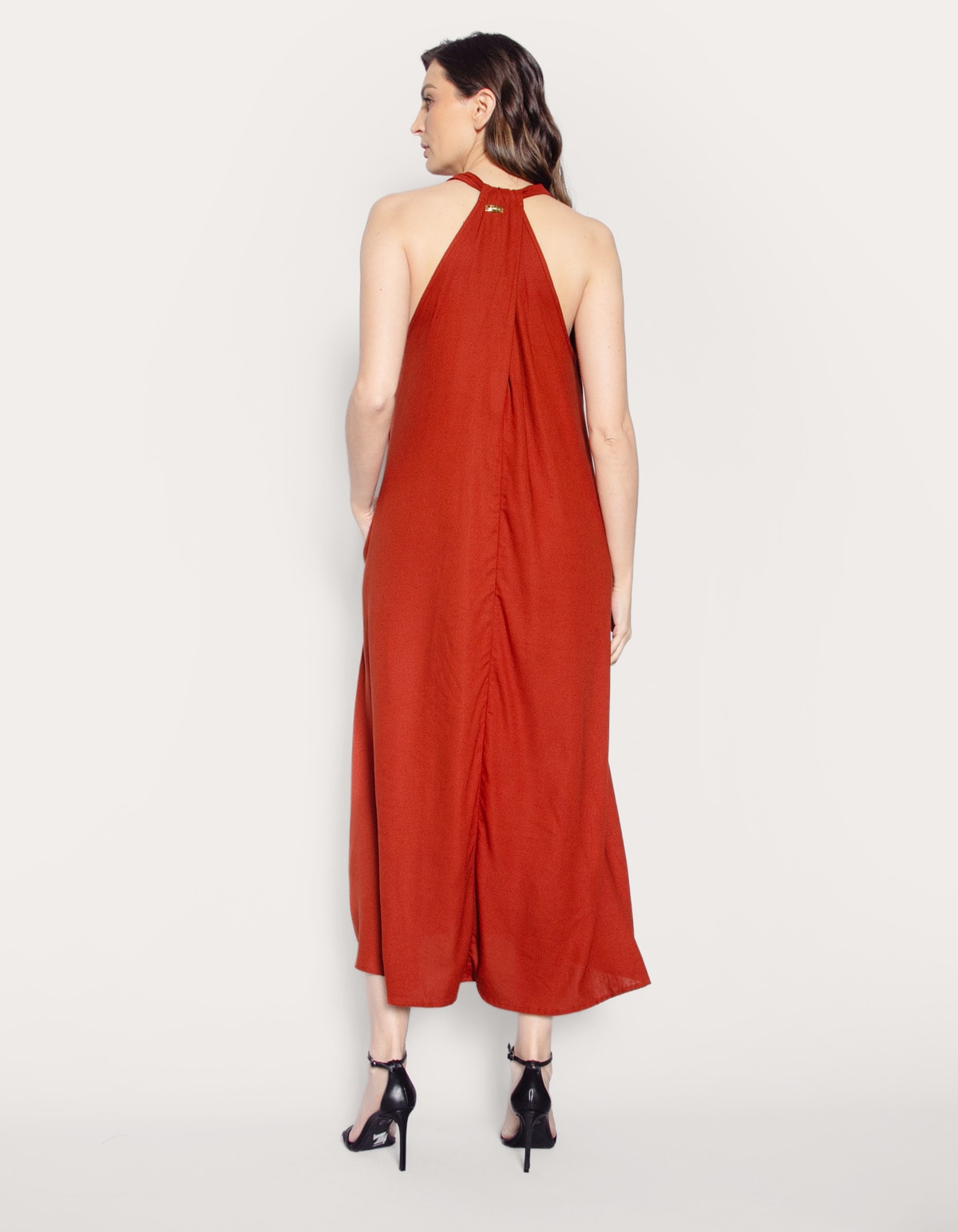 Vestido longo com modelagem ampla, decote V profundo, cava generosa e dois bolsos laterais funcionais.