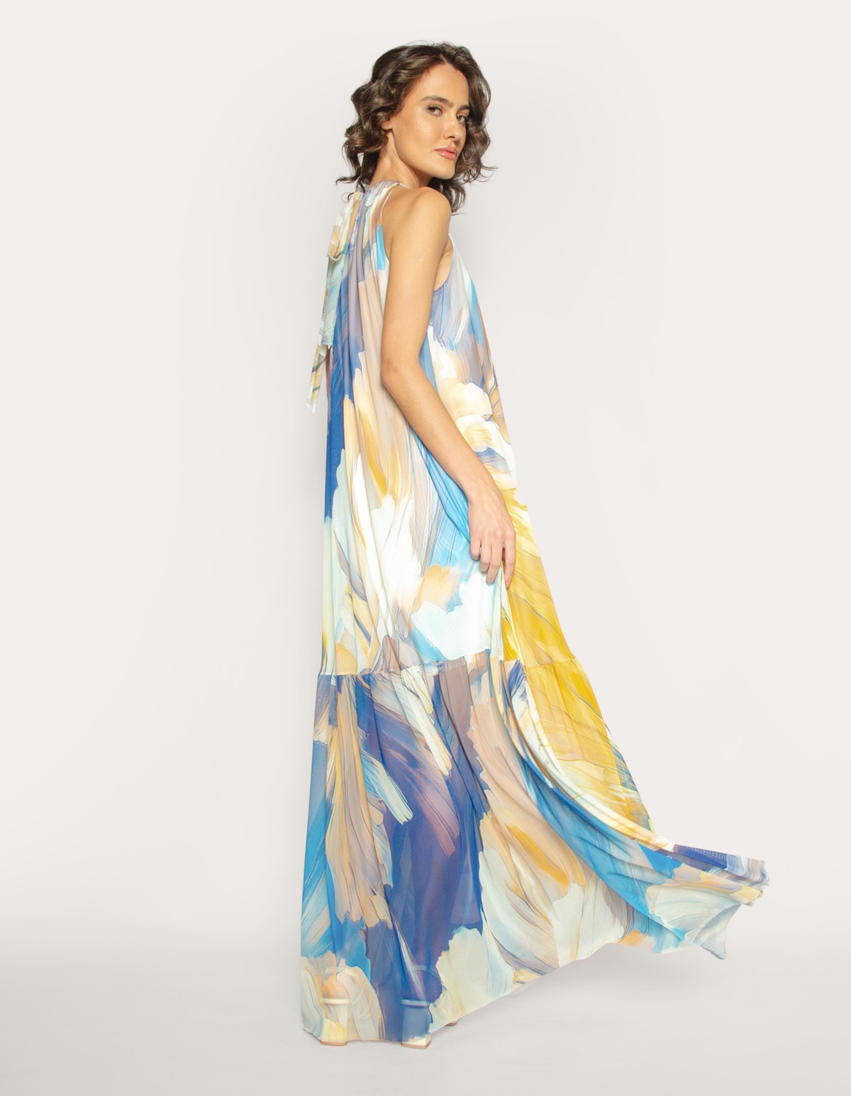 O vestido longo “Aura” aposta em leveza e versatilidade como proposta principal. Confeccionado em tule, o modelo acompanha faixa que permite diferentes formas de uso, valorizando a criatividade e o styling pessoal.