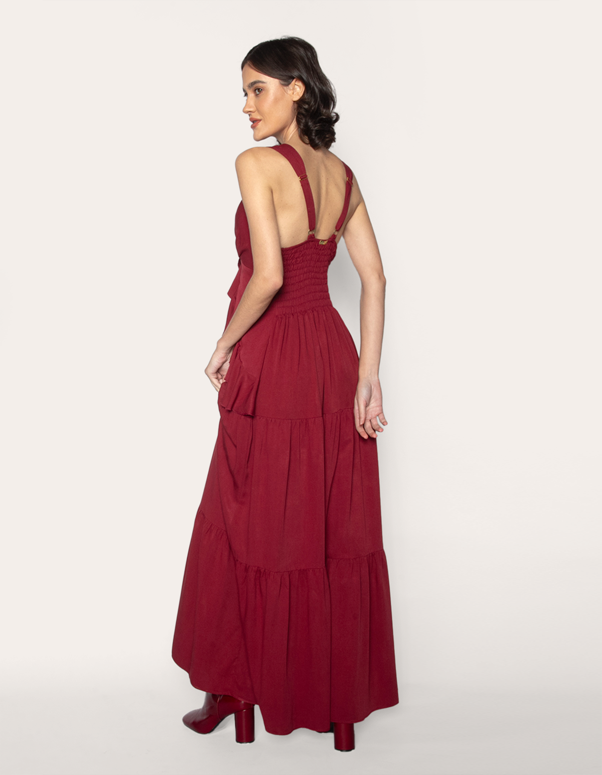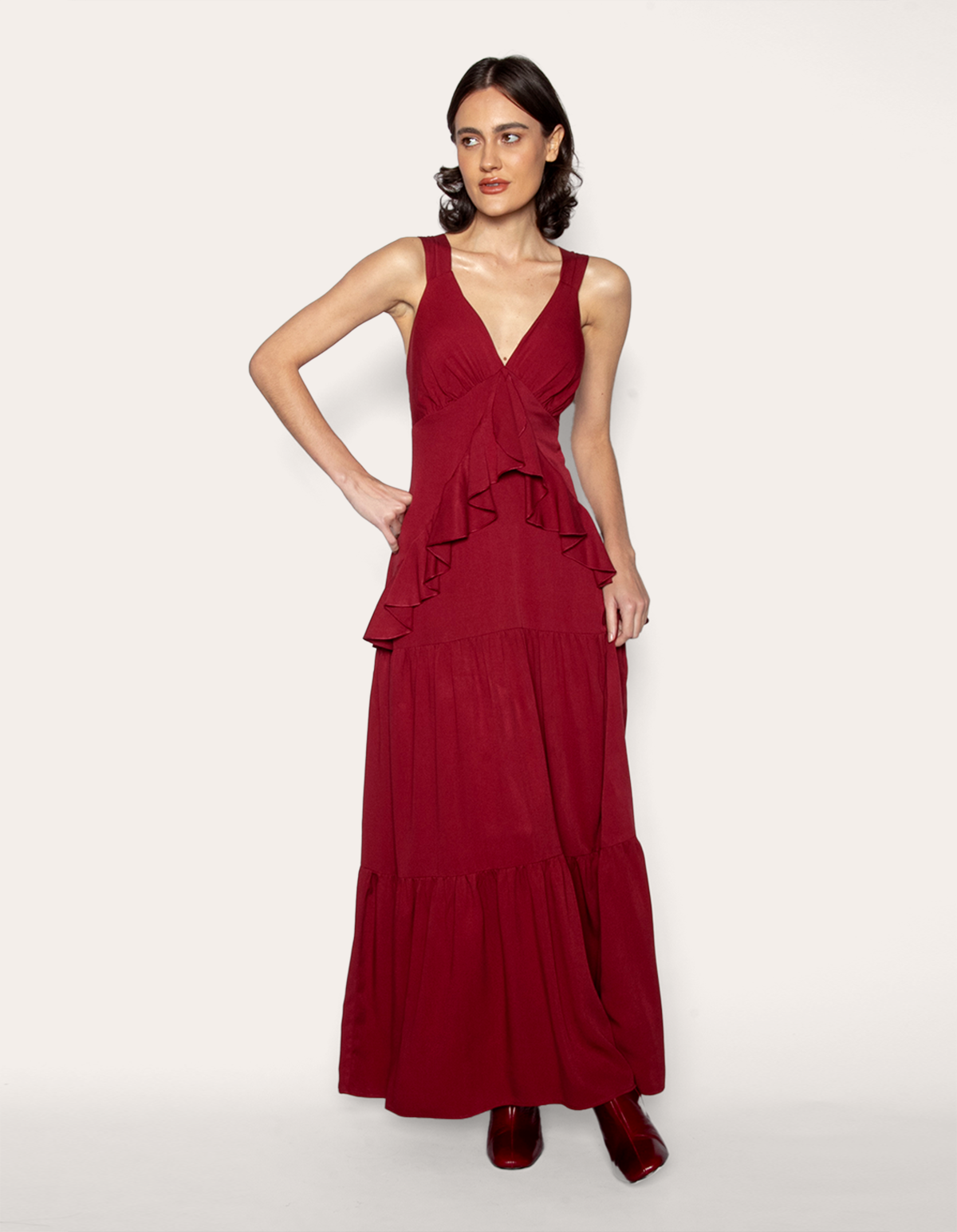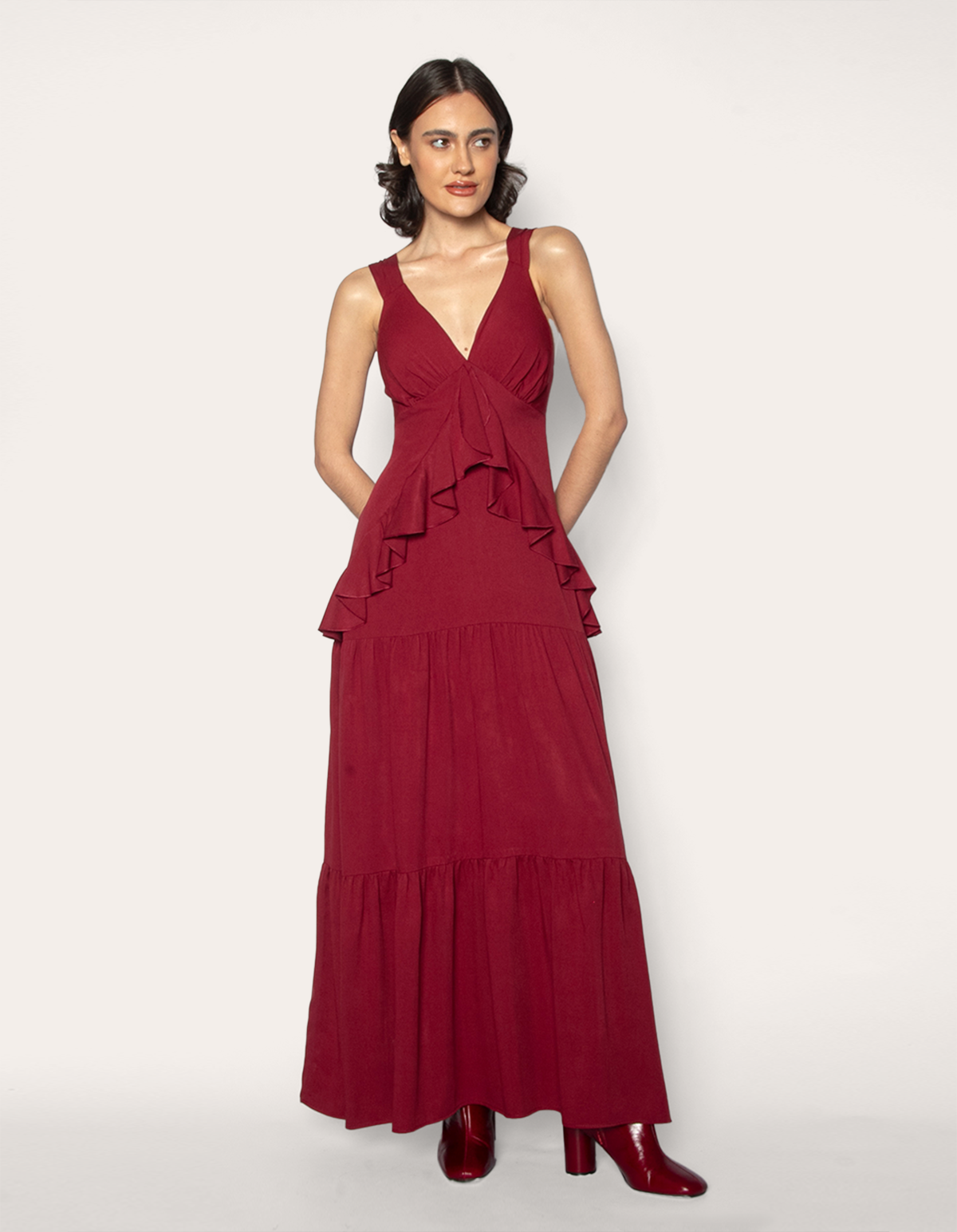 Vestido longo, alça média com regulador, cavado, com bojo, possui lastex nas costas e detalhes de babados na frente. no estilo boho chic repaginado, feminino e moderno esse vestidotraz um caimento fluido e elegante, com babados delicados é perfeito para eventos especiais ou para quem ama um visual imponente e feminino.