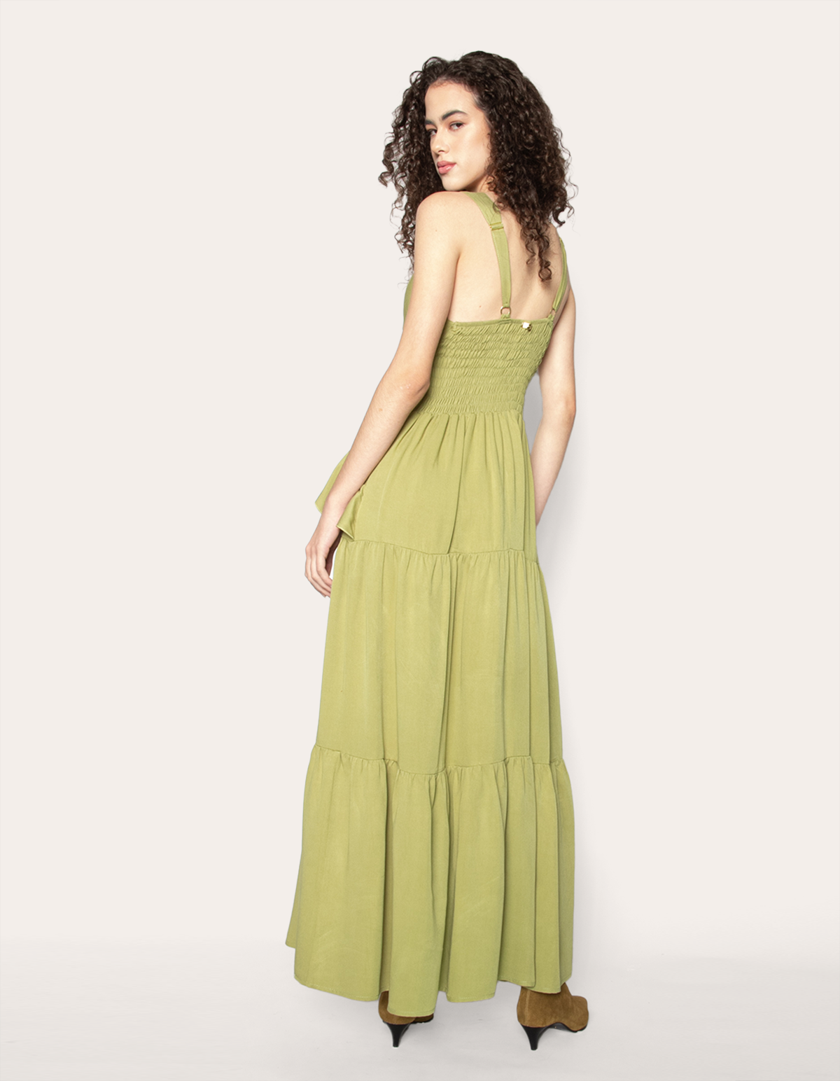 Vestido longo, alça média com regulador, cavado, com bojo, possui lastex nas costas e detalhes de babados na frente. no estilo boho chic repaginado, feminino e moderno esse vestidotraz um caimento fluido e elegante, com babados delicados é perfeito para eventos especiais ou para quem ama um visual imponente e feminino.