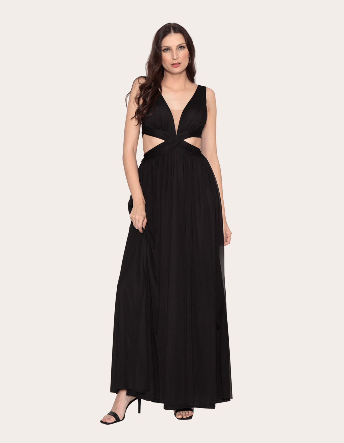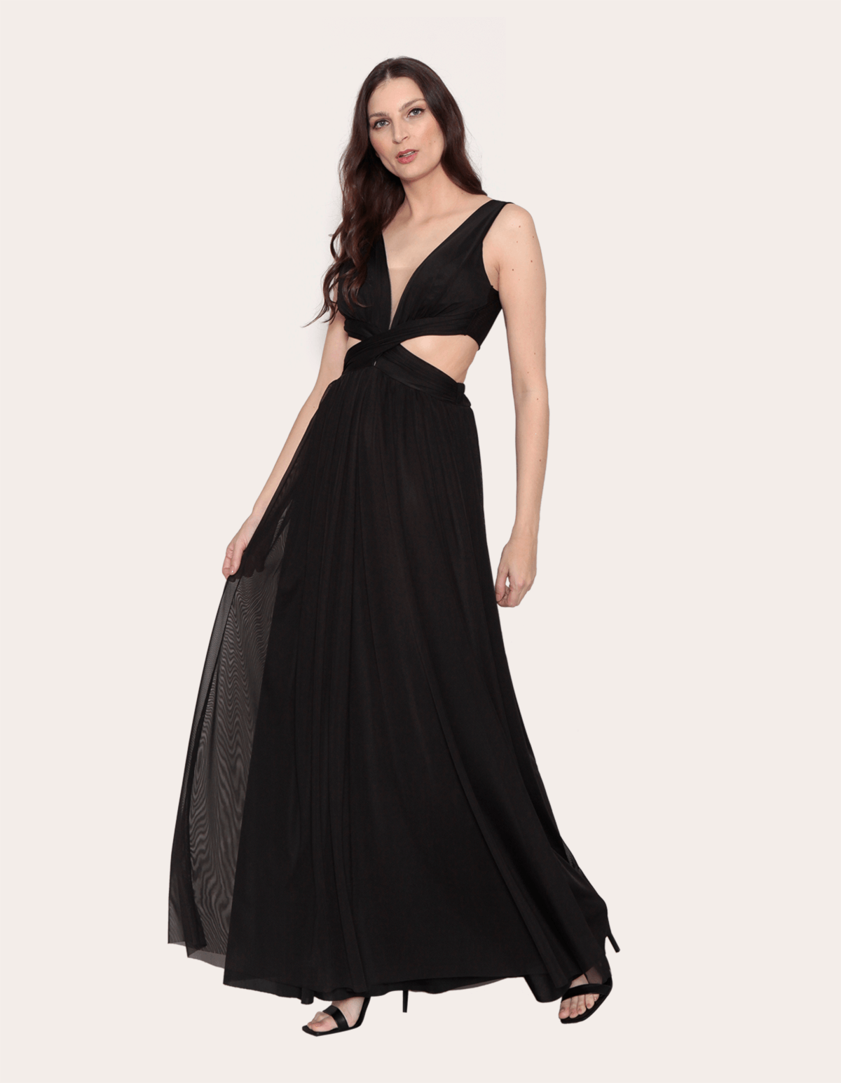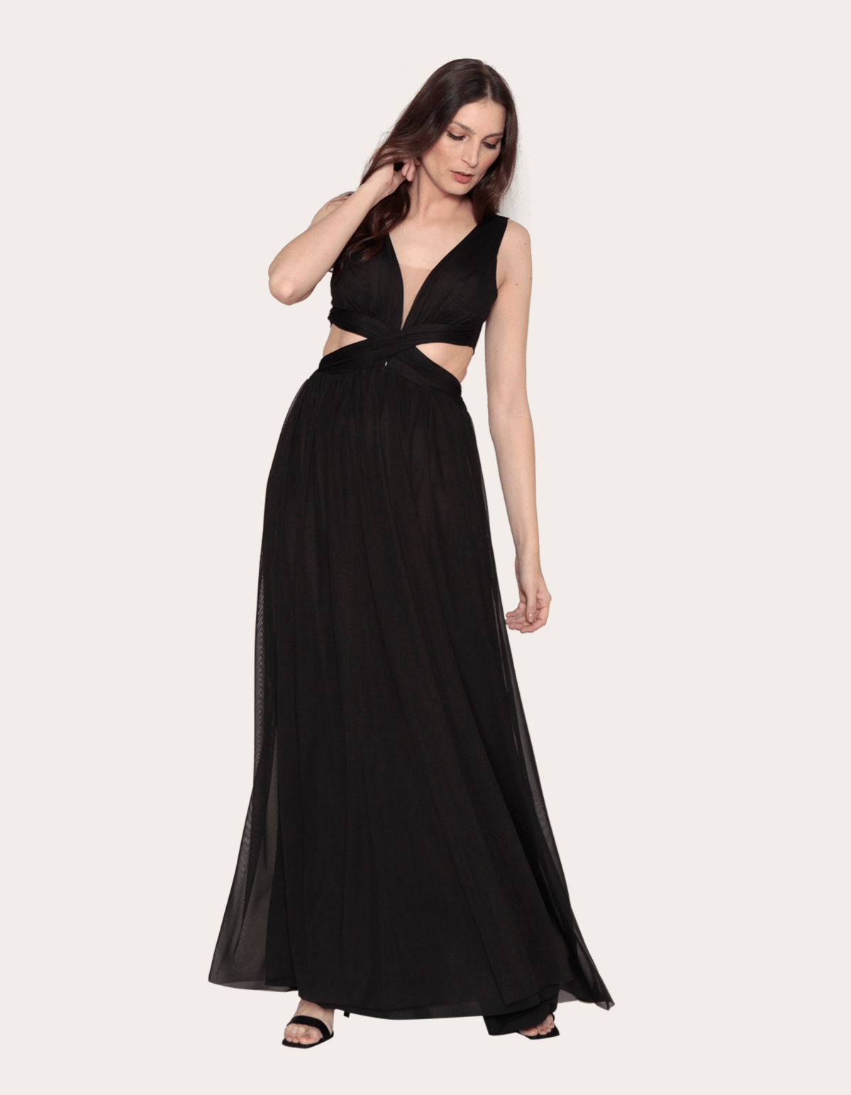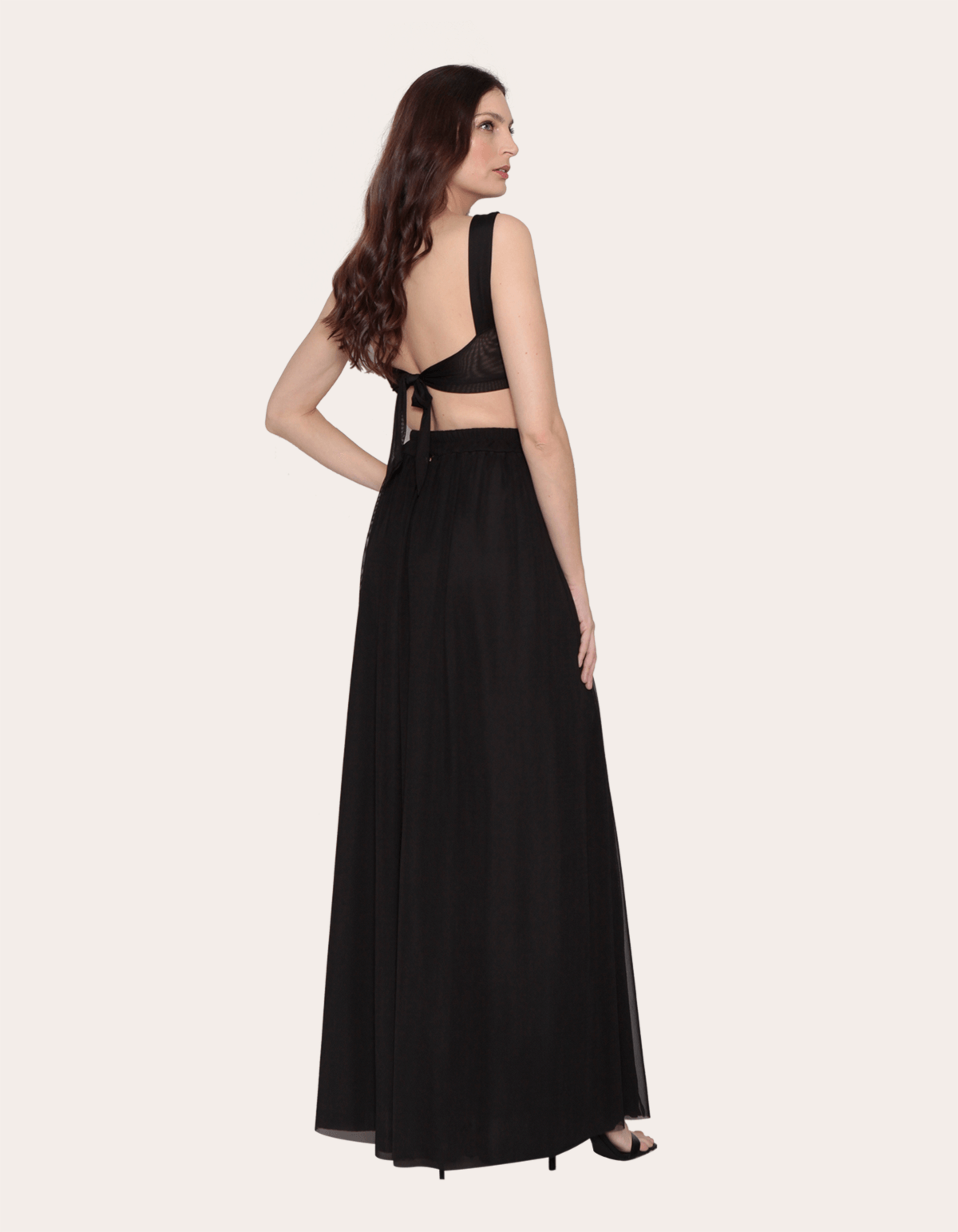 Vestido longo cavado tule cós cruzado