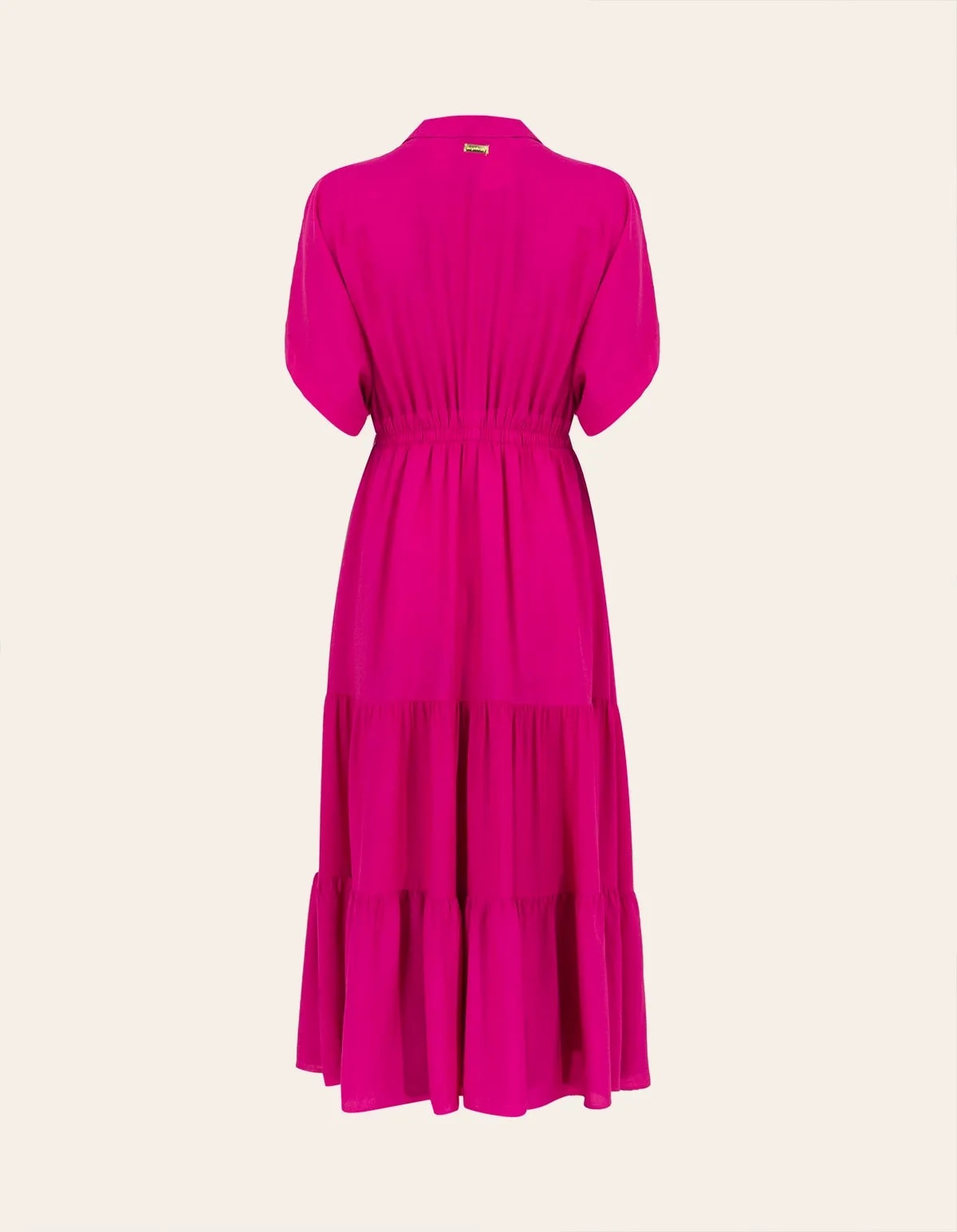 Vestido chemise longo com elástico na cintura, manga curta, 2 bolsos na frente e decote v que valoriza o colo e alonga o tronco, conferindo um ar de sofisticação ao look.