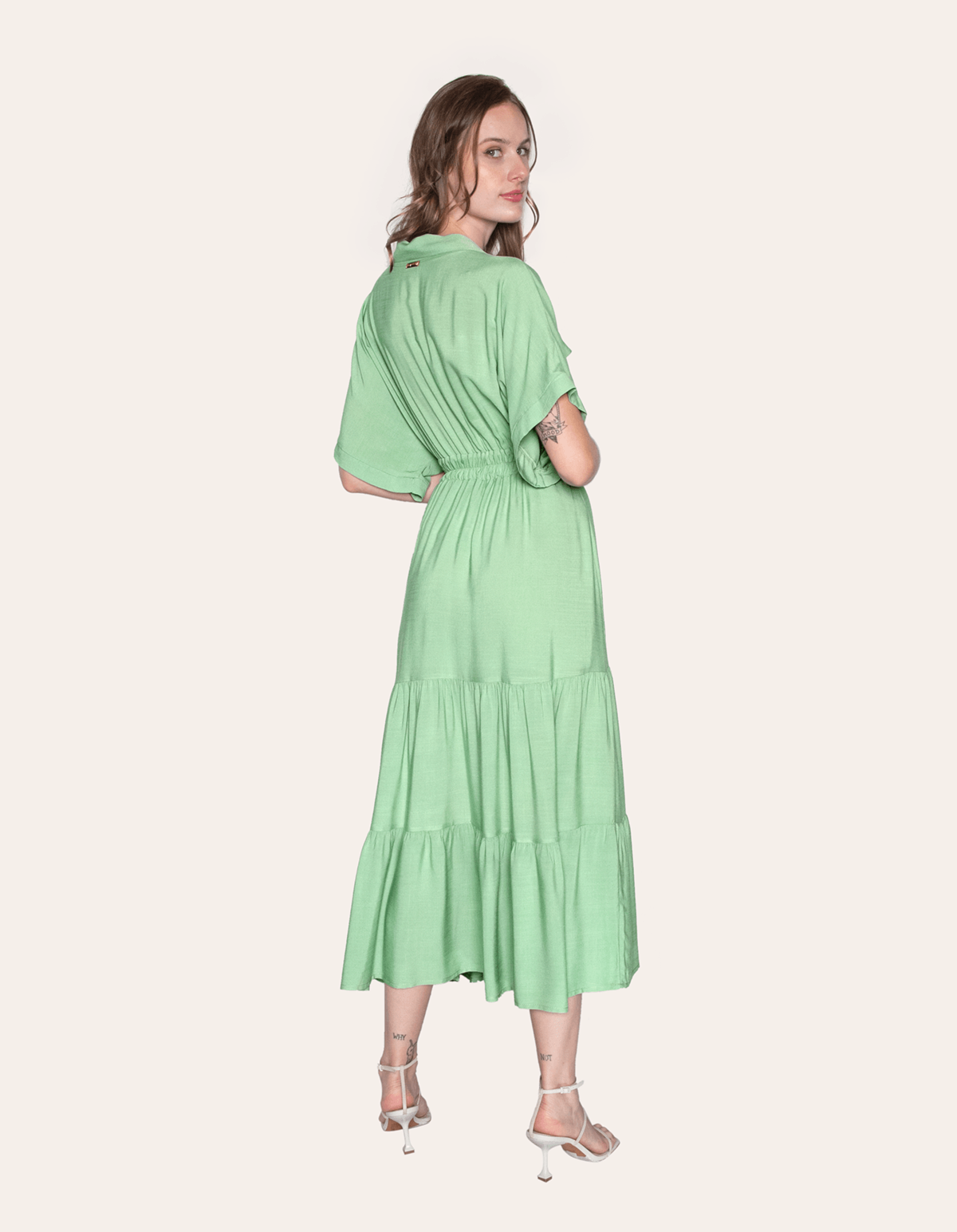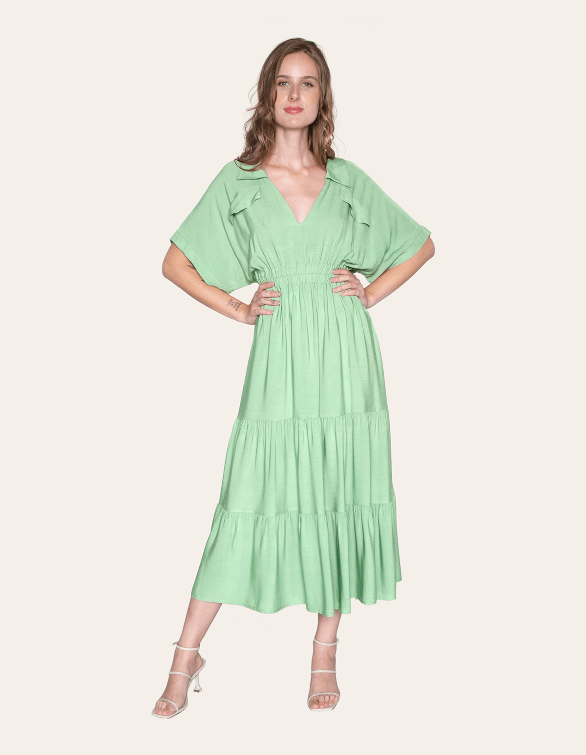 Vestido chemise longo com elástico na cintura, manga curta, 2 bolsos na frente e decote v que valoriza o colo e alonga o tronco, conferindo um ar de sofisticação ao look.