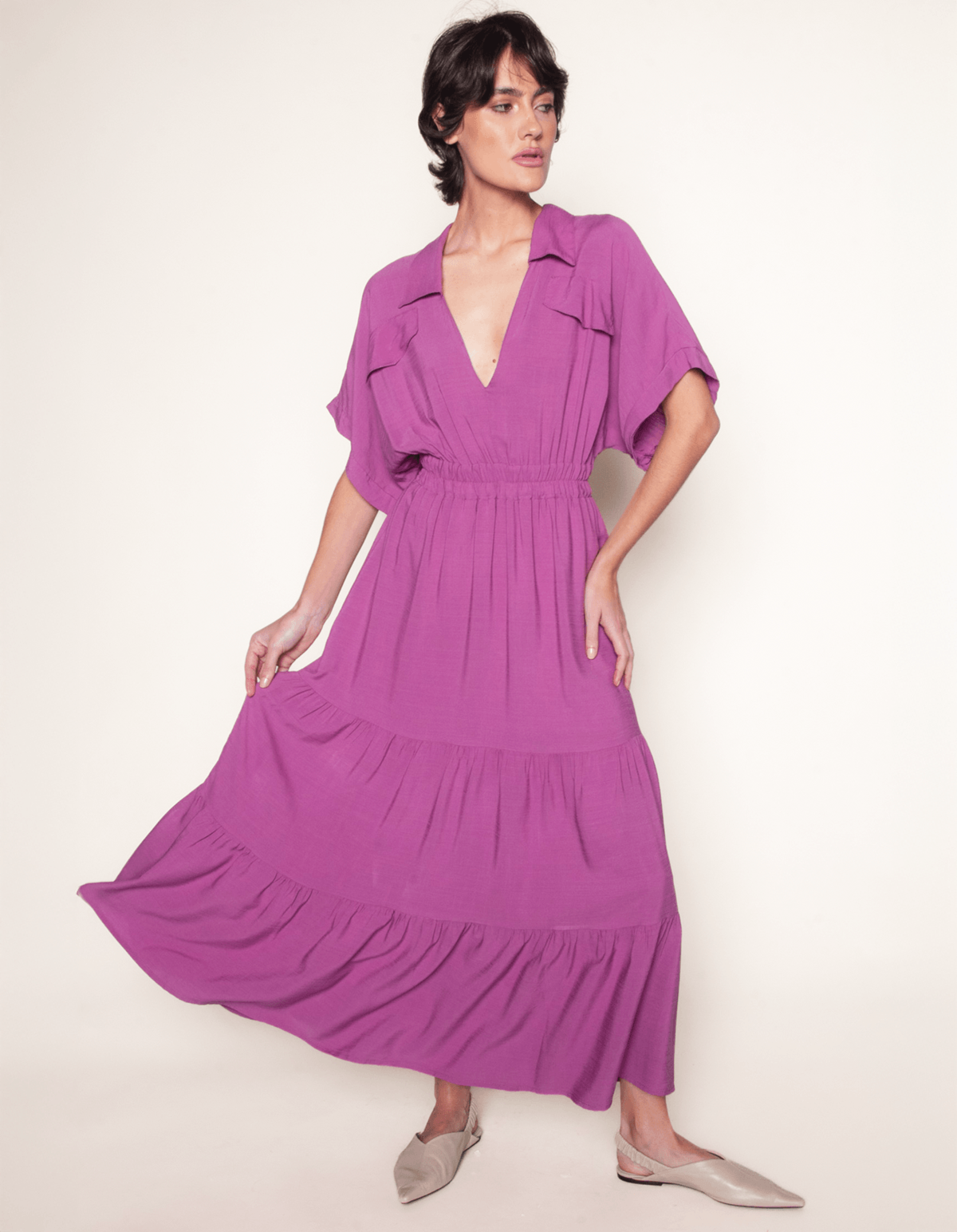 Vestido chemise longo com elástico na cintura, manga curta, 2 bolsos na frente e decote v que valoriza o colo e alonga o tronco, conferindo um ar de sofisticação ao look.