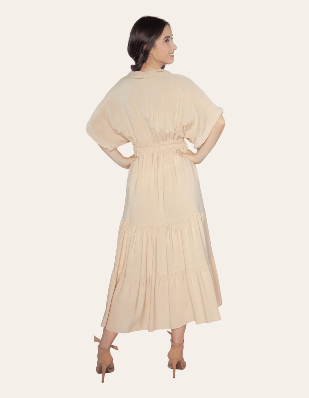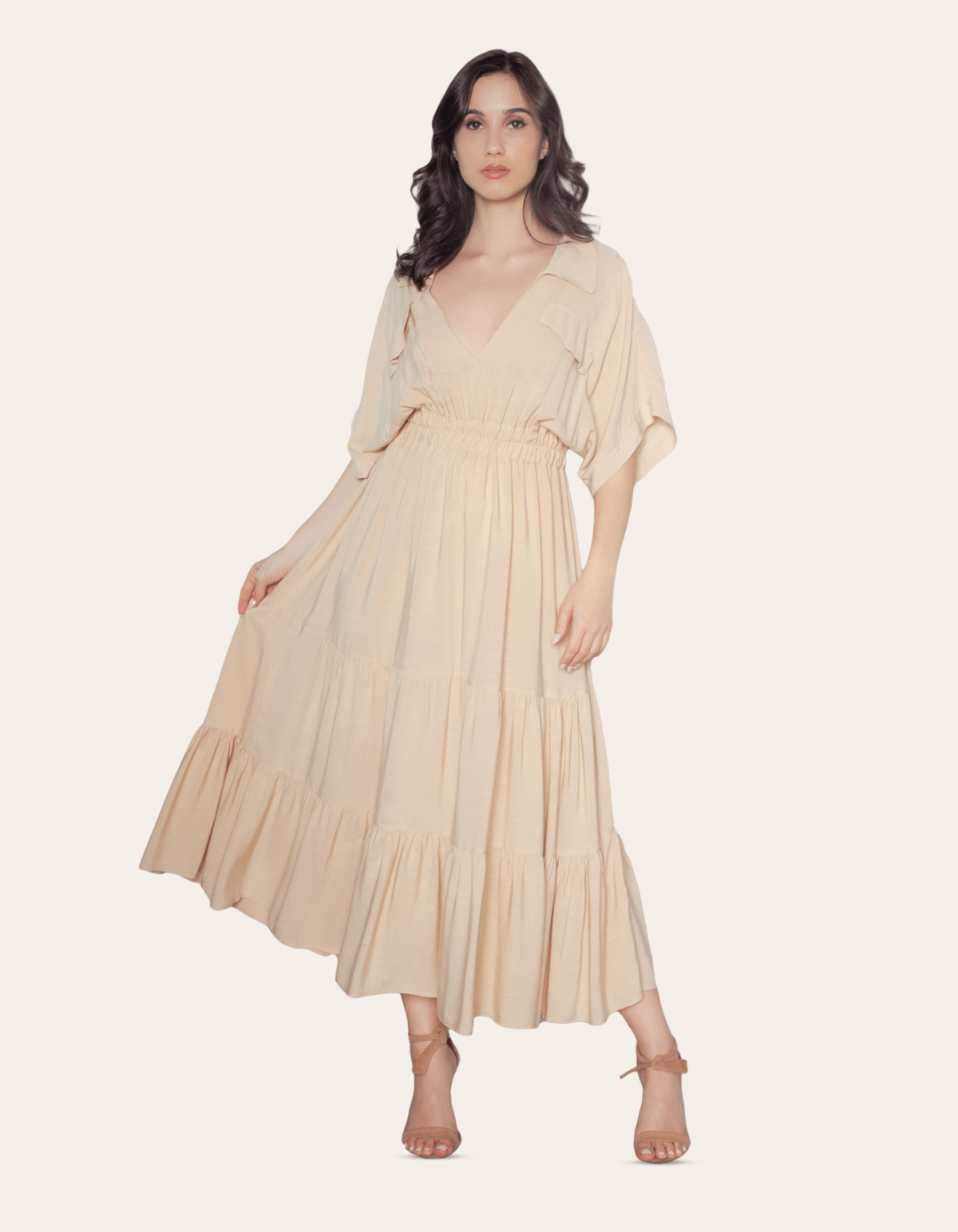 Vestido chemise longo com elástico na cintura, manga curta, 2 bolsos na frente e decote v que valoriza o colo e alonga o tronco, conferindo um ar de sofisticação ao look.