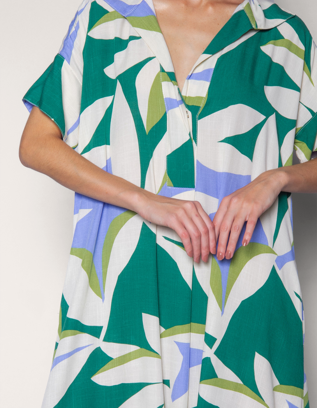 Vestido longo, modelagem ampla, possui gola dobrável, botões no entremeio, estampa diferenciada, manga curta. é a combinação perfeita de elegância e conforto.