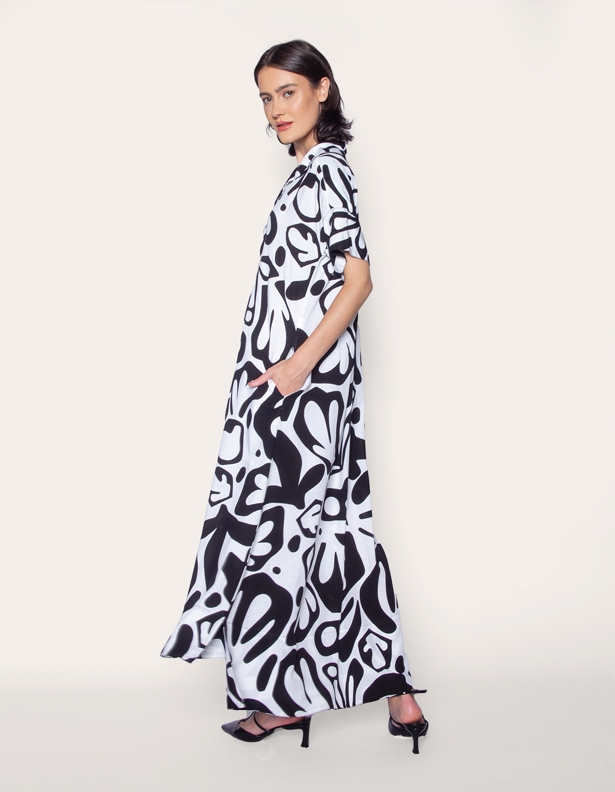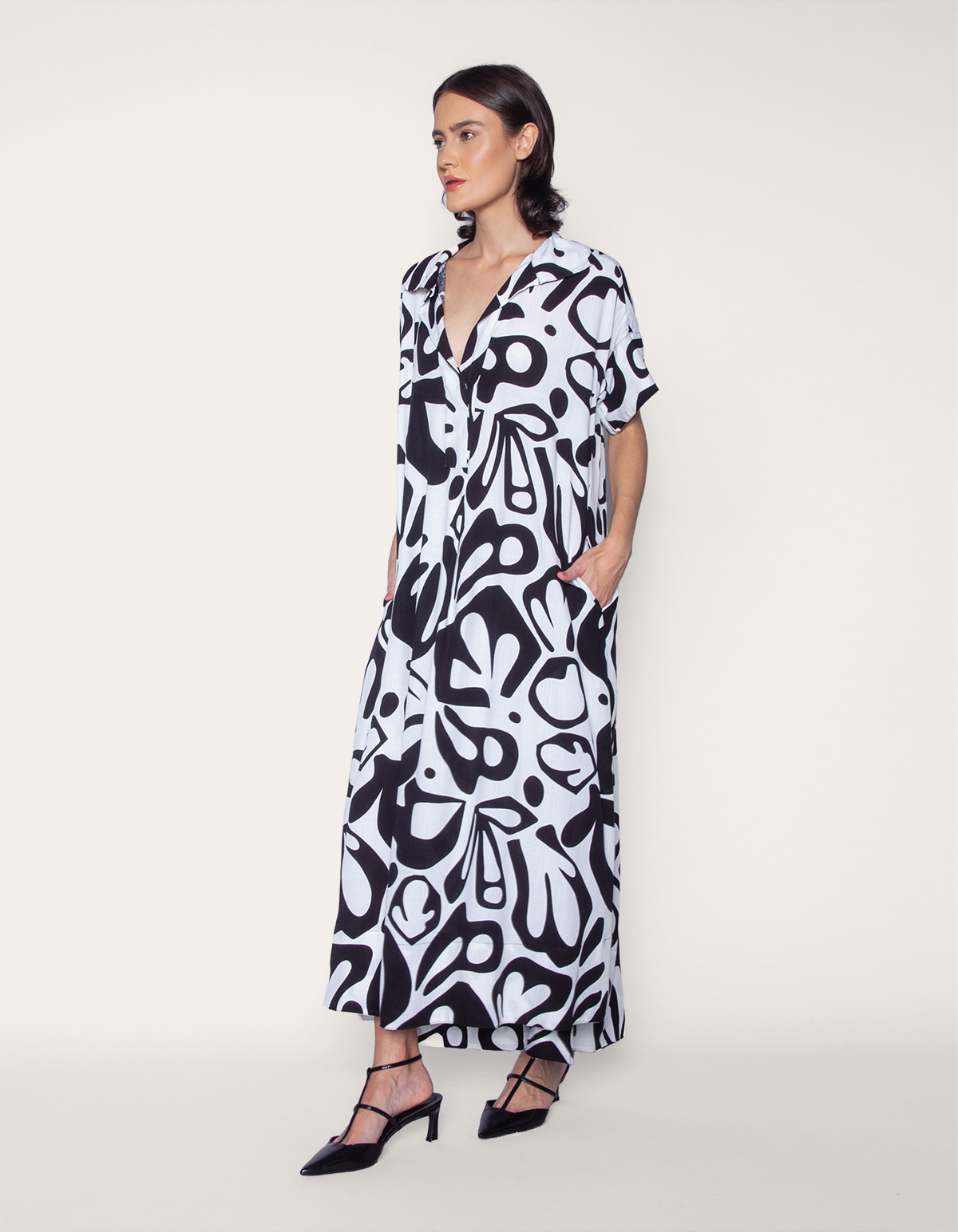 Vestido longo, modelagem ampla, possui gola dobrável, botões no entremeio, estampa diferenciada, manga curta. é a combinação perfeita de elegância e conforto.