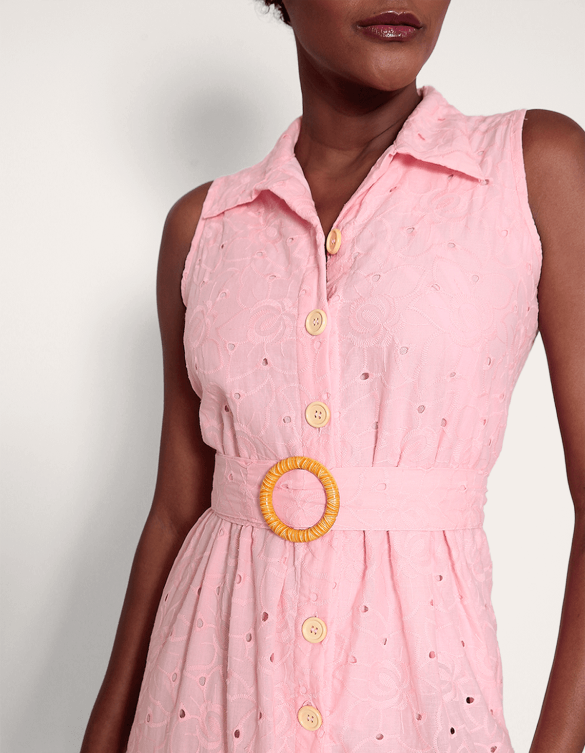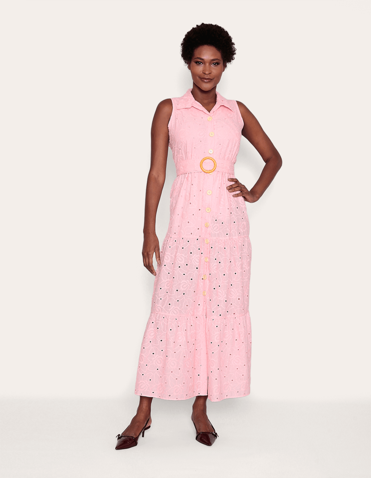 Vestido em laise com comprimento longo,cavado, gola, fechamento em botões e acompanha cinto com o mesmo tecido da peça. romântico e versátil, ideal para uma ocasião super especial.