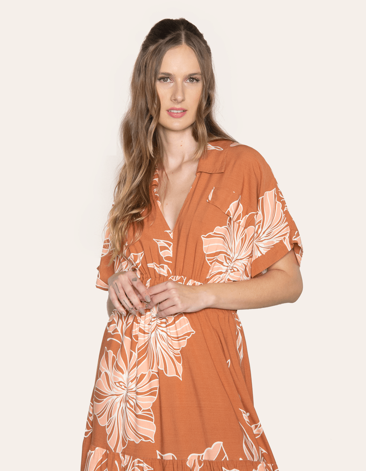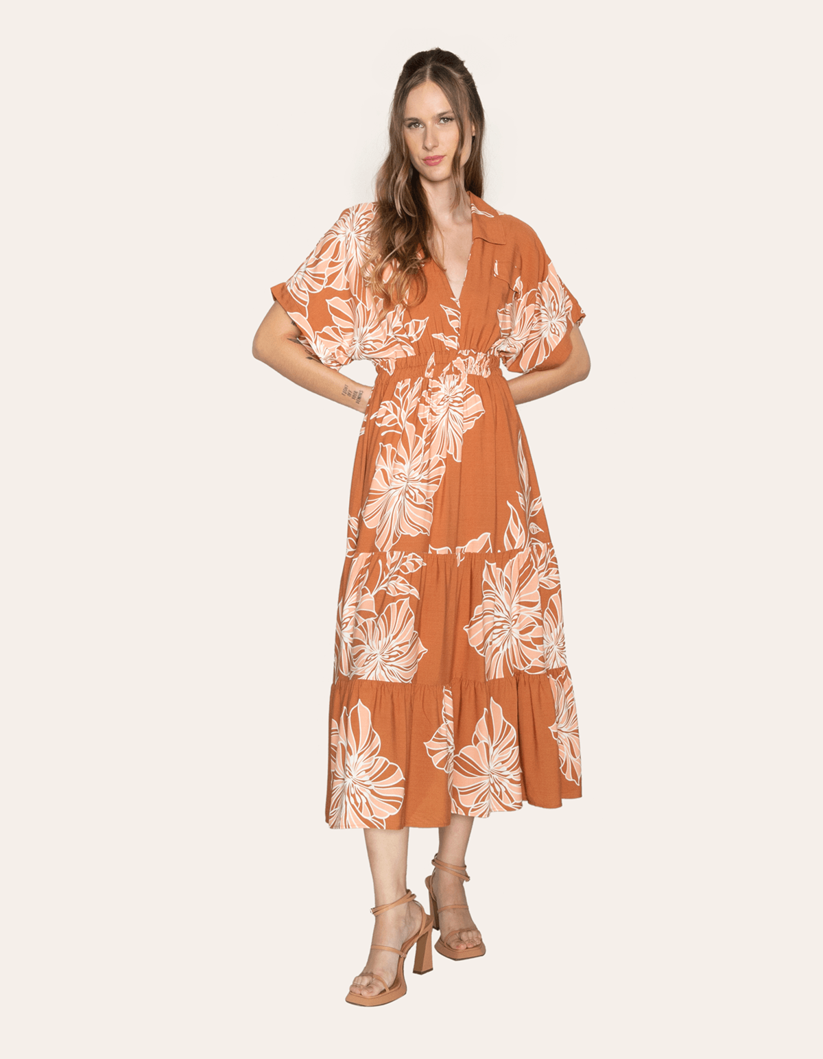 Vestido chemise longo com elástico na cintura, manga curta, lapela decorativa na frente e decote v que valoriza o colo e alonga o tronco, conferindo um ar de sofisticação ao look.