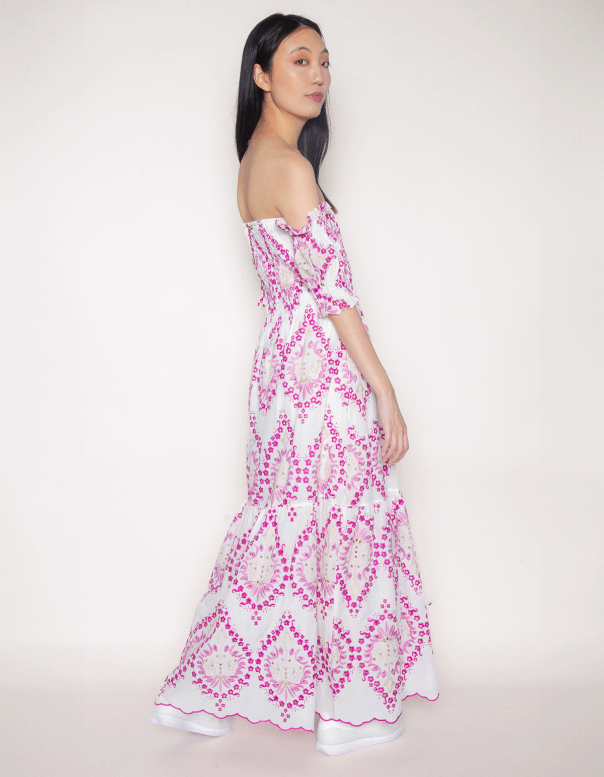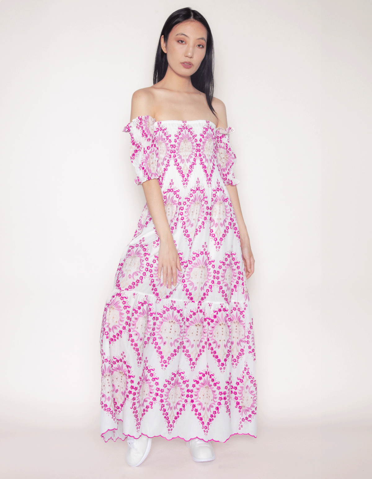 Vestido longo em laise bordada, modelo ciganinha com lastex no busto. o decote desse modelo valoriza o corpo, perfeito para um visual romântico.