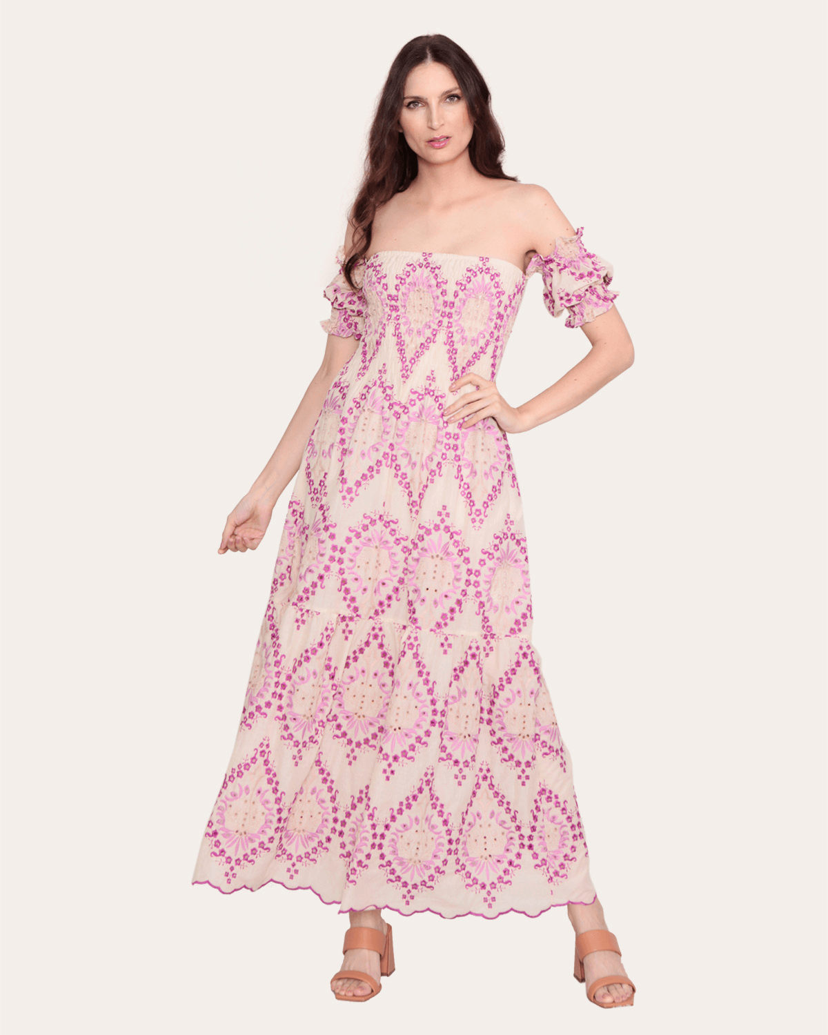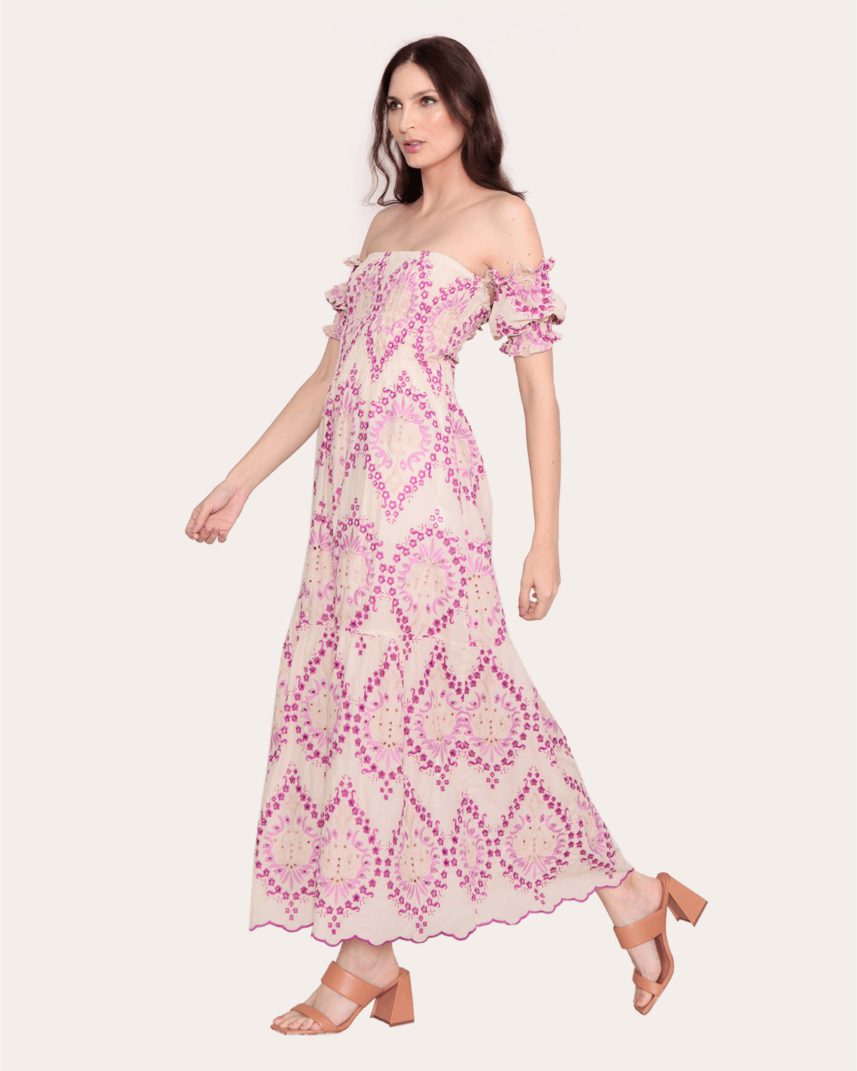 Vestido longo em laise bordada, modelo ciganinha com lastex no busto. o decote desse modelo valoriza o corpo, perfeito para um visual romântico.