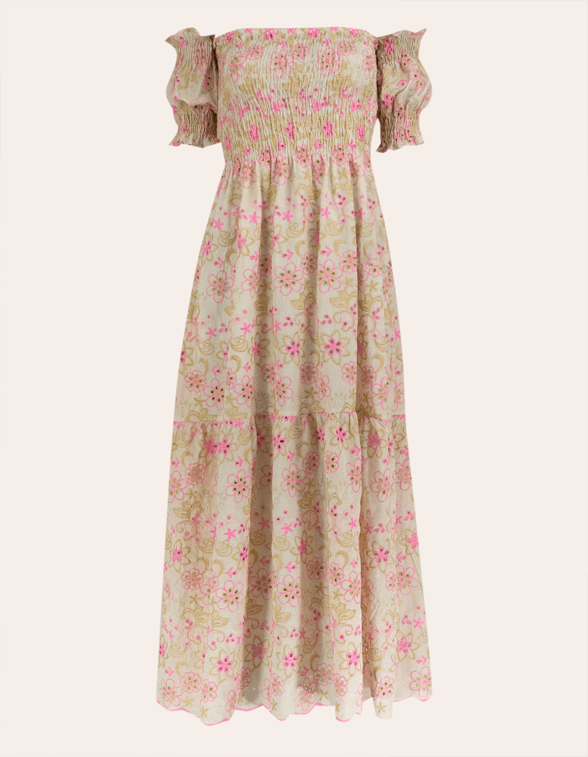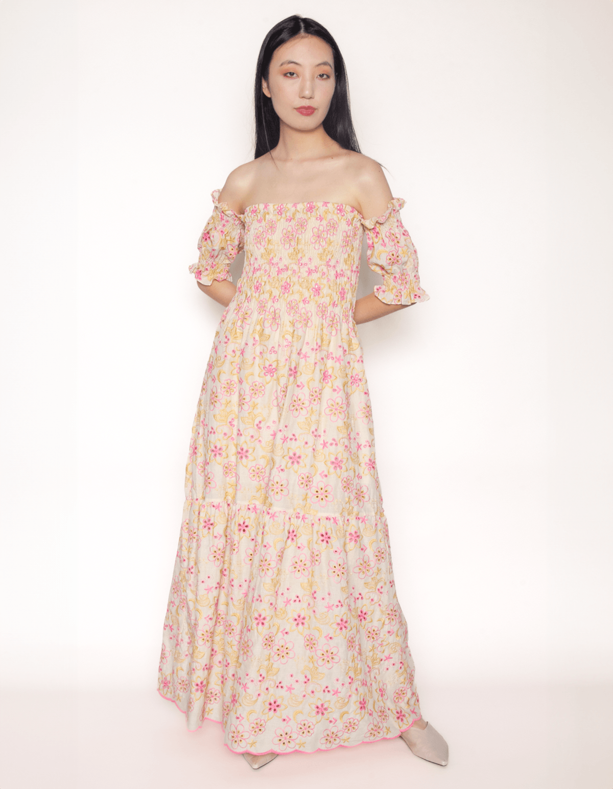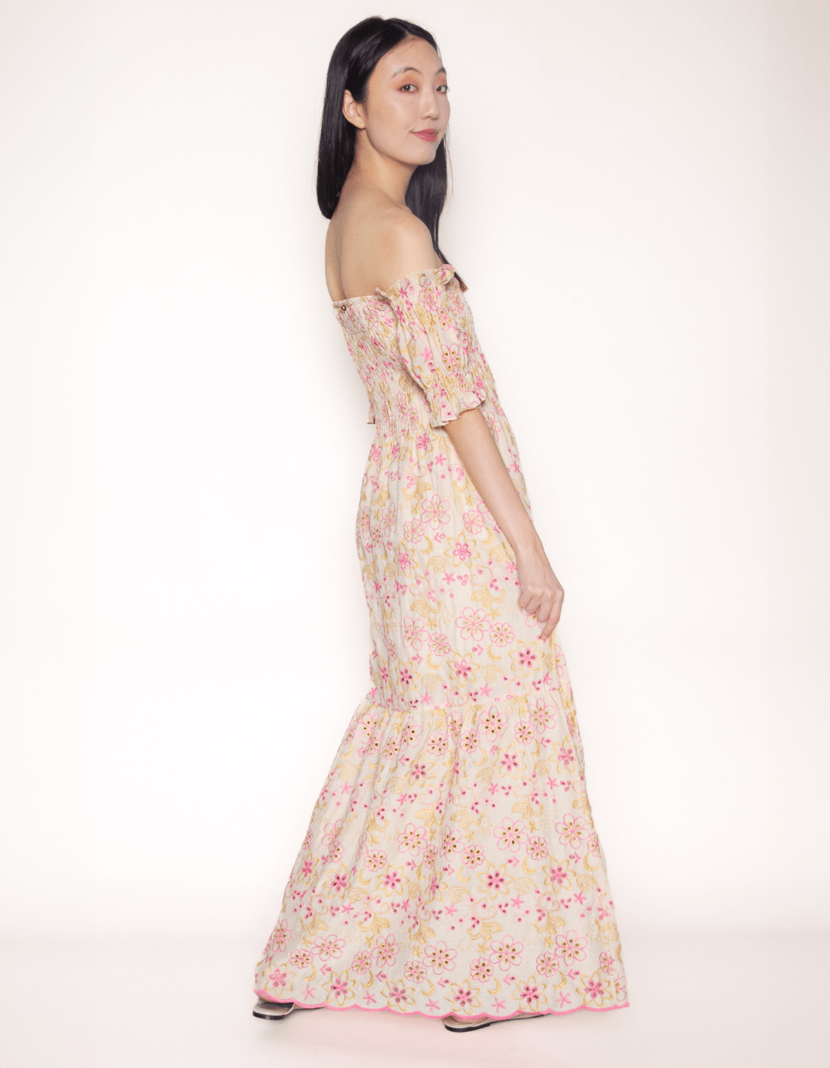 Vestido longo em laise bordada, modelo ciganinha com lastex no busto. o decote desse modelo valoriza o corpo, perfeito para um visual romântico.