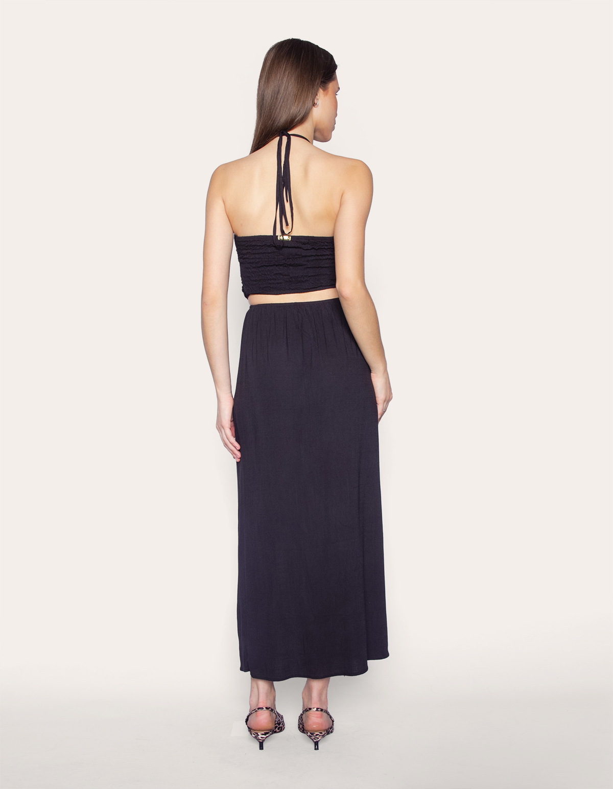 Vestido longo com detalhes vazados no busto e cintura, fenda frontal e modelagem ajustada ao corpo. é a escolha ideal para quem busca um toque de moda e sofisticação.