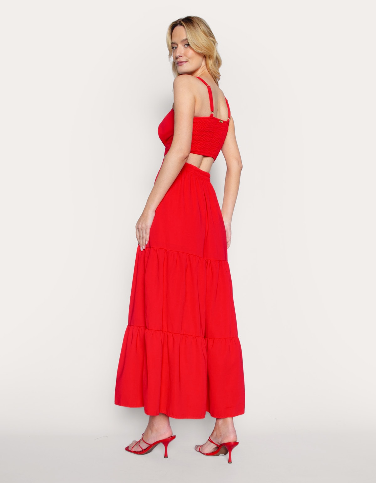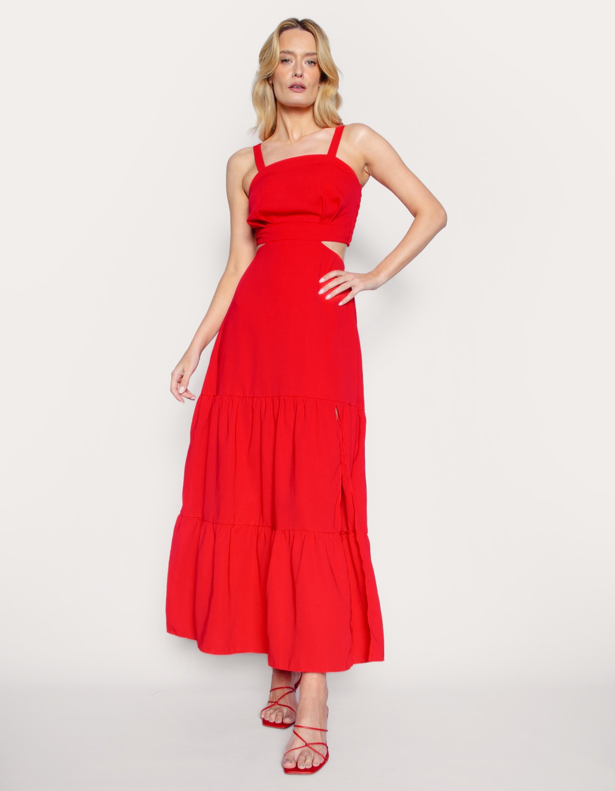 Vestido longo alça média com regulador, possui decote reto com bojo, saia ampla com fenda na frente, recortes que começam na lateral da cintura e vai para costas. Perfeito para um jantar romântico ou um passeio casual, é a escolha certa para brilhar em qualquer situação.