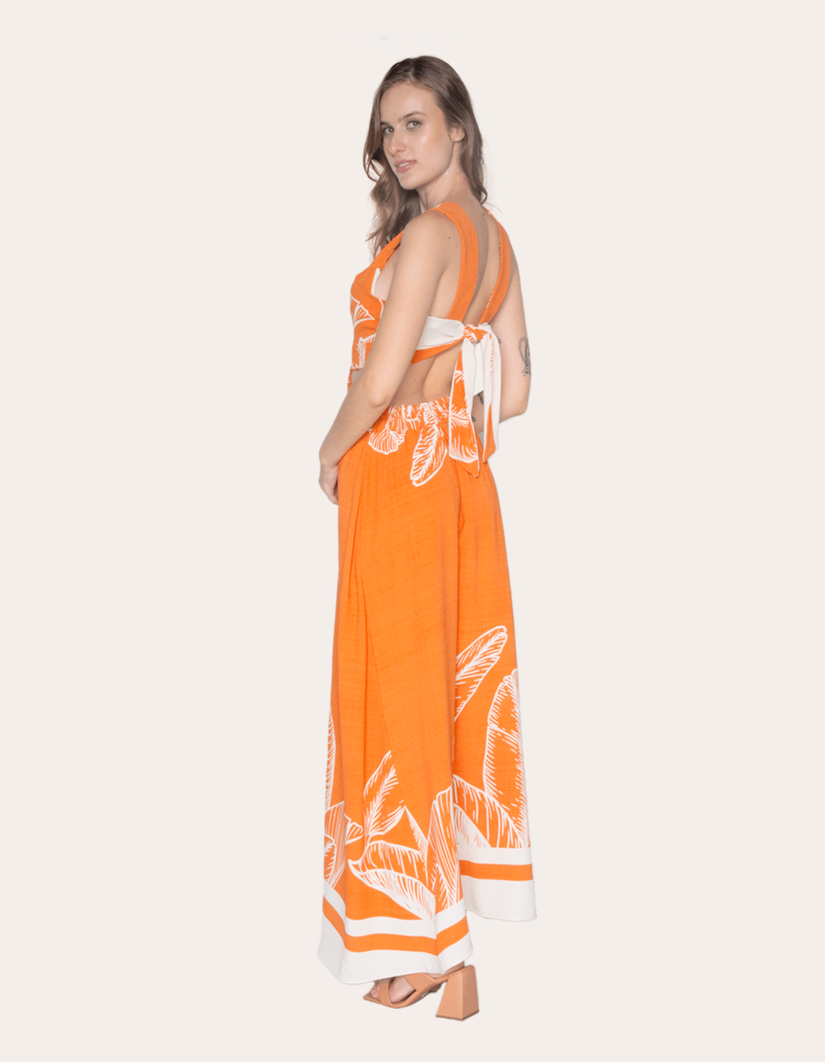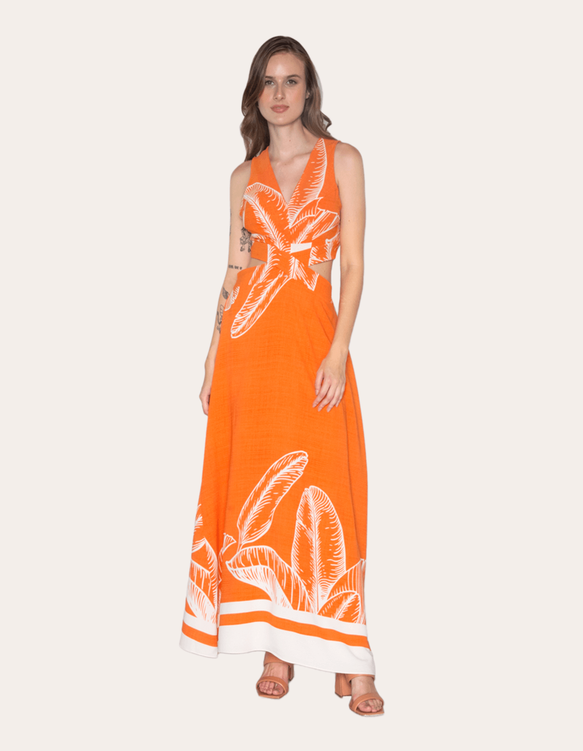 Vestido longo estampado, decote v, possui bojo, recorte lateral e amarração nas costas. sofisticação e estilo em uma única peça.