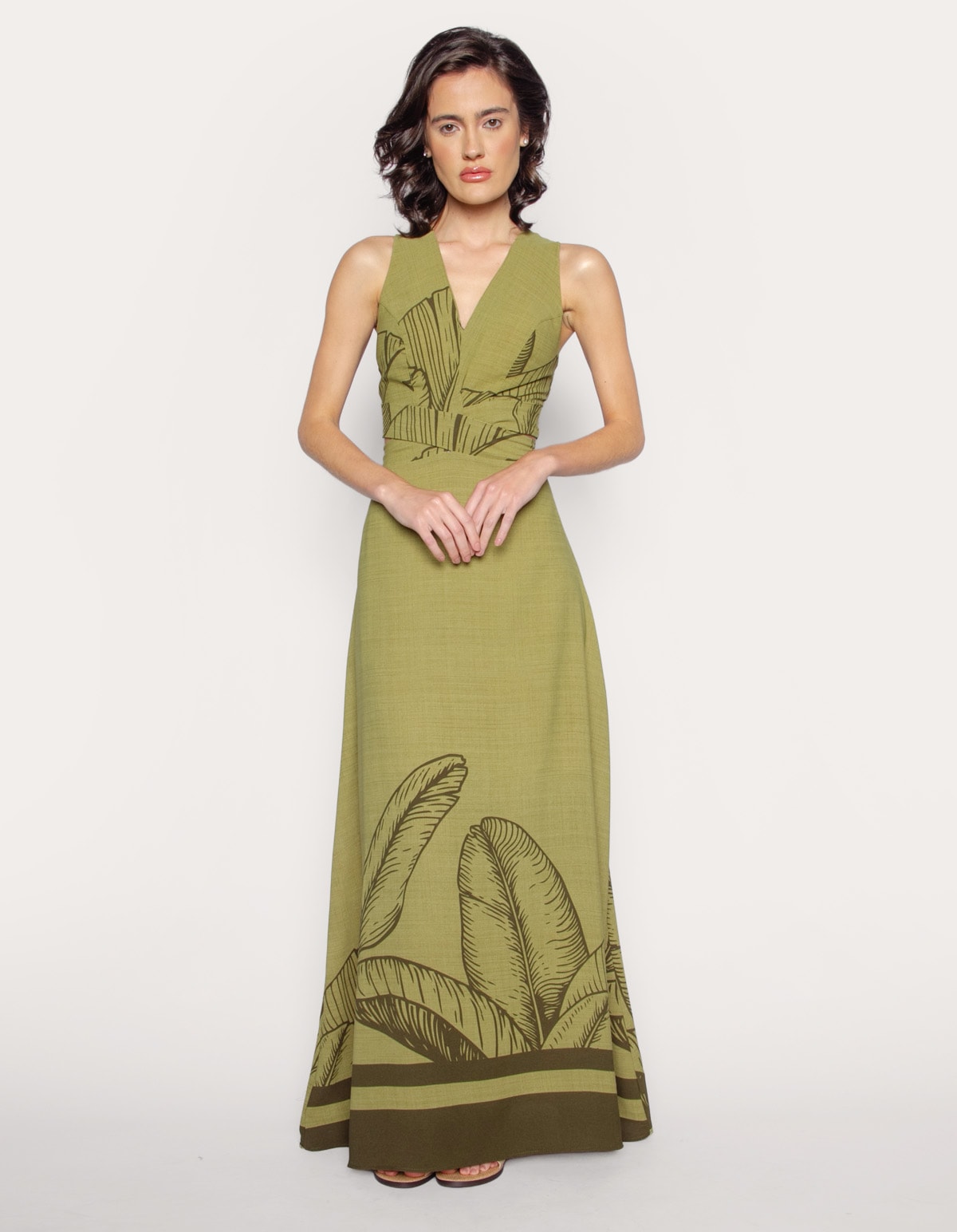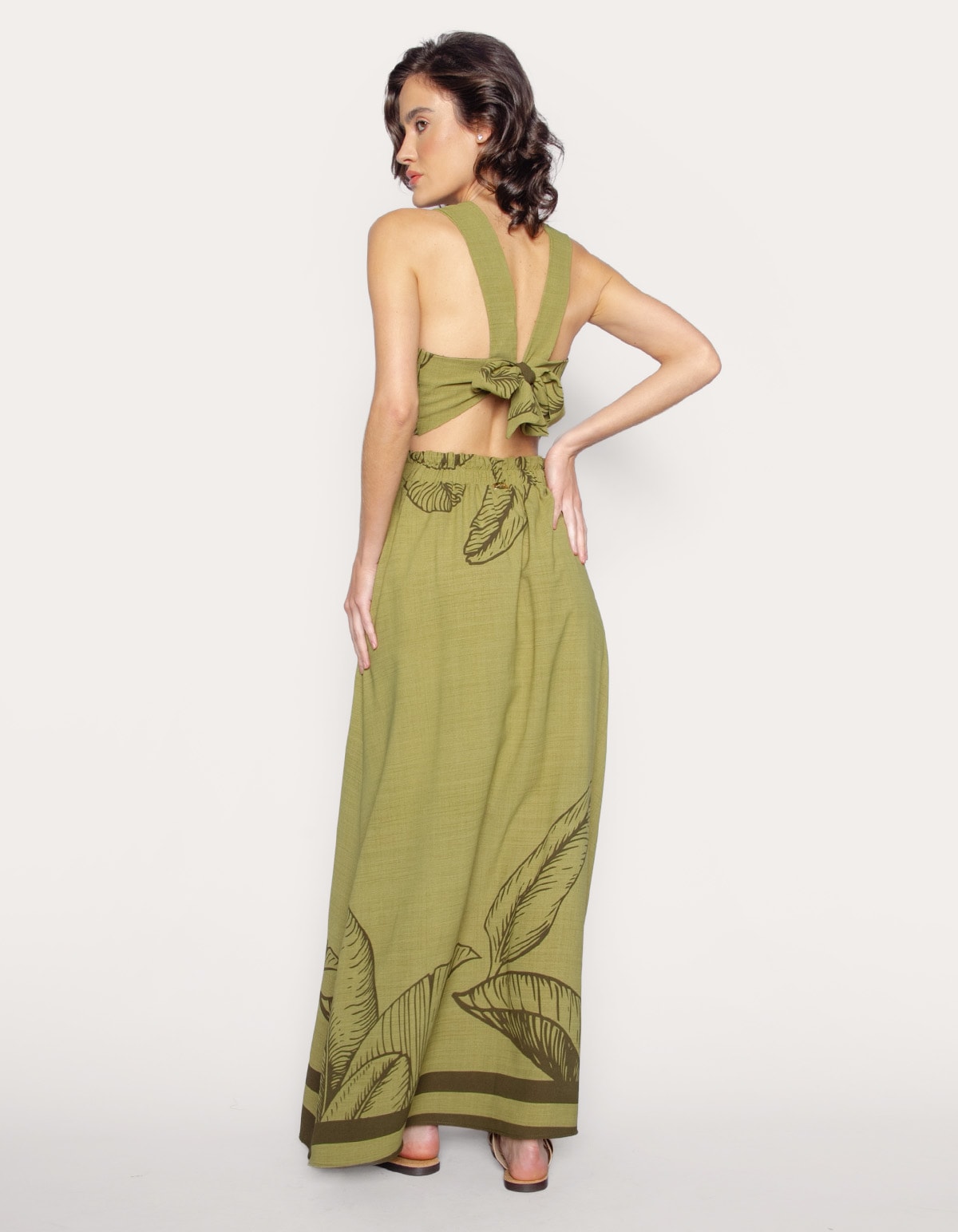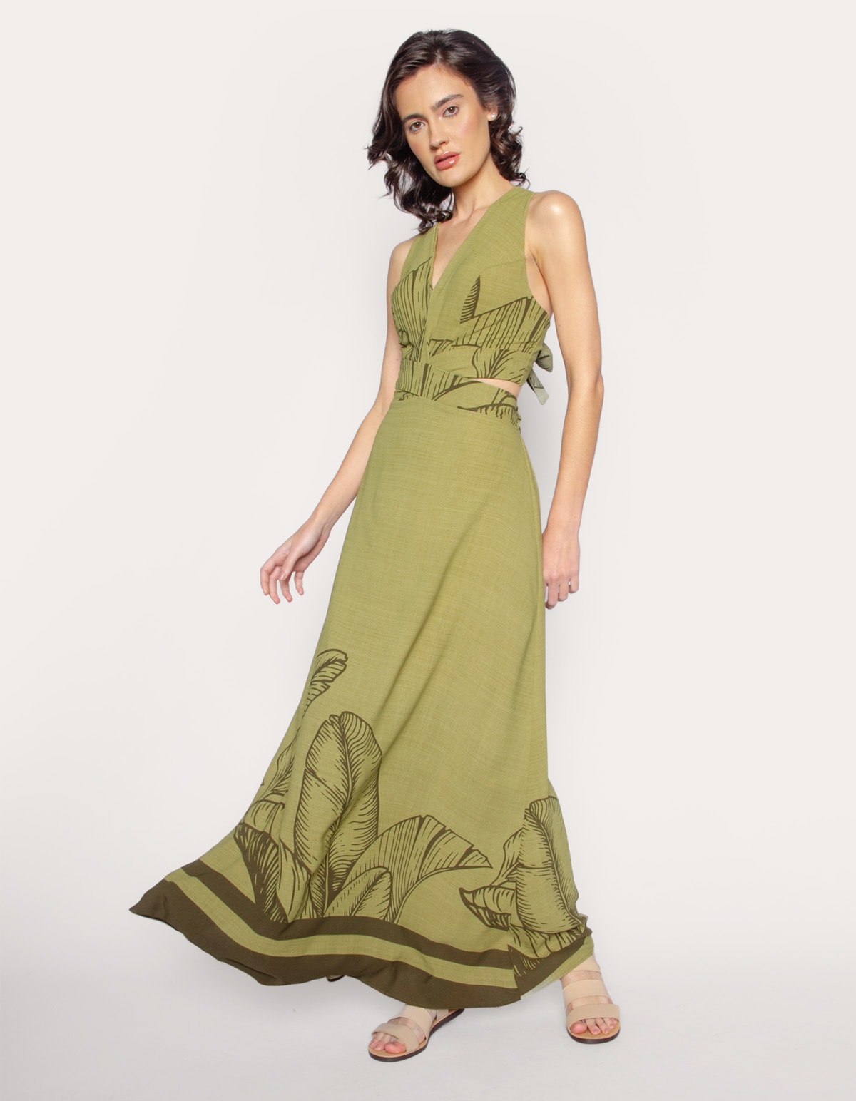Vestido longo estampado, decote v, possui bojo, recorte lateral e amarração nas costas. sofisticação e estilo em uma única peça.