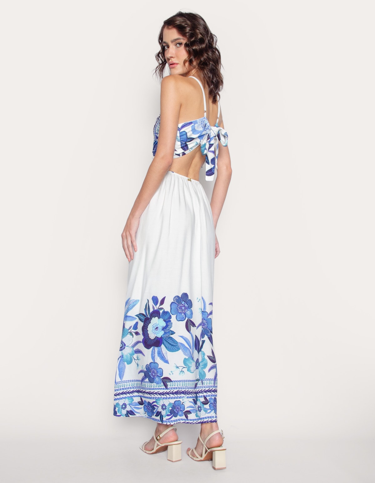 Vestido longo, possui alças finas que se cruzam no pescoço e se amarram nas costas, decote v transpassado profundo com recorte vazado próximo a cintura (laterais e parte da barriga). Vestido de estilo marcadamente boho ou praiano, com recortes que dão um toque moderno e sexy.