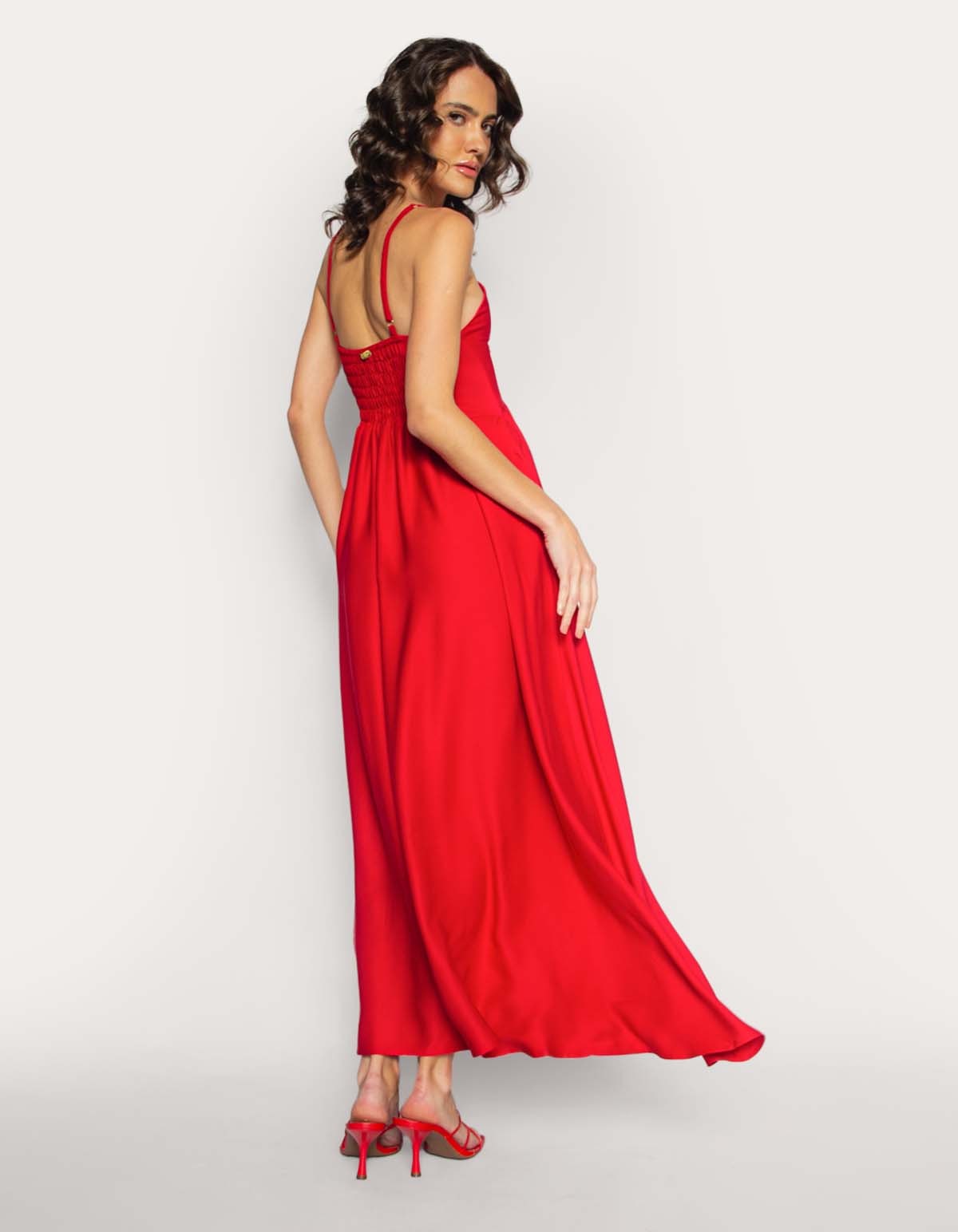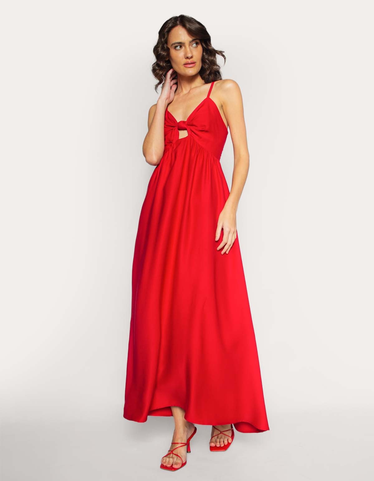 Vestido longo com alças finas de decote torcido no centro do busto, criando uma abertura (cut-out) logo abaixo do nó. Este detalhe confere um toque moderno e charmoso. Saia ampla e fluida, caindo em silhueta A. De estilo leve, romântico e descontraído, perfeito para passeios de verão, férias, almoços, happy hour, eventos ao ar livre e festas casuais.