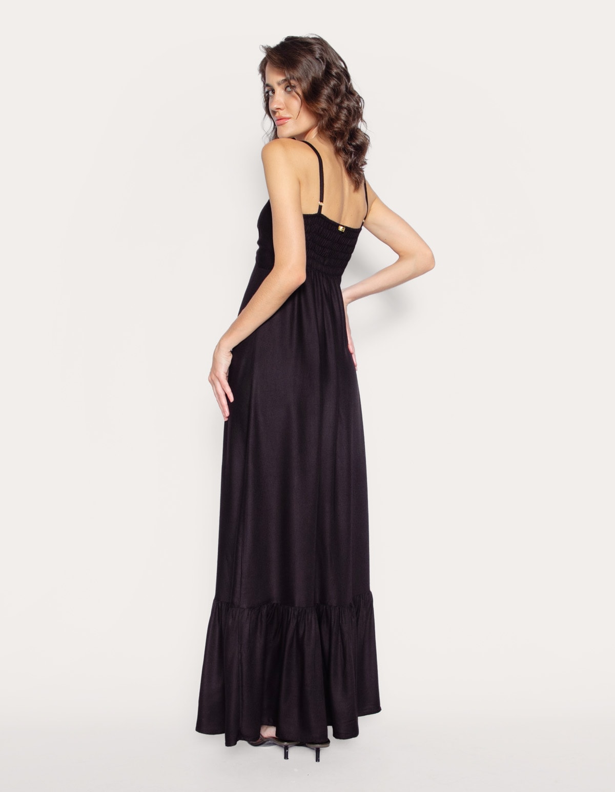 Vestido longo, alcinha fina com franzido central e detalhe metálico, proporcionando um toque delicado e estruturado, com efeito fluído e confortável ele tem um estilo solto, dando um visual confortável e elegante.