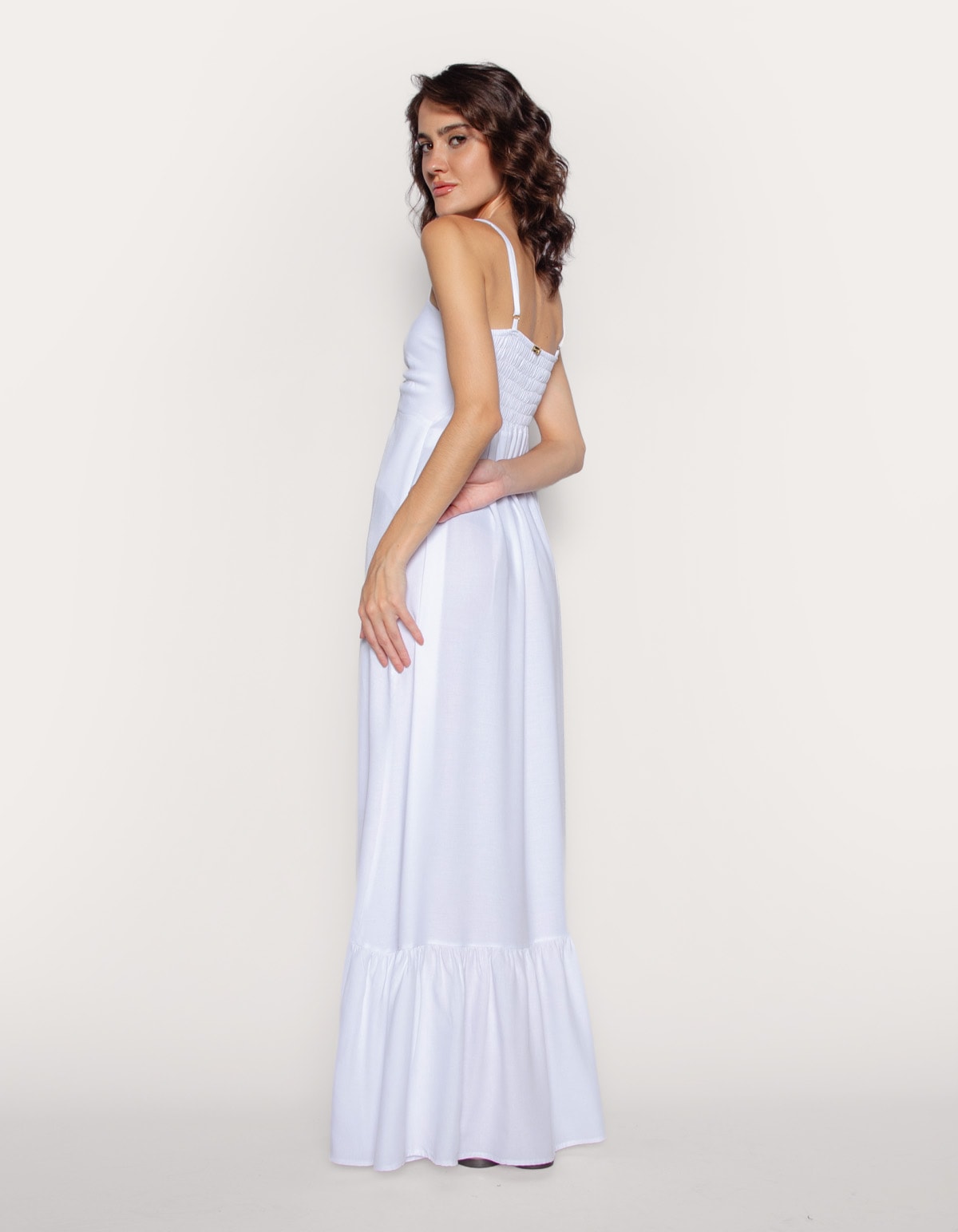 Vestido longo, alcinha fina com franzido central e detalhe metálico, proporcionando um toque delicado e estruturado, com efeito fluído e confortável ele tem um estilo solto, dando um visual confortável e elegante.