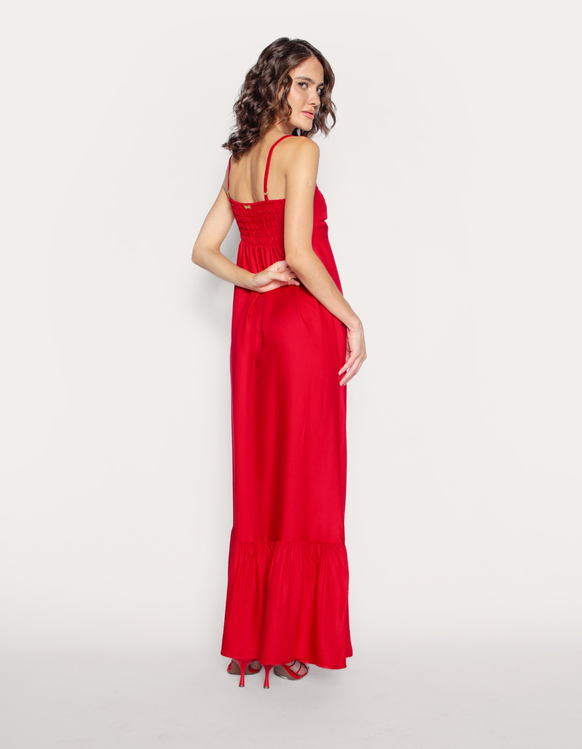 Vestido longo, alcinha fina com franzido central e detalhe metálico, proporcionando um toque delicado e estruturado, com efeito fluído e confortável ele tem um estilo solto, dando um visual confortável e elegante.