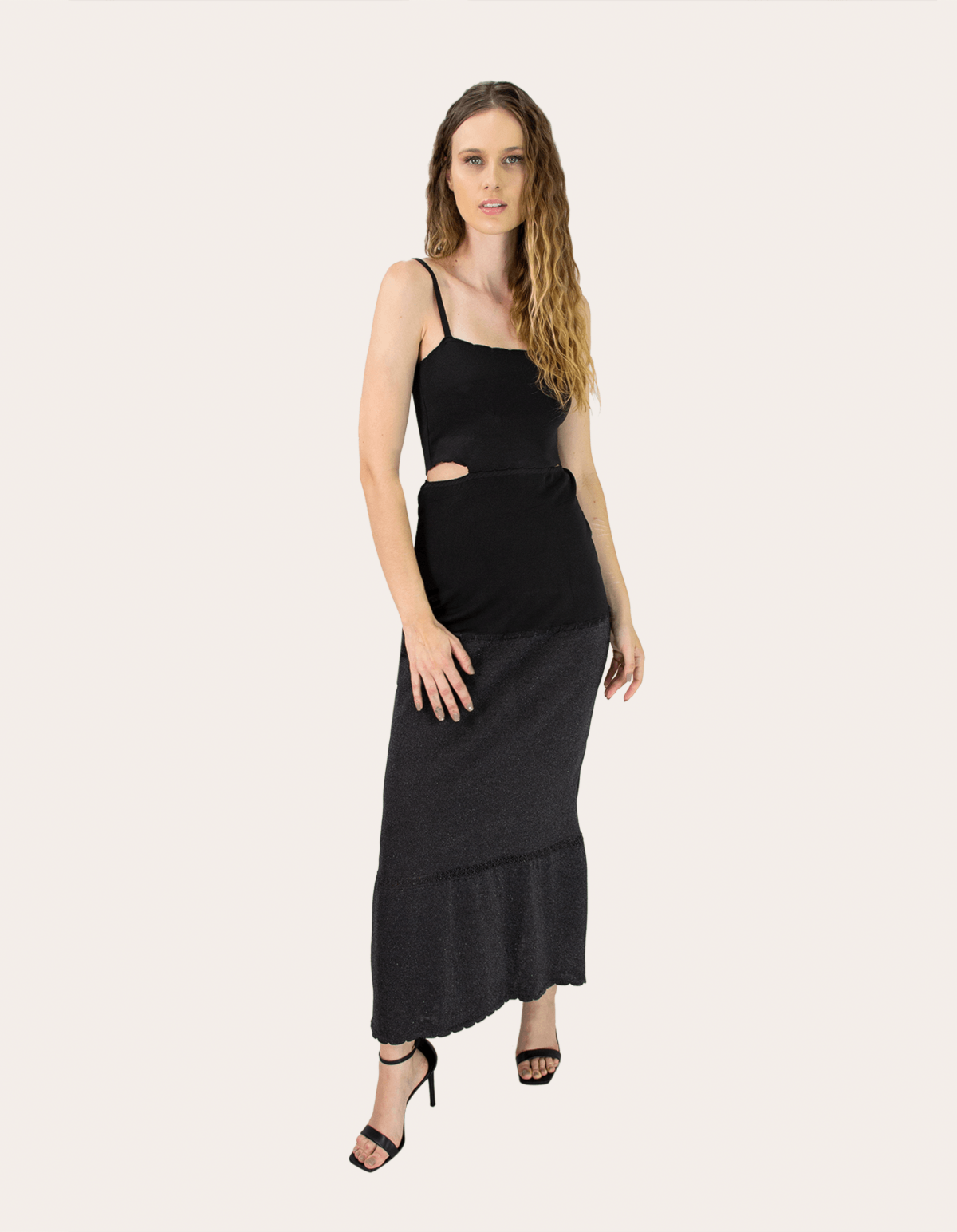 Vestido longo tricot de alcinha e cós vazado, barra em lurex. perfeito para arrasar!!!