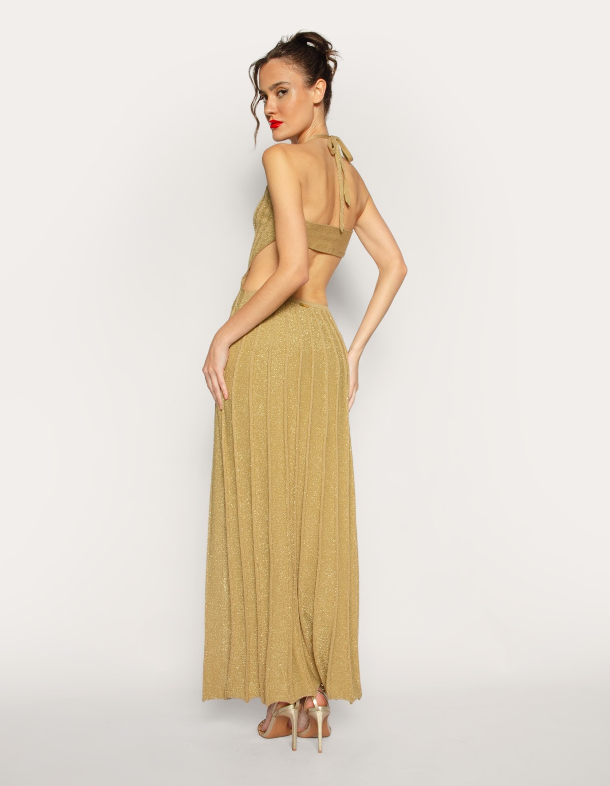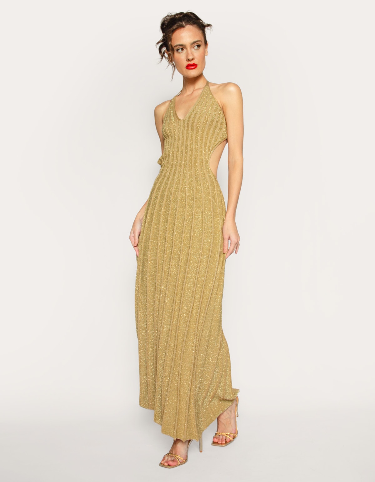 Vestido longo canelado decote halter dourado com fio lurex, é a peça ideal para eventos noturnos, festas e ocasiões que pedem um visual elegante e cheio de brilho. Seu design sofisticado combina conforto e glamour de forma impecável. Seu detalhe canelado ajuda a alongar a silhueta. Combine com jóias discretas ou peças statement, como brinco longo e sandálias de salto altto e scarpins.