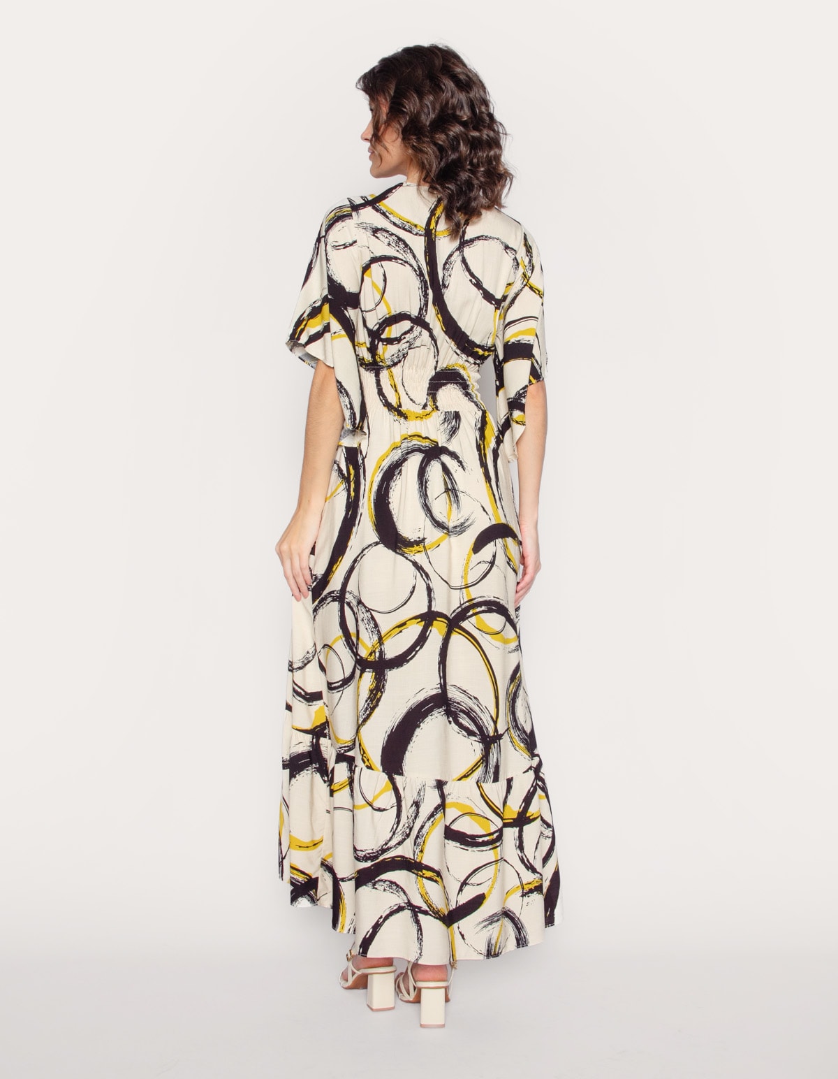Vestido longo manga godê, decote v, com bojo, barra hi-lo (na frente mais curta e atrás mais comprida). delicado e com um corte que valoriza a silhueta, esse modelo cria uma aparência elegante e sofisticada.