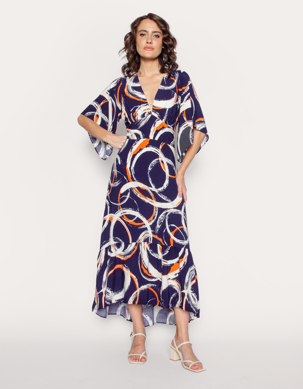 Vestido longo manga godê, decote v, com bojo, barra hi-lo (na frente mais curta e atrás mais comprida). delicado e com um corte que valoriza a silhueta, esse modelo cria uma aparência elegante e sofisticada.