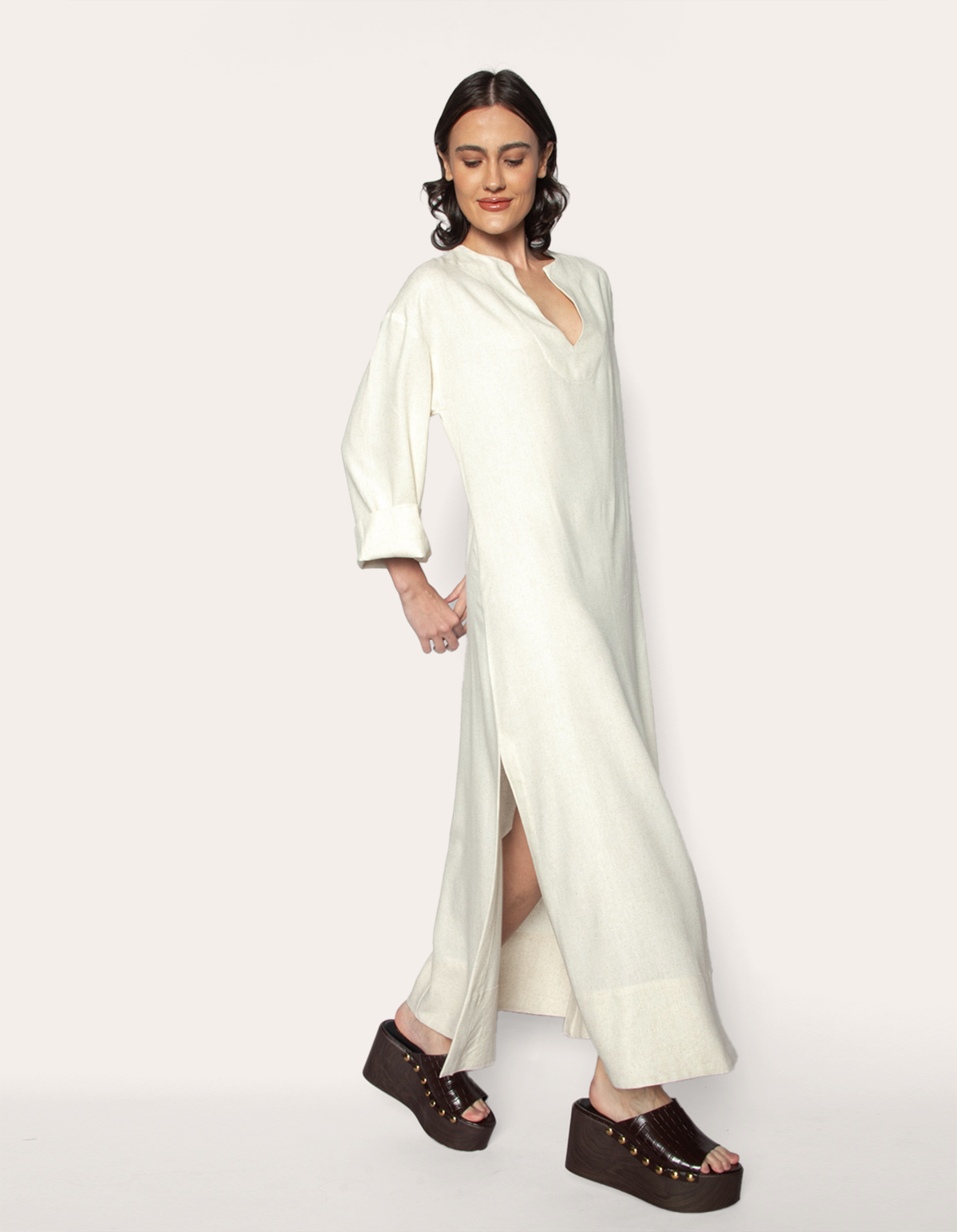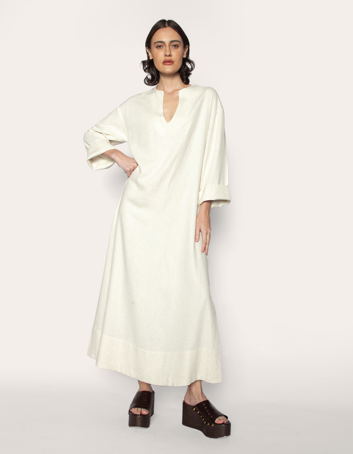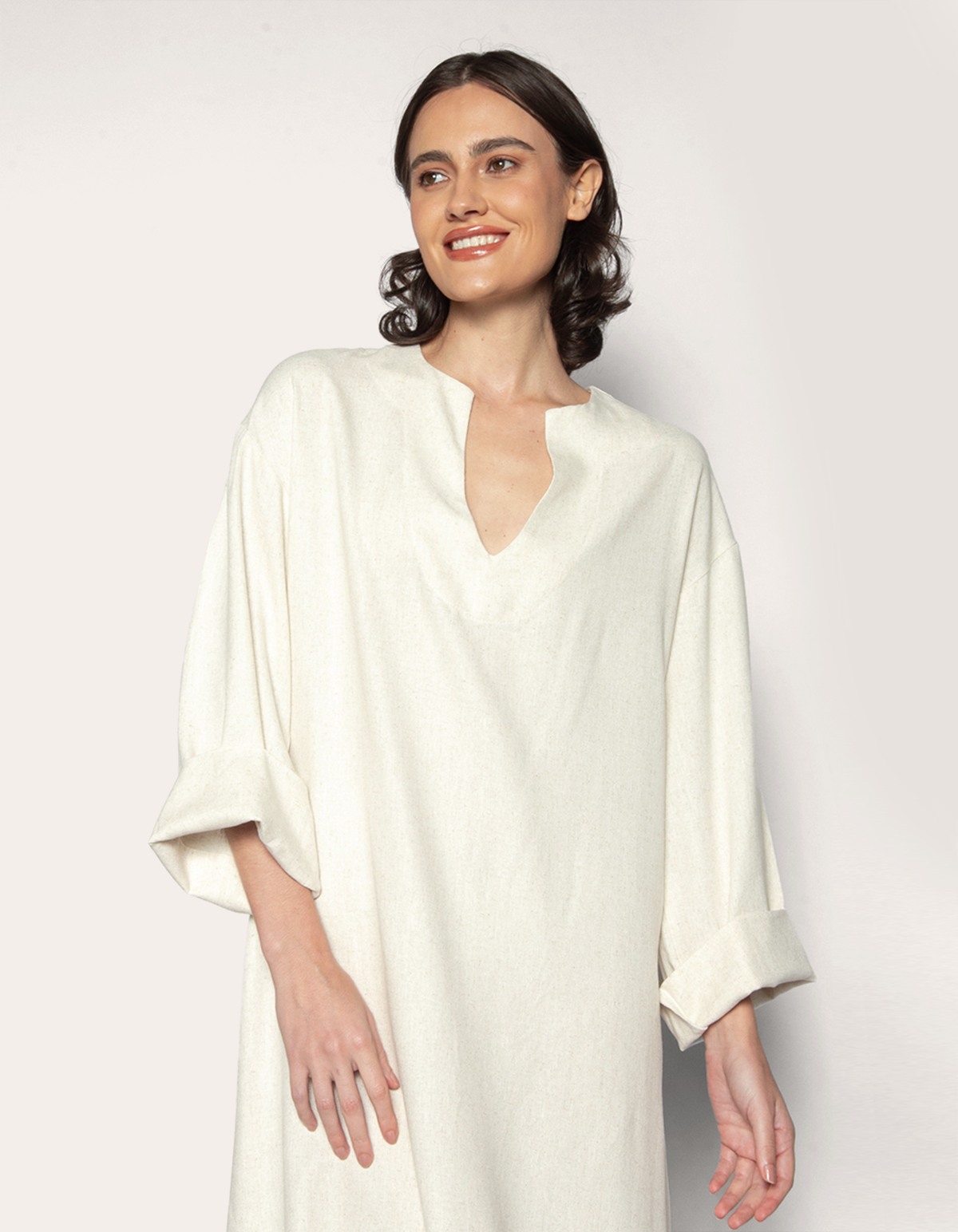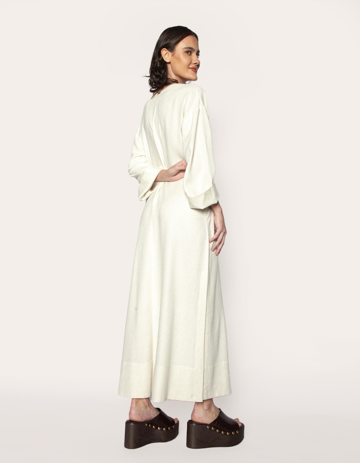 Vestido longo, manga longa, modelagem ampla tipo kaftan e decote v. modelo que proporciona a sensação de liberdade, sem perder o conforto e a sofisticação. com um estilo romântico, delicado e feminino, ele é versátil e atemporal, além de ser democrático, todas as mulheres podem usá-lo, independentemente de biotipo ou estilo.