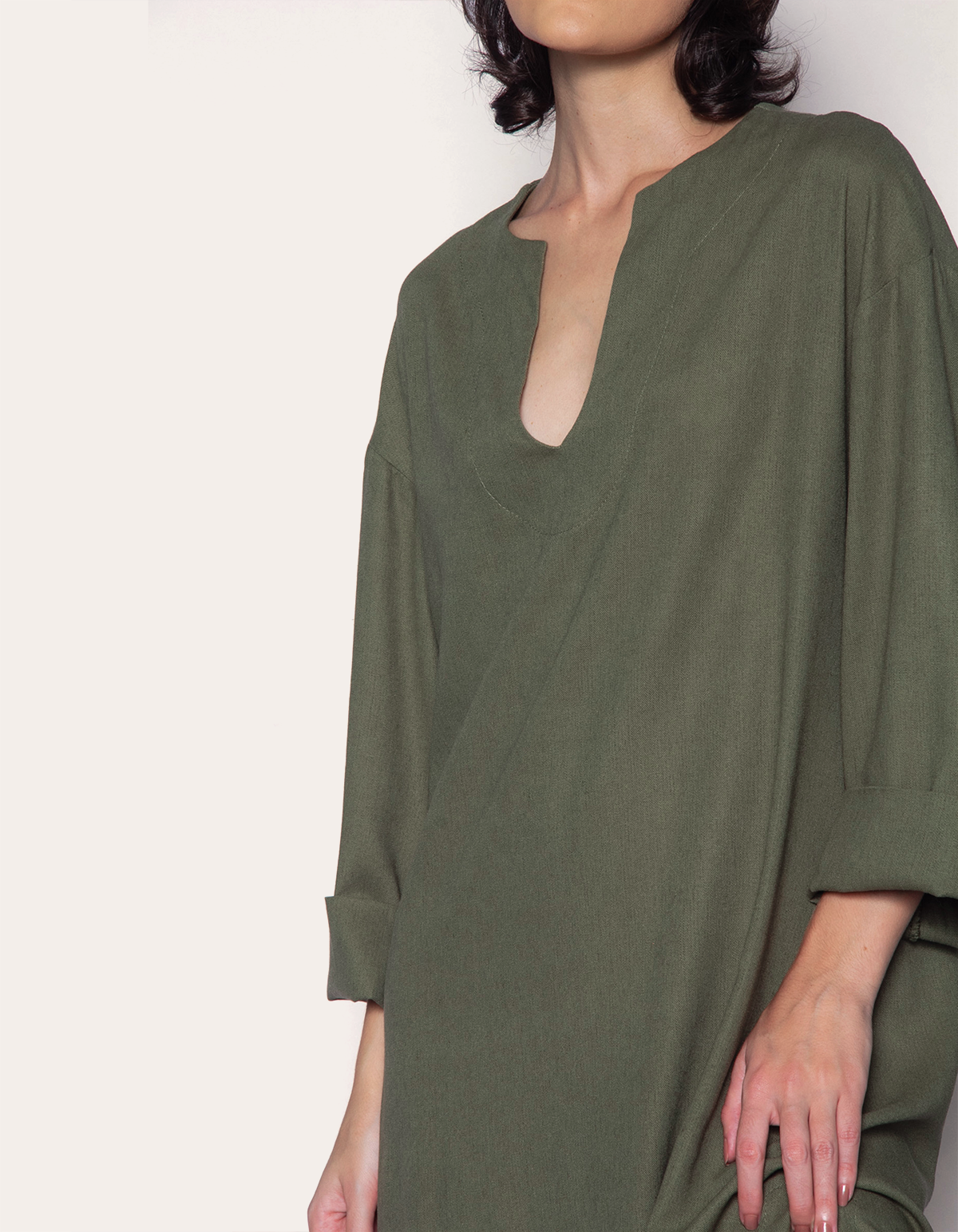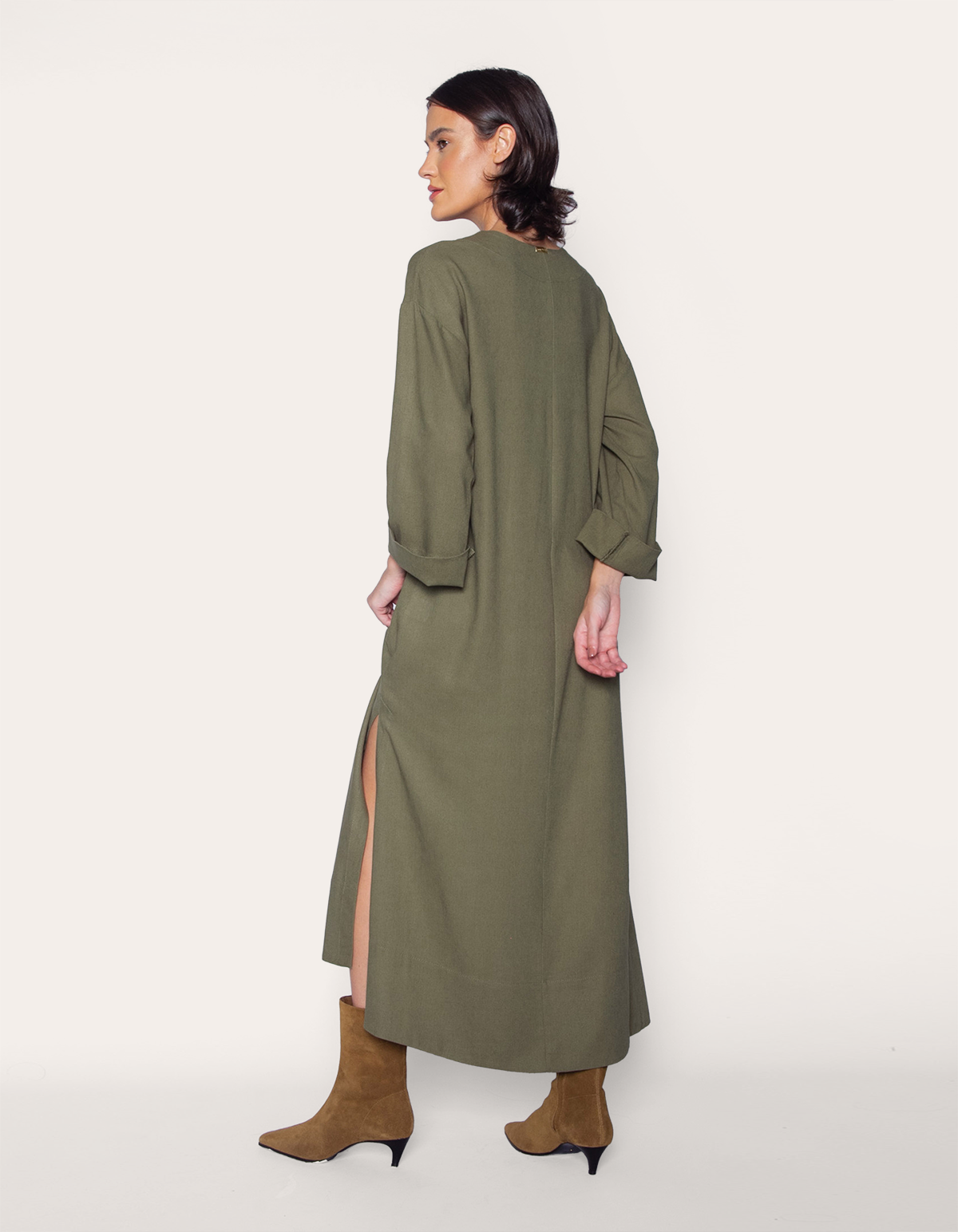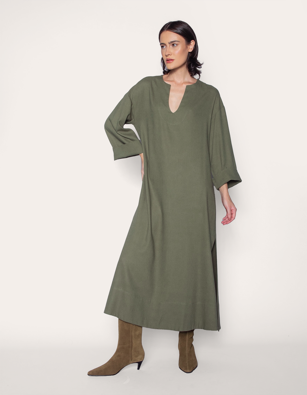 Vestido longo, manga longa, modelagem ampla tipo kaftan e decote v. modelo que proporciona a sensação de liberdade, sem perder o conforto e a sofisticação. com um estilo romântico, delicado e feminino, ele é versátil e atemporal, além de ser democrático, todas as mulheres podem usá-lo, independentemente de biotipo ou estilo.