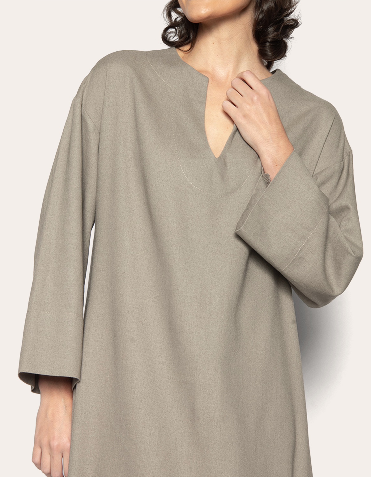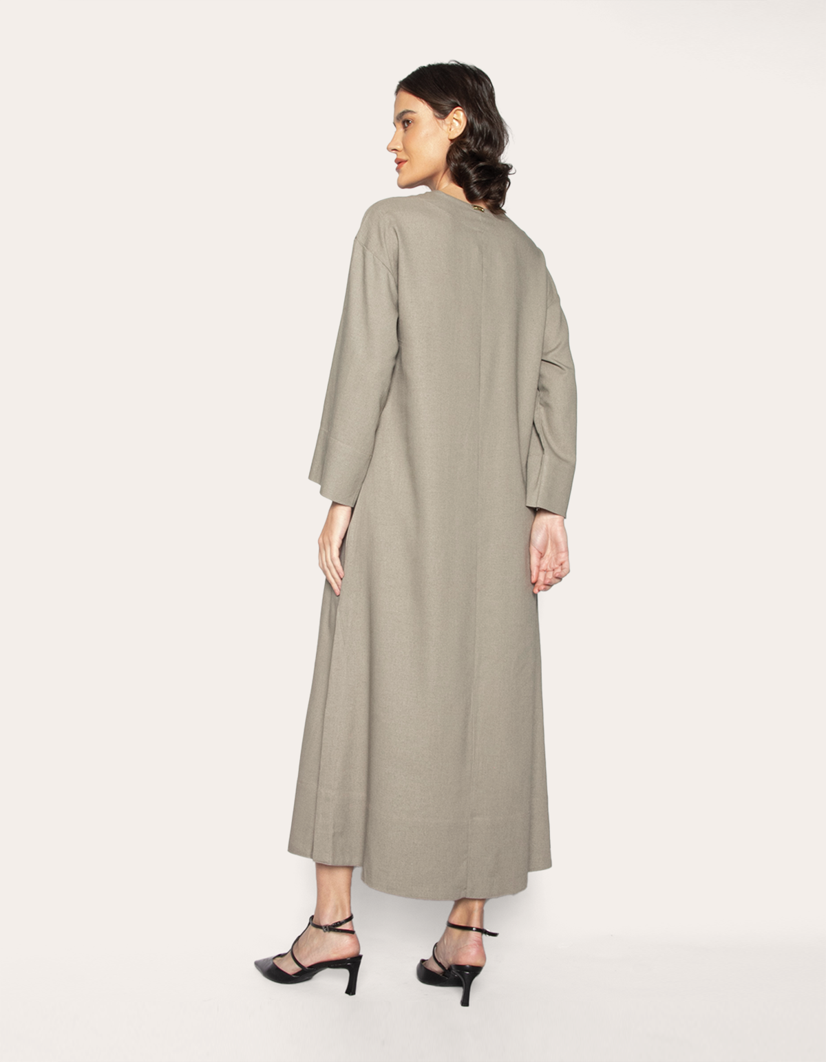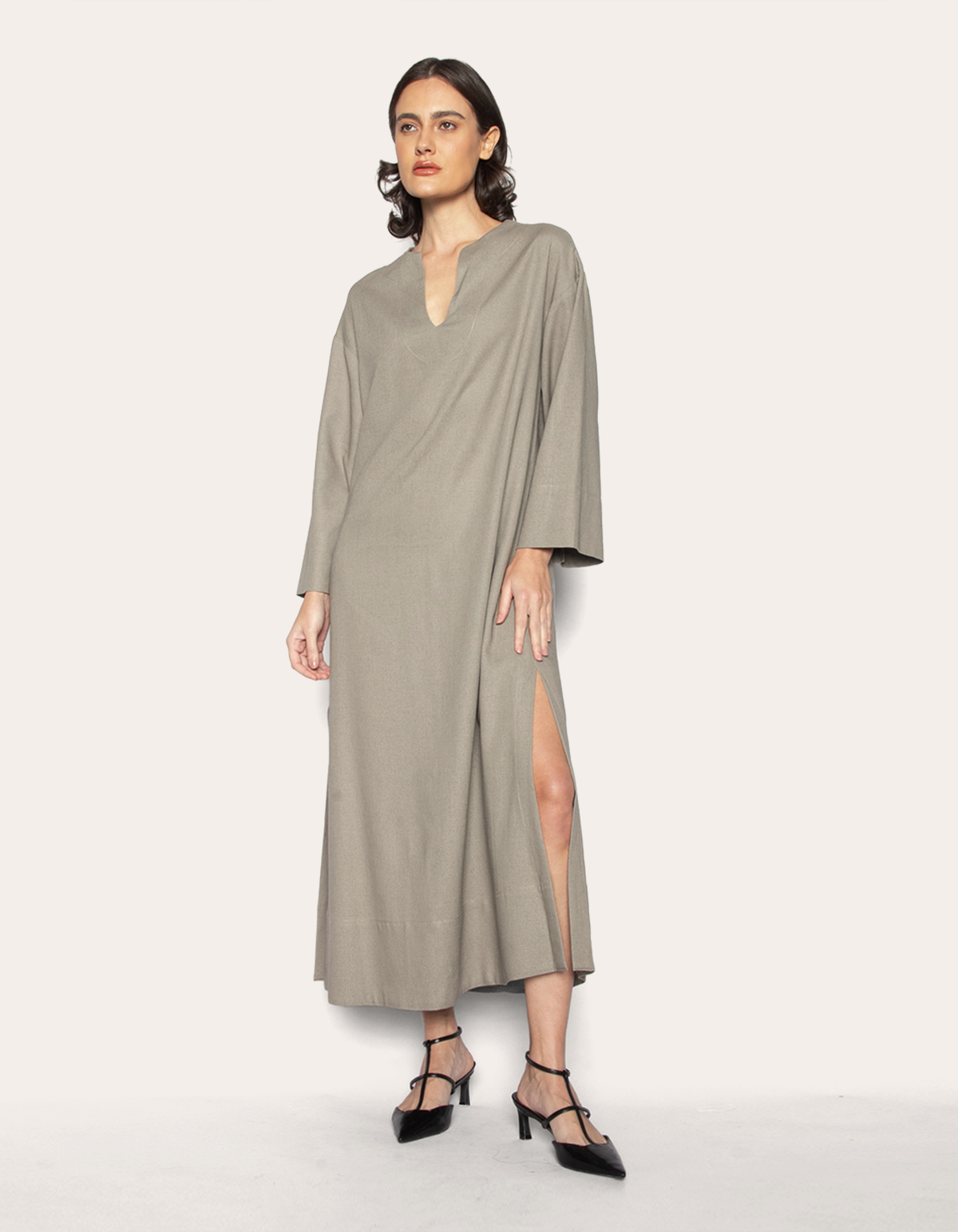 Vestido longo, manga longa, modelagem ampla tipo kaftan e decote v. modelo que proporciona a sensação de liberdade, sem perder o conforto e a sofisticação. com um estilo romântico, delicado e feminino, ele é versátil e atemporal, além de ser democrático, todas as mulheres podem usá-lo, independentemente de biotipo ou estilo.