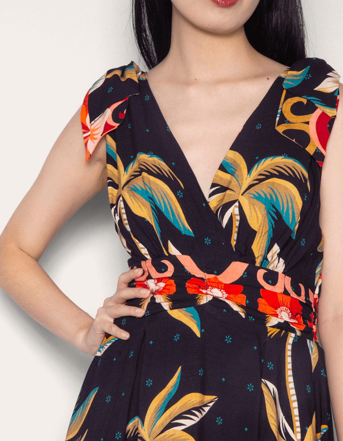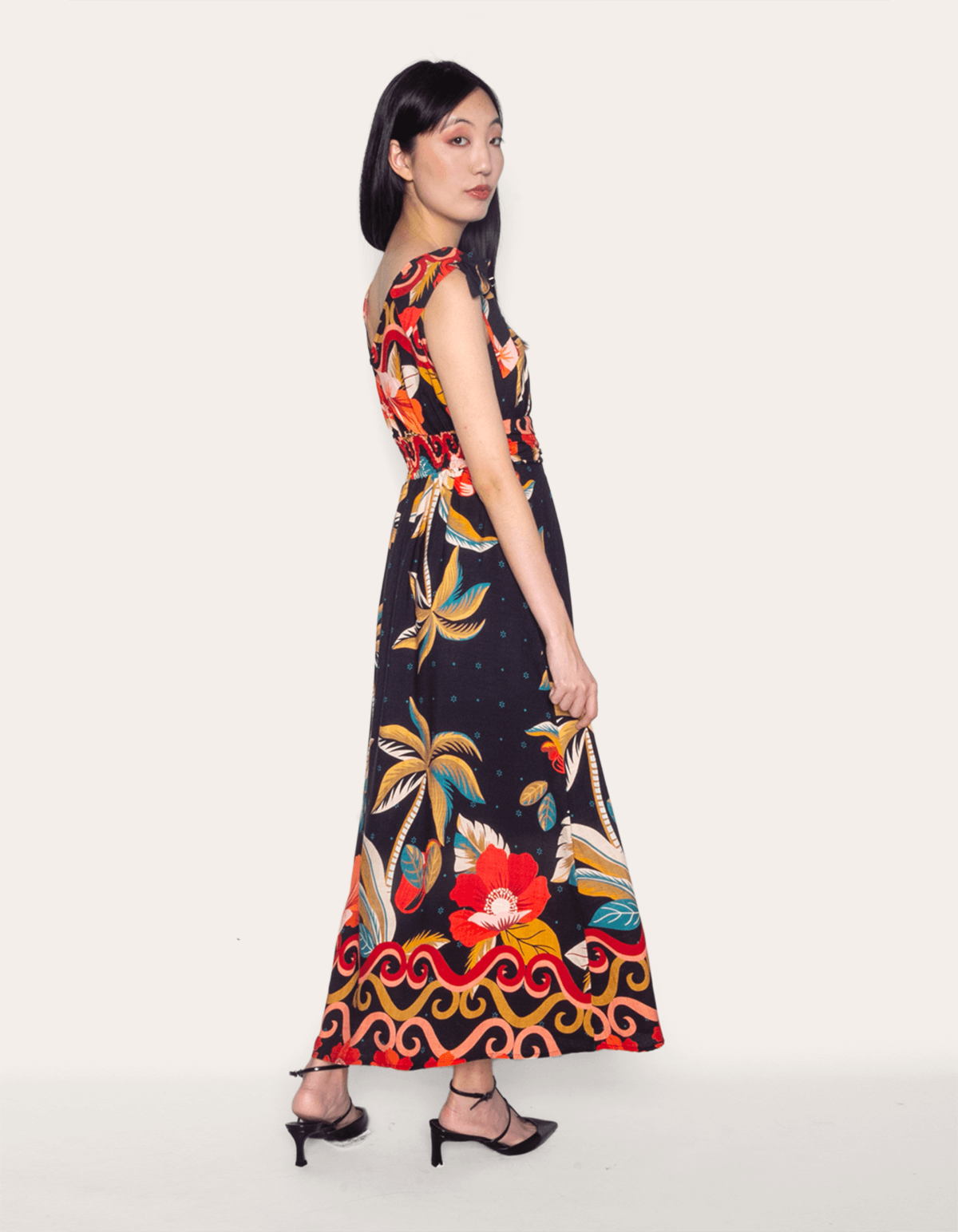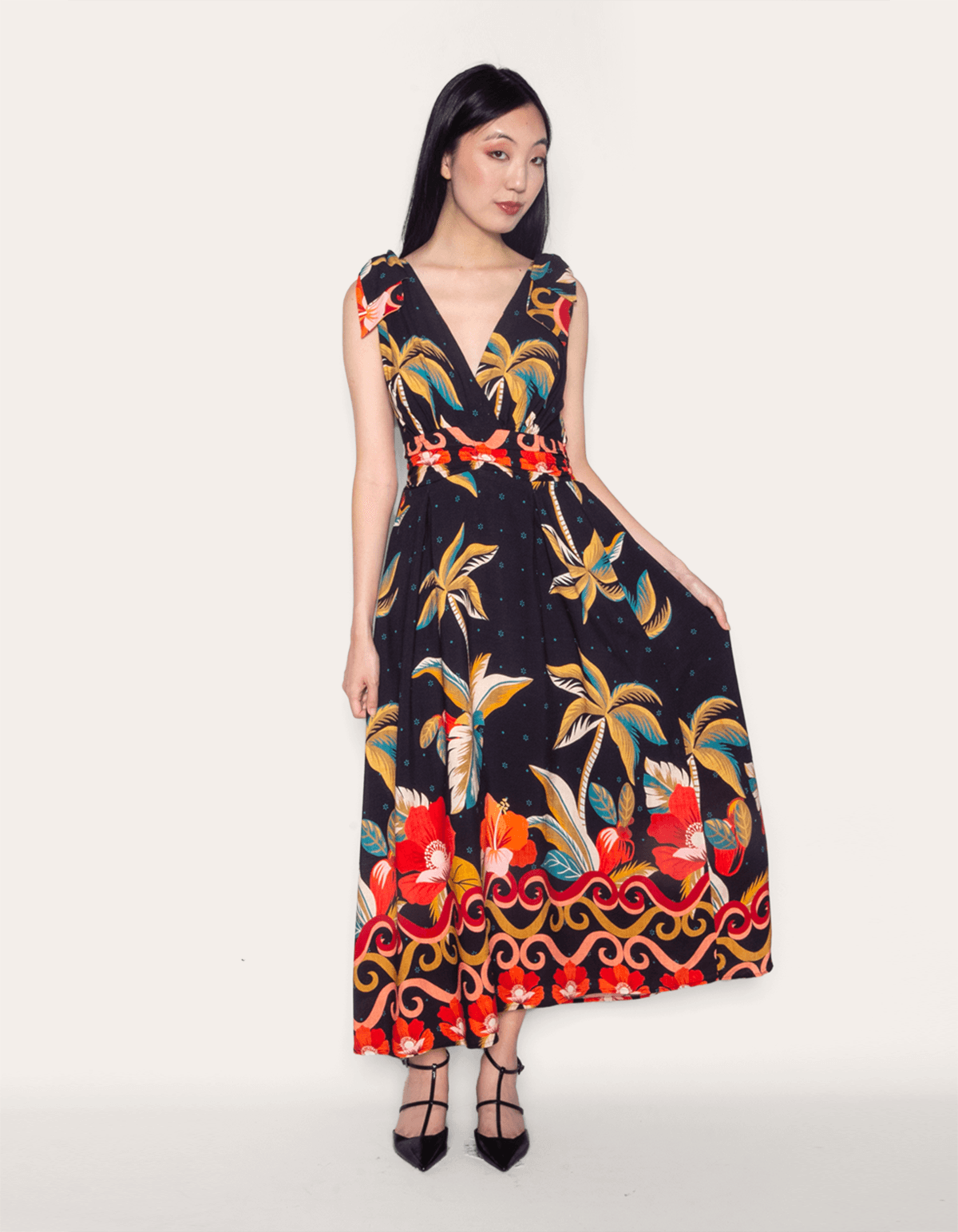 Vestido longo decote v transpassado, possui bojo e alças com detalhe de laço. detalhe franzido na cintura e lastex nas costas. as peças estampadas são marcantes e são para quem tem personalidade, além de dar um up na produção. aposte!