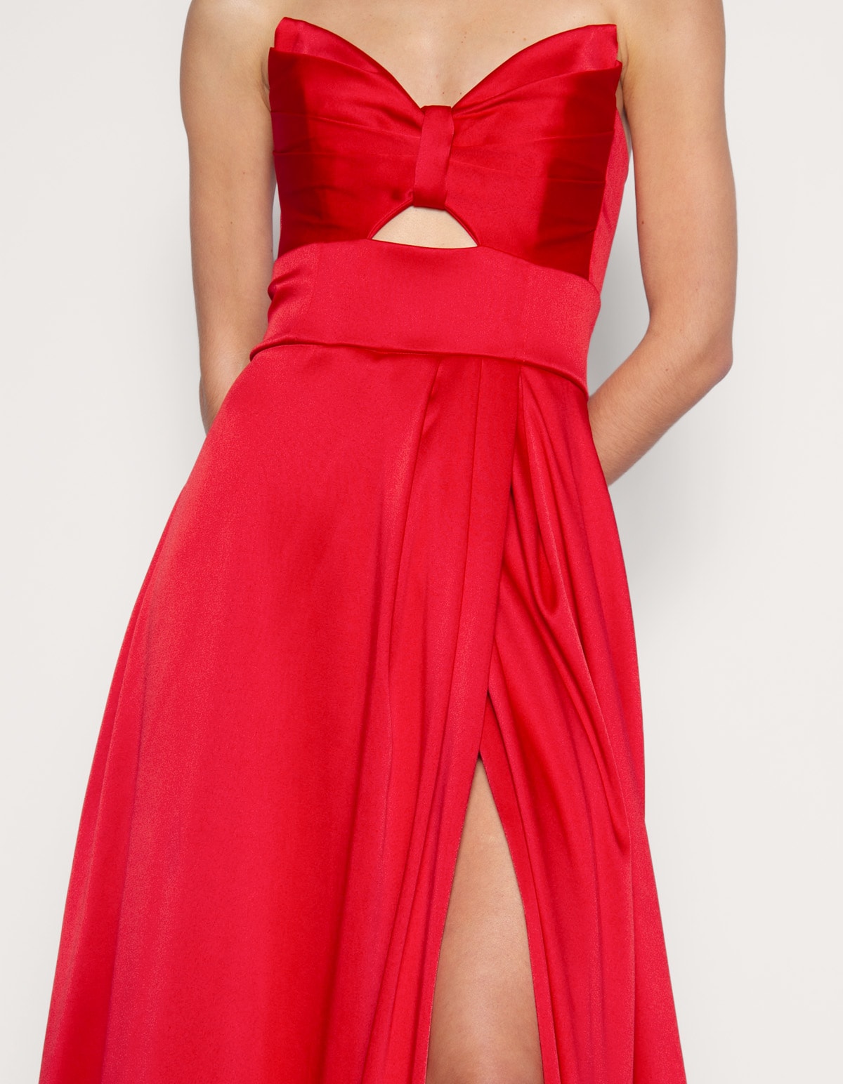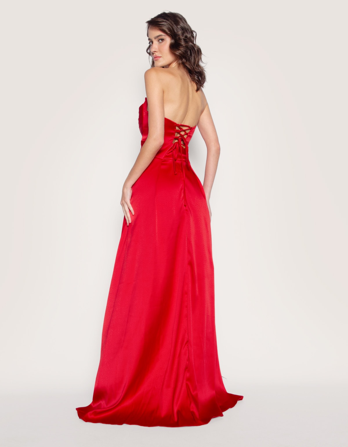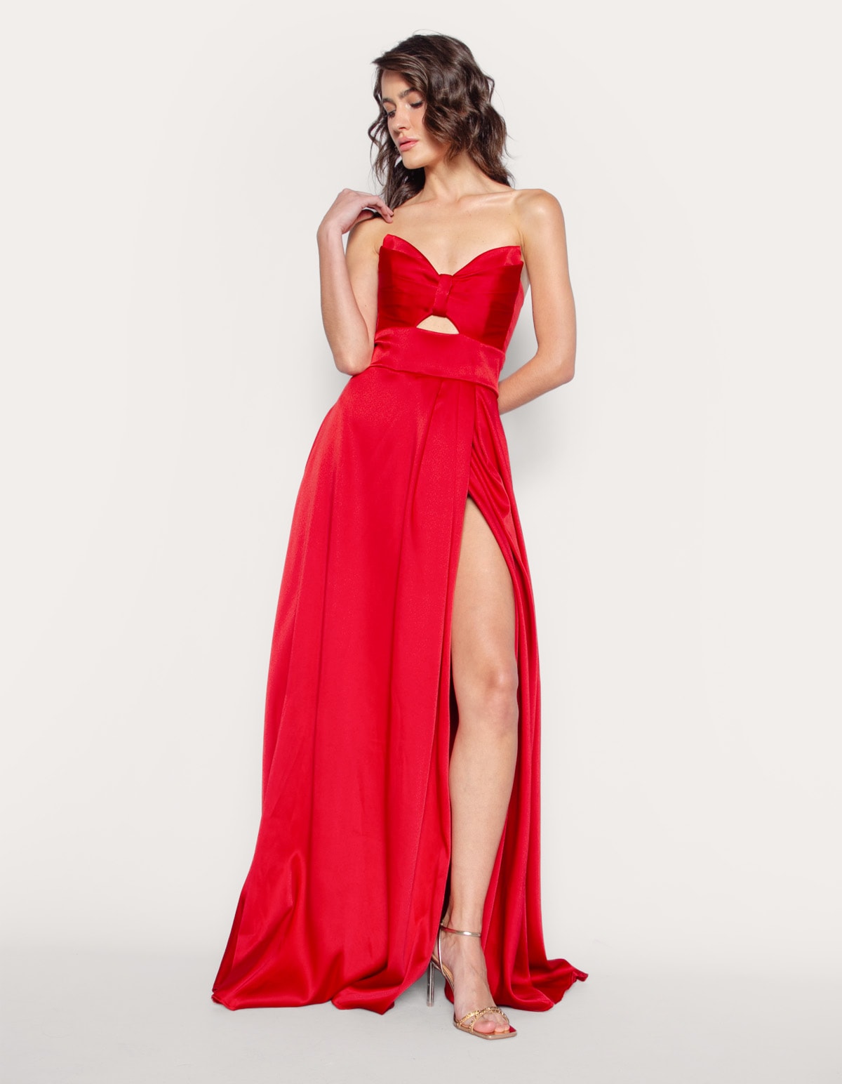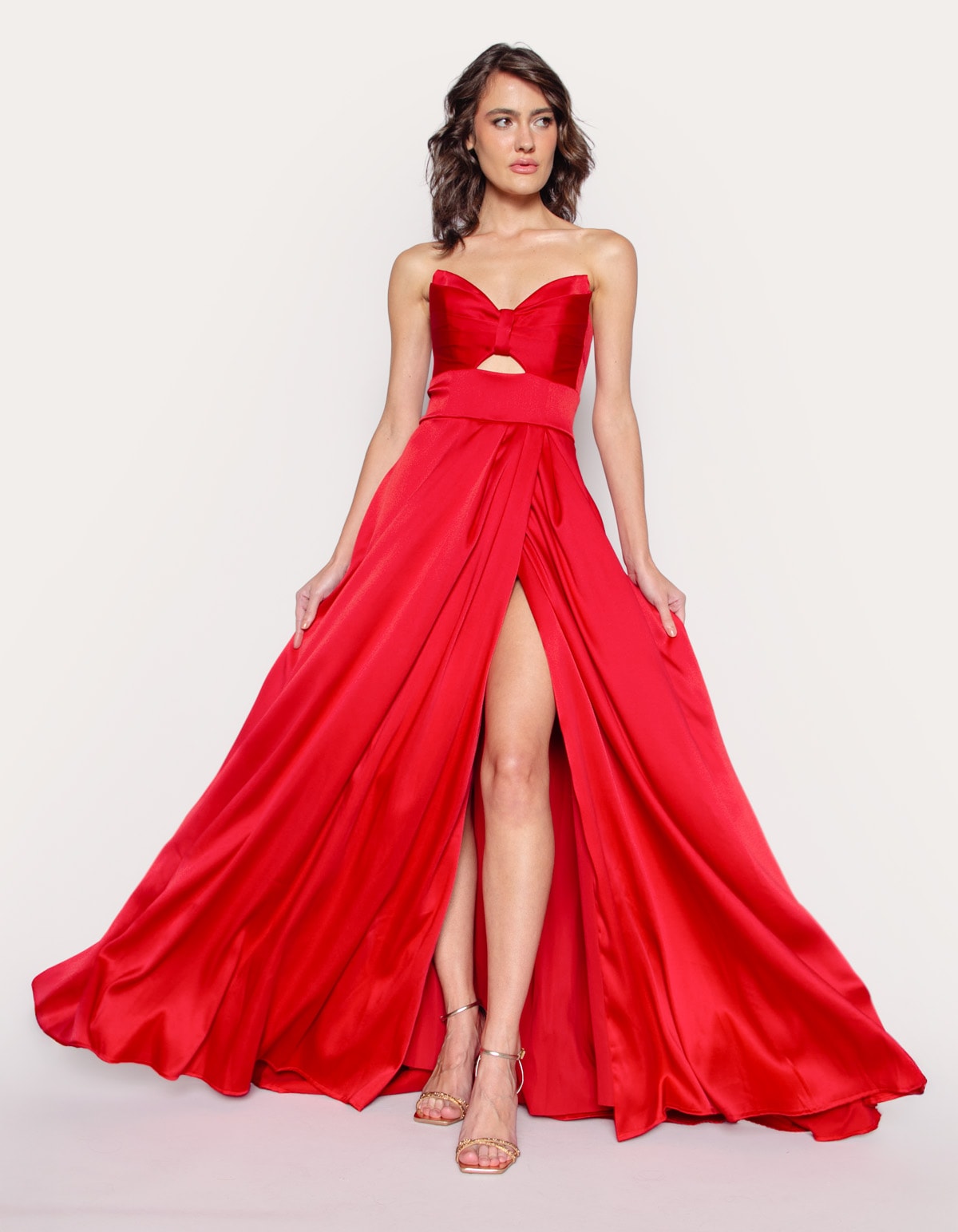 Vestido de festa longo, esse modelo traz uma dose de sofisticação, sendo perfeito para eventos especiais e ocasiões formais. o decote tomara que caia é a definição de elegância atemporal. a aplicação do laço no busto proporciona um toque sofisticado, com bojo para um visual confortável, fechamento em zíper e amarração nas costas mantem a elegância do design. esse modelo é o destino definitivo para mulheres que buscam glamour, elegância e um toque de magia em cada evento especial.