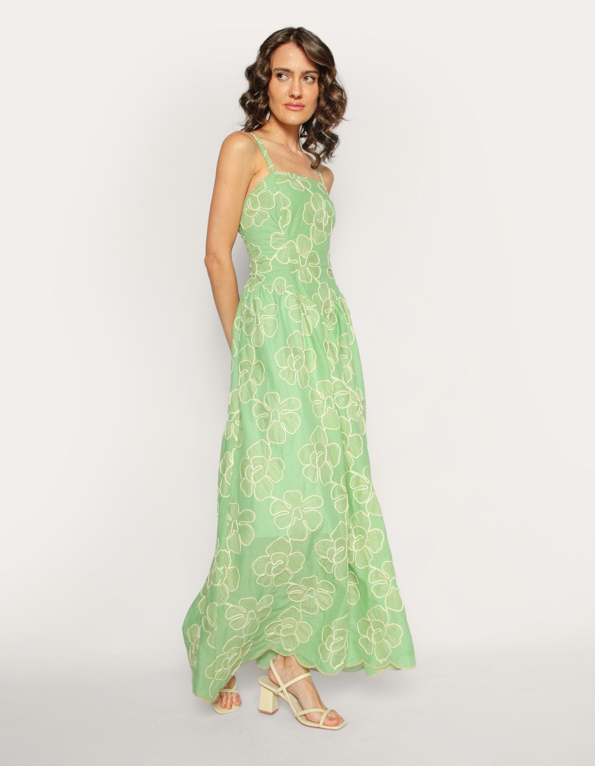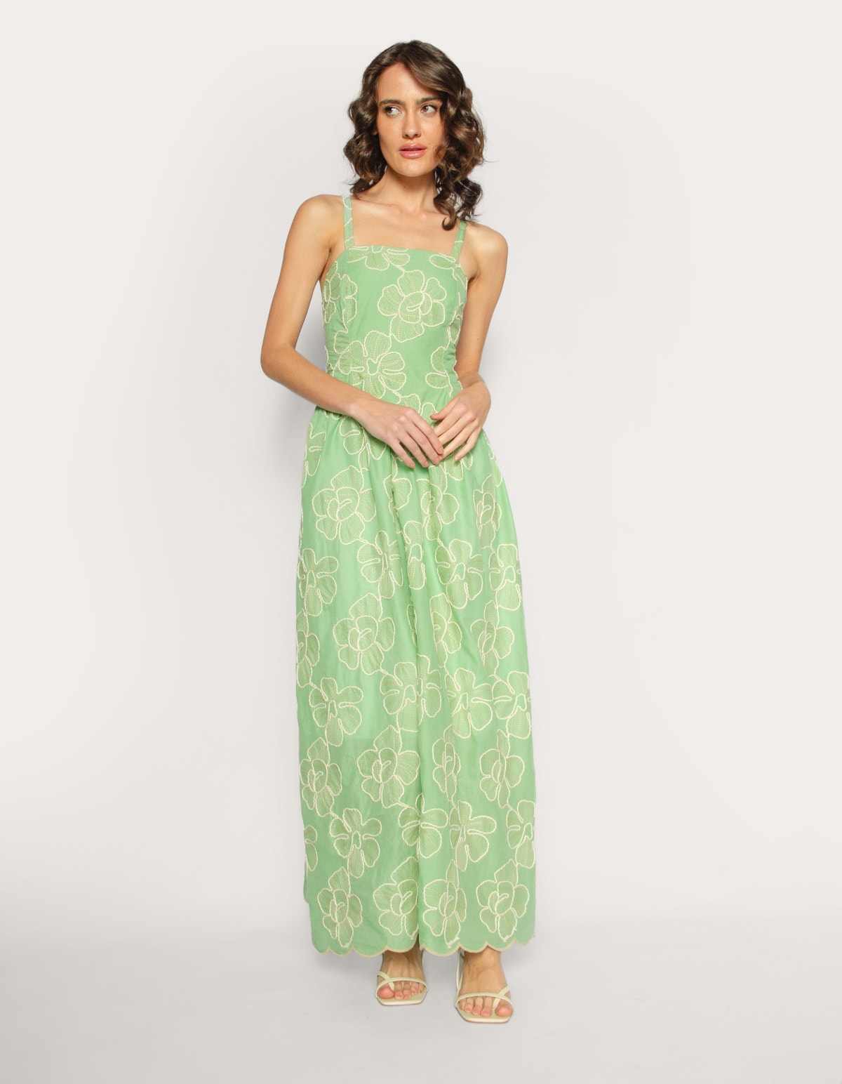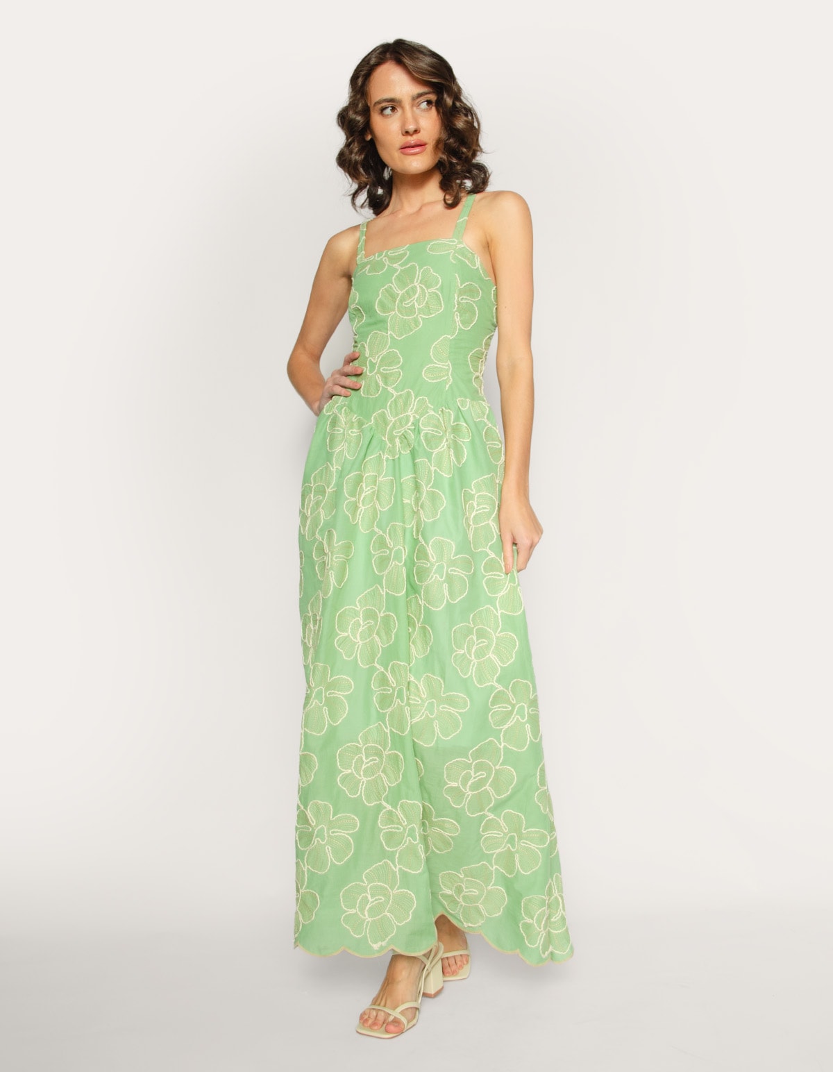 Vestido longo em laise bordado contrastante, decote reto, sustentado por alças finas, corpete ajustado ao corpo, cintura marcada, saia em corte evasê de volume moderado. De estilo vintage , remetendo a uma estética clássica e primaveril.