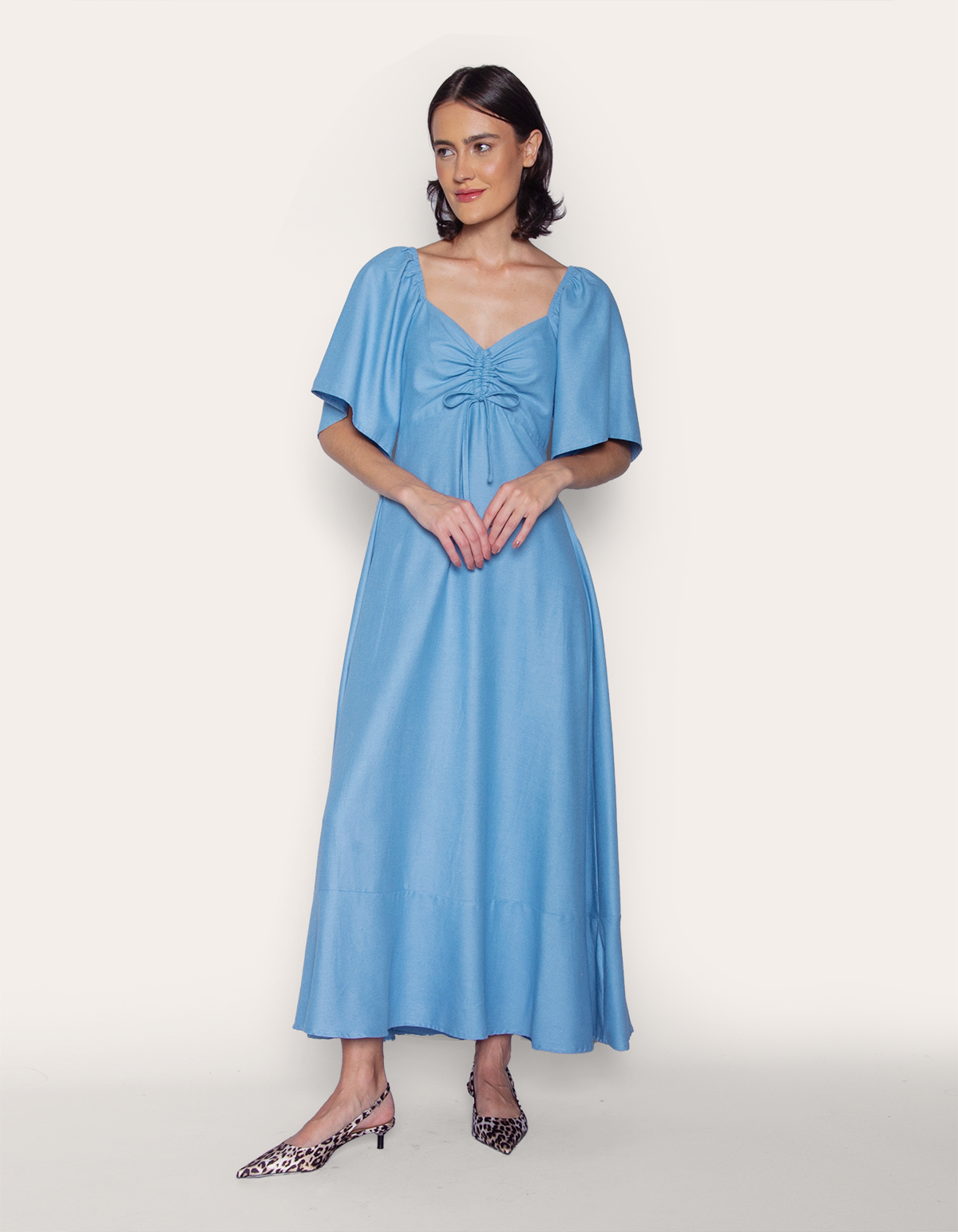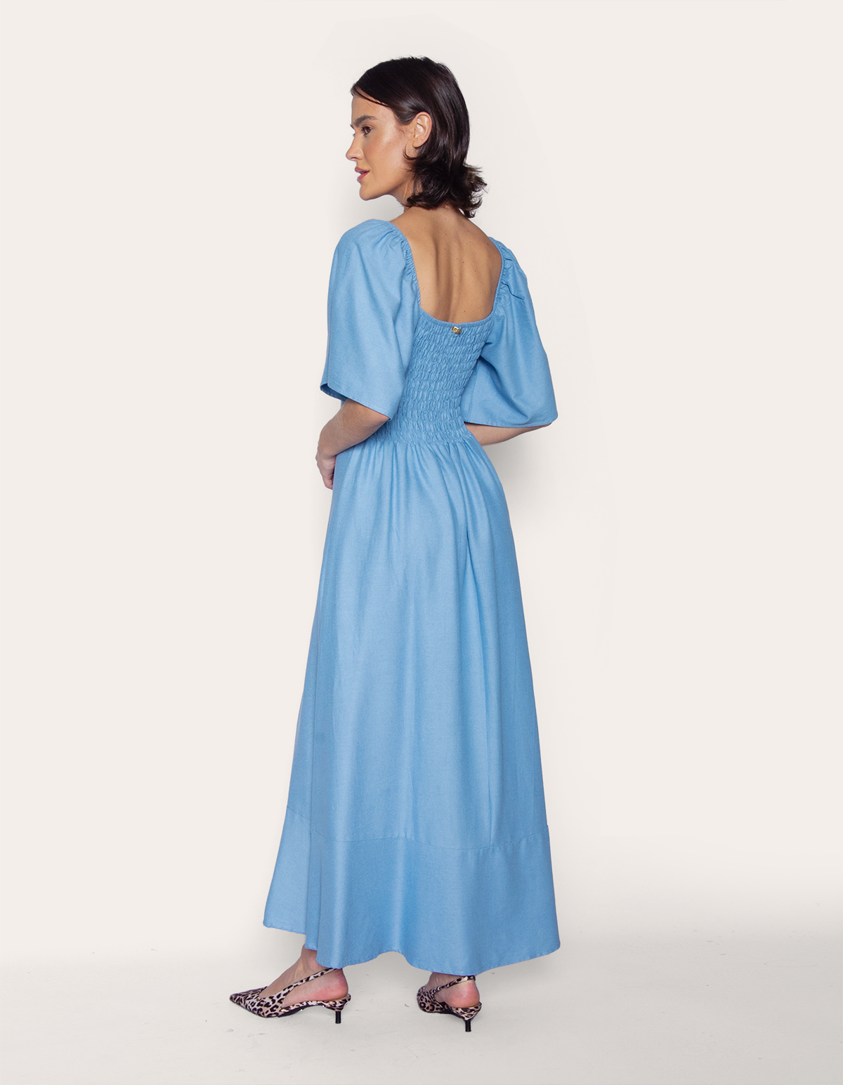 Vestido longo manga godê com elástico no ombro é a escolha perfeita para diversas ocasiões. seu tecido de viscolinho proporciona um toque suave à pele. com detalhes no decote para franzir e costas com lastex, ele transita com facilidade entre eventos casuais e festivos, garantindo um visual sofisticado e moderno.