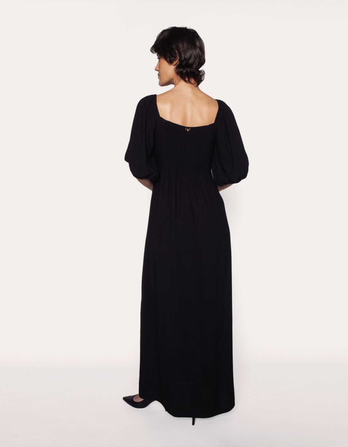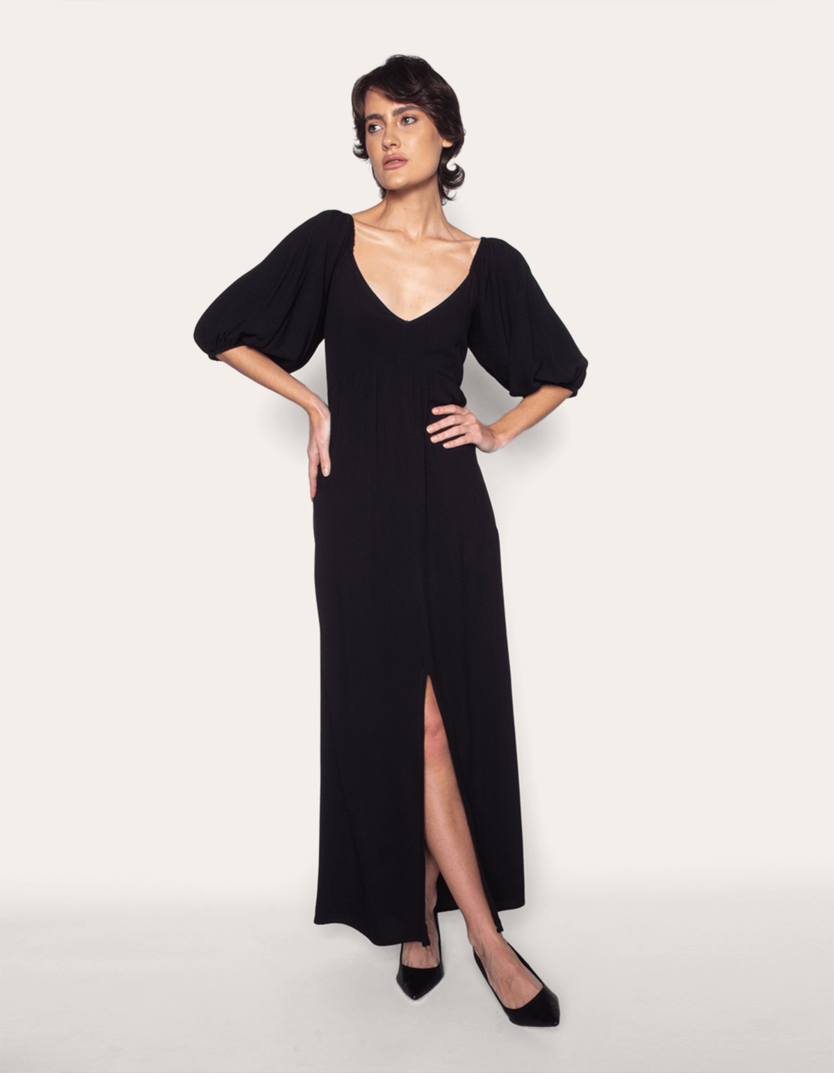 Vestido longo decote v, possui elástico nos ombros e mangas, costas com lastex. perfeito para usar em várias ocasiões.