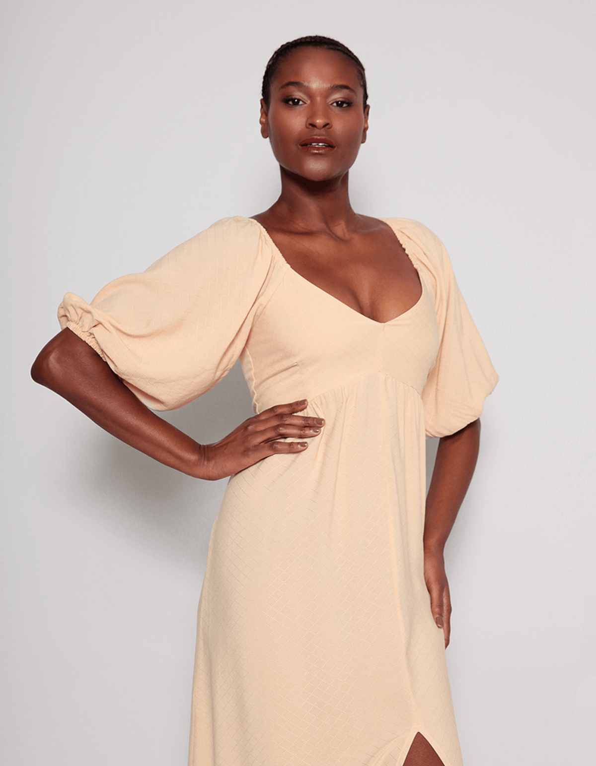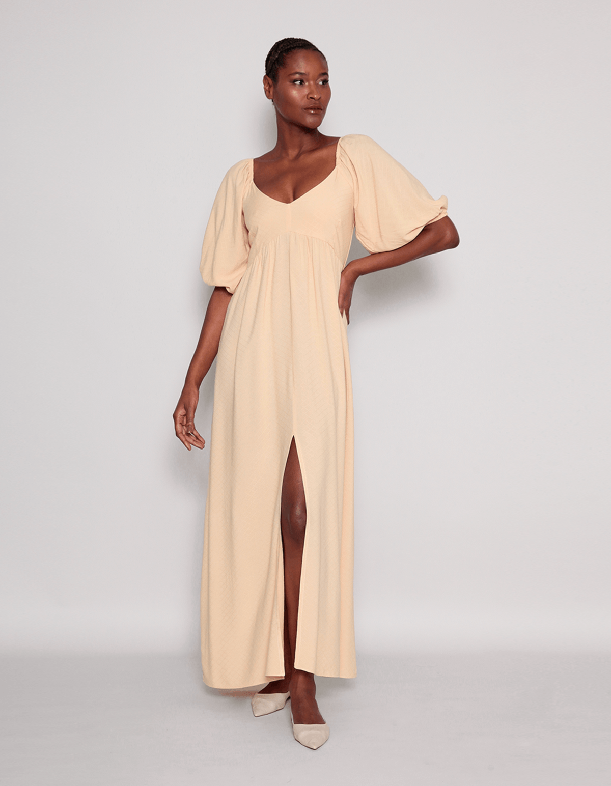 Vestido longo decote v, possui elástico nos ombros e mangas, costas com lastex. perfeito para usar em várias ocasiões.