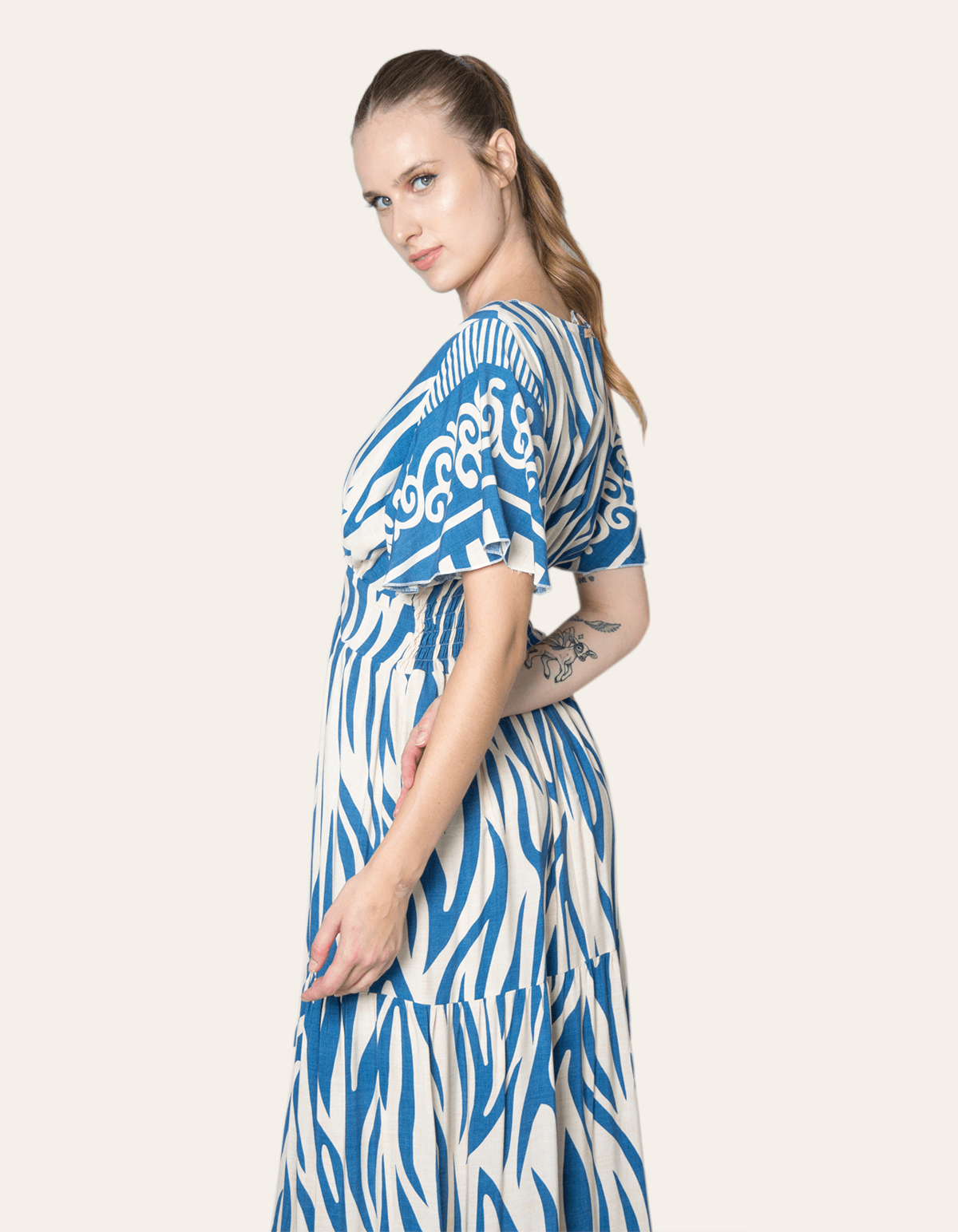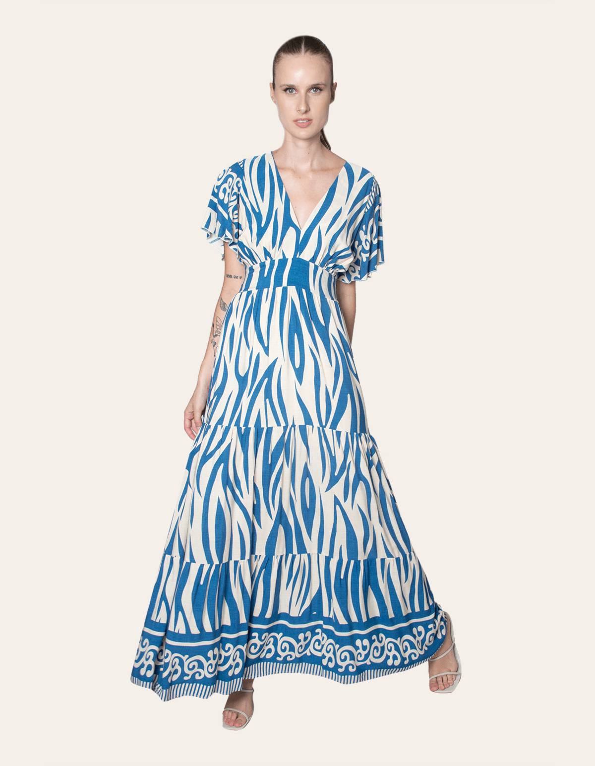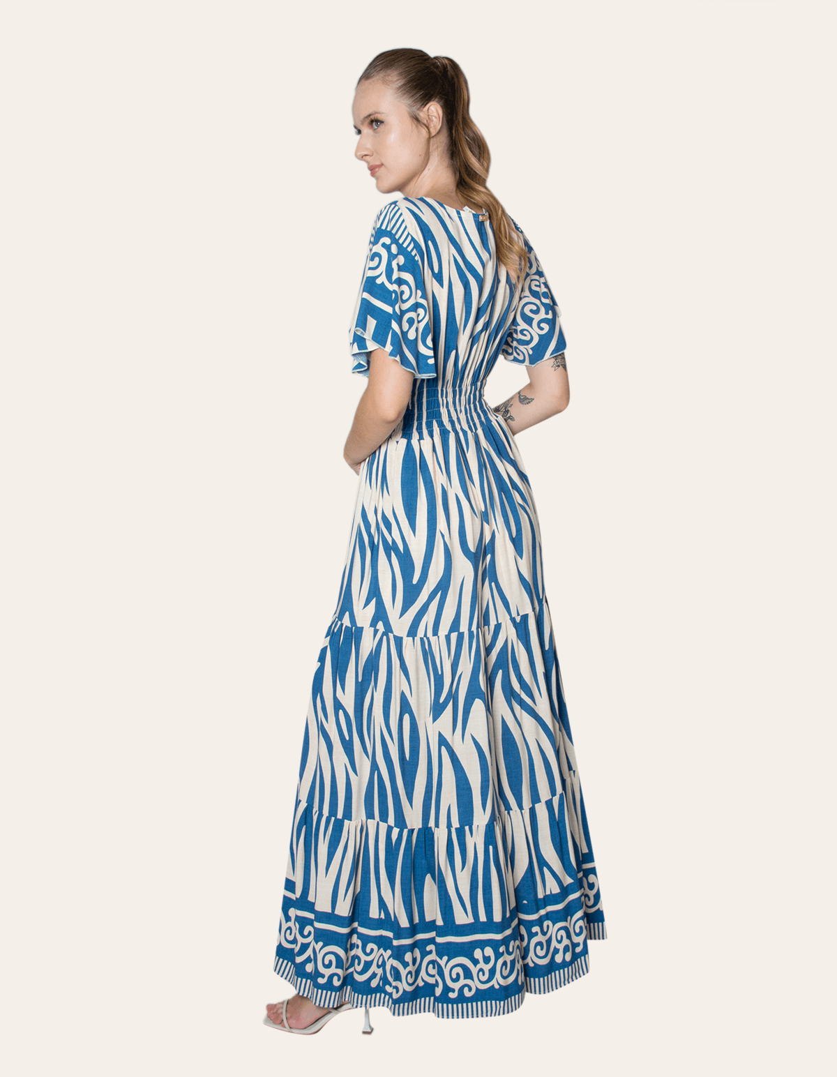 Vestido longo decote v, manga curta godê, atrás na cintura possui lastex para melhor ajuste na cintura e conforto. possui forro. uma peça moderna e atemporal. dica: pode ser usado com: rasteira, tênis, salto alto e jaqueta jeans.
