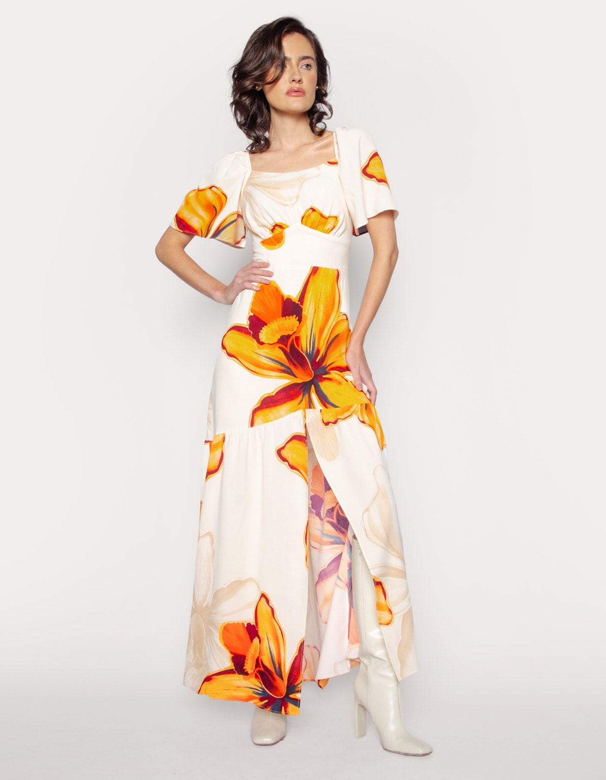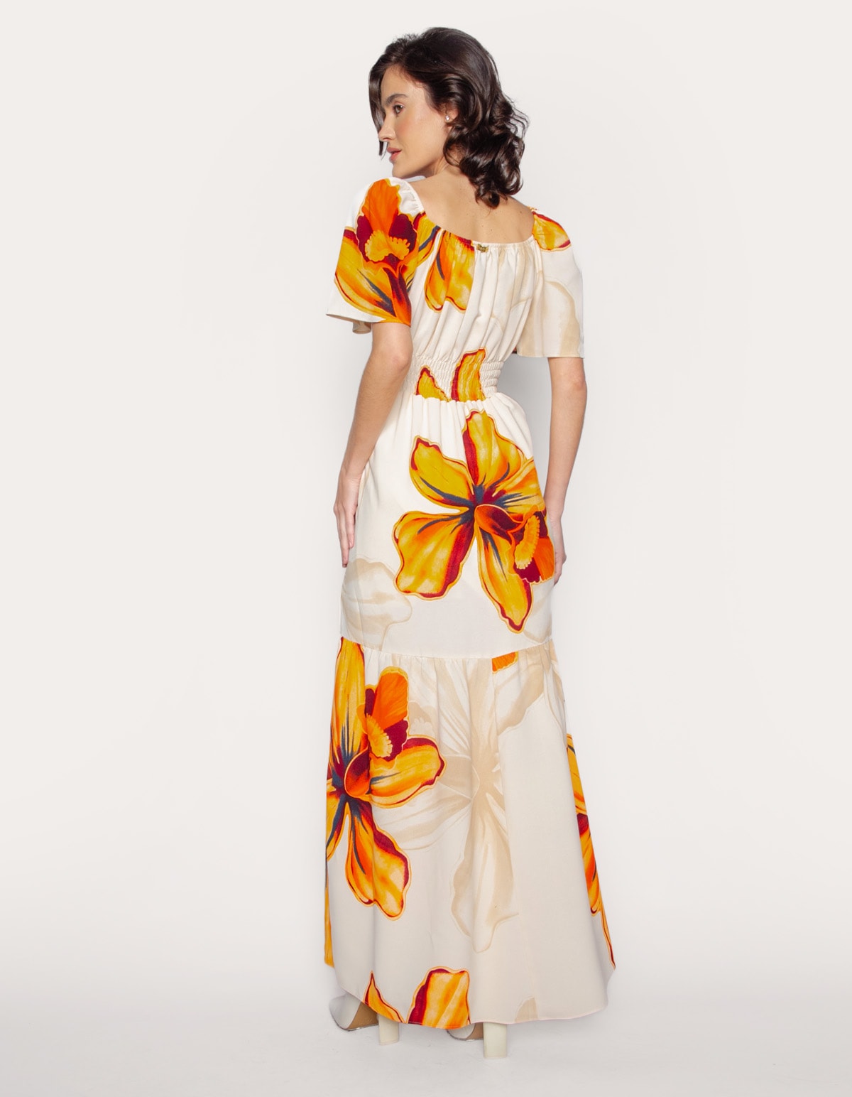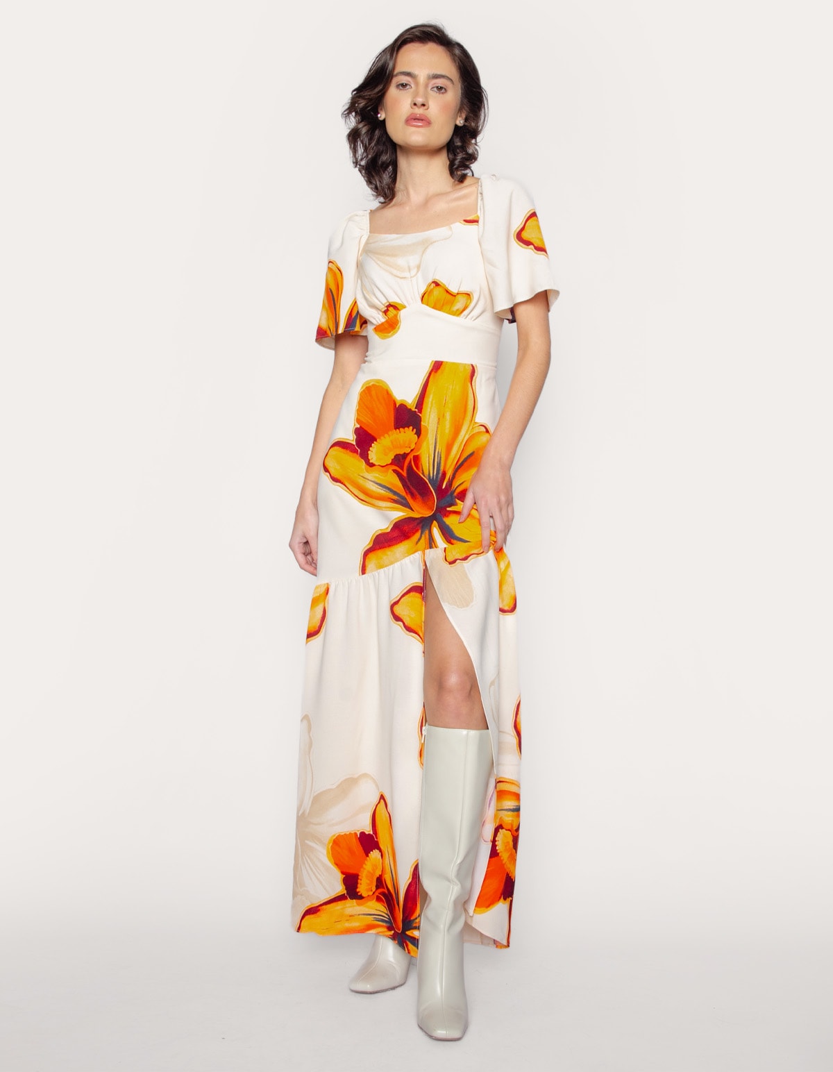Vestido longo estampado com bojo e manga godê. perfeito para um look elegante e moderno.