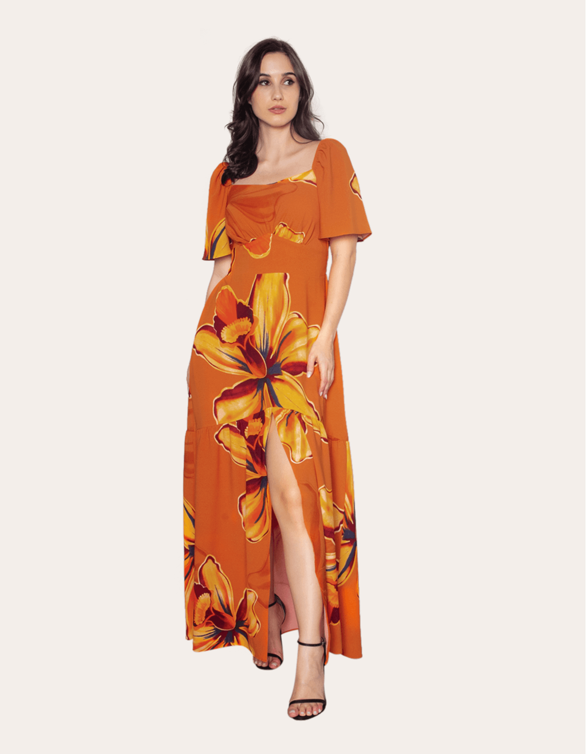 Vestido longo estampado com bojo e manga godê. perfeito para um look elegante e moderno.